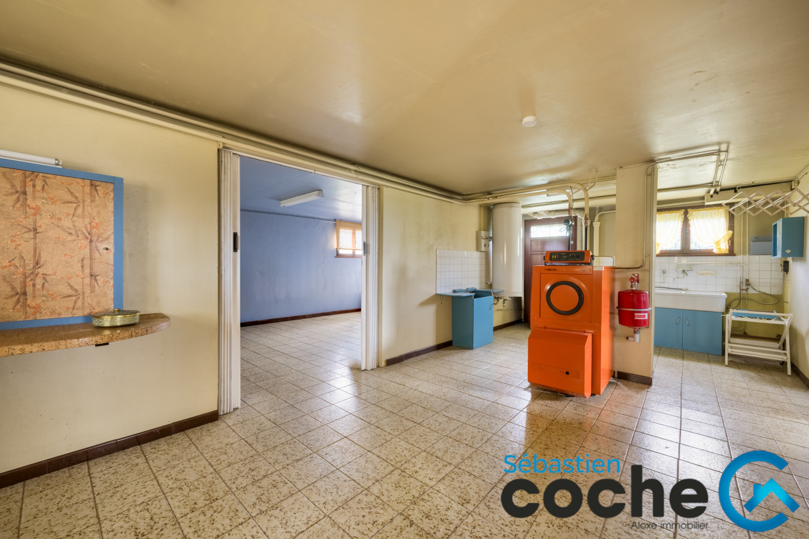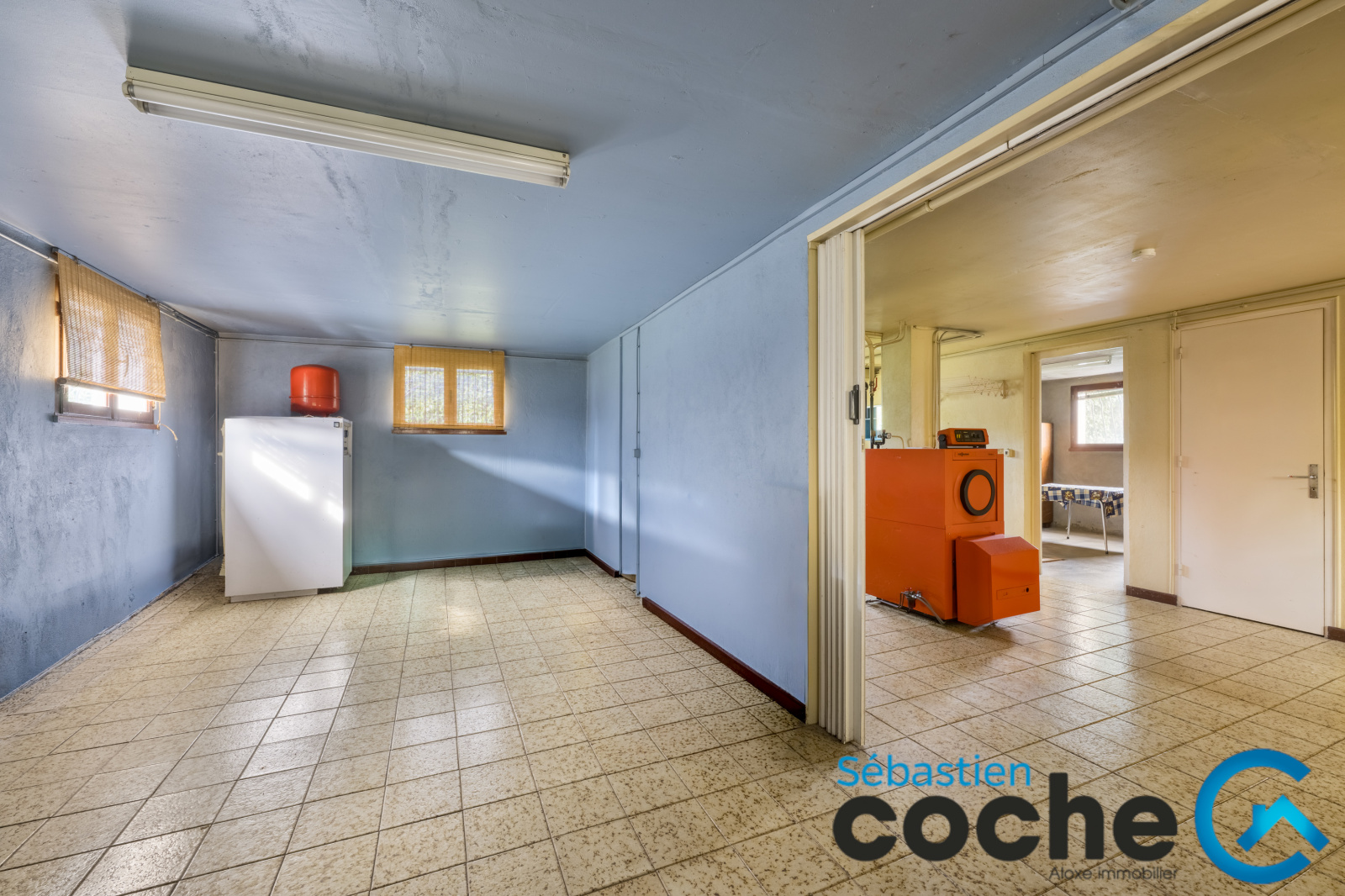 En rez-de-chaussée, avec 2,30 m de hauteur sous plafond, se trouvent aujourd’hui le garage, l’entrée, la chaufferie et une pièce pouvant faire office de cave ou de future chambre, sous réserve de créer une ouverture plus généreuse sur l’extérieur. L’ensemble du “sous-sol”, aujourd’hui aménagé en stationnement et zone technique, pourrait être entièrement repensé et transformé en surface habitable, voire organisé en logement indépendant. La configuration permet ainsi d’envisager la création de deux appartements distincts, selon le projet et les autorisations d’urbanisme.