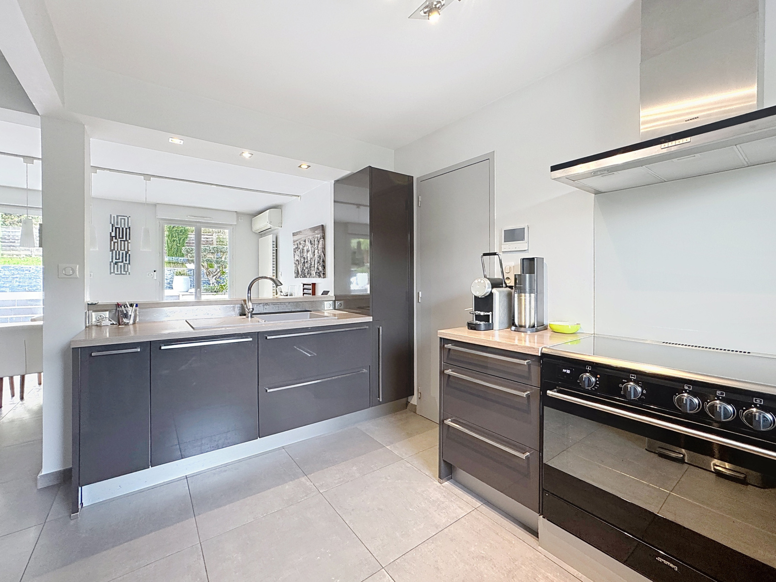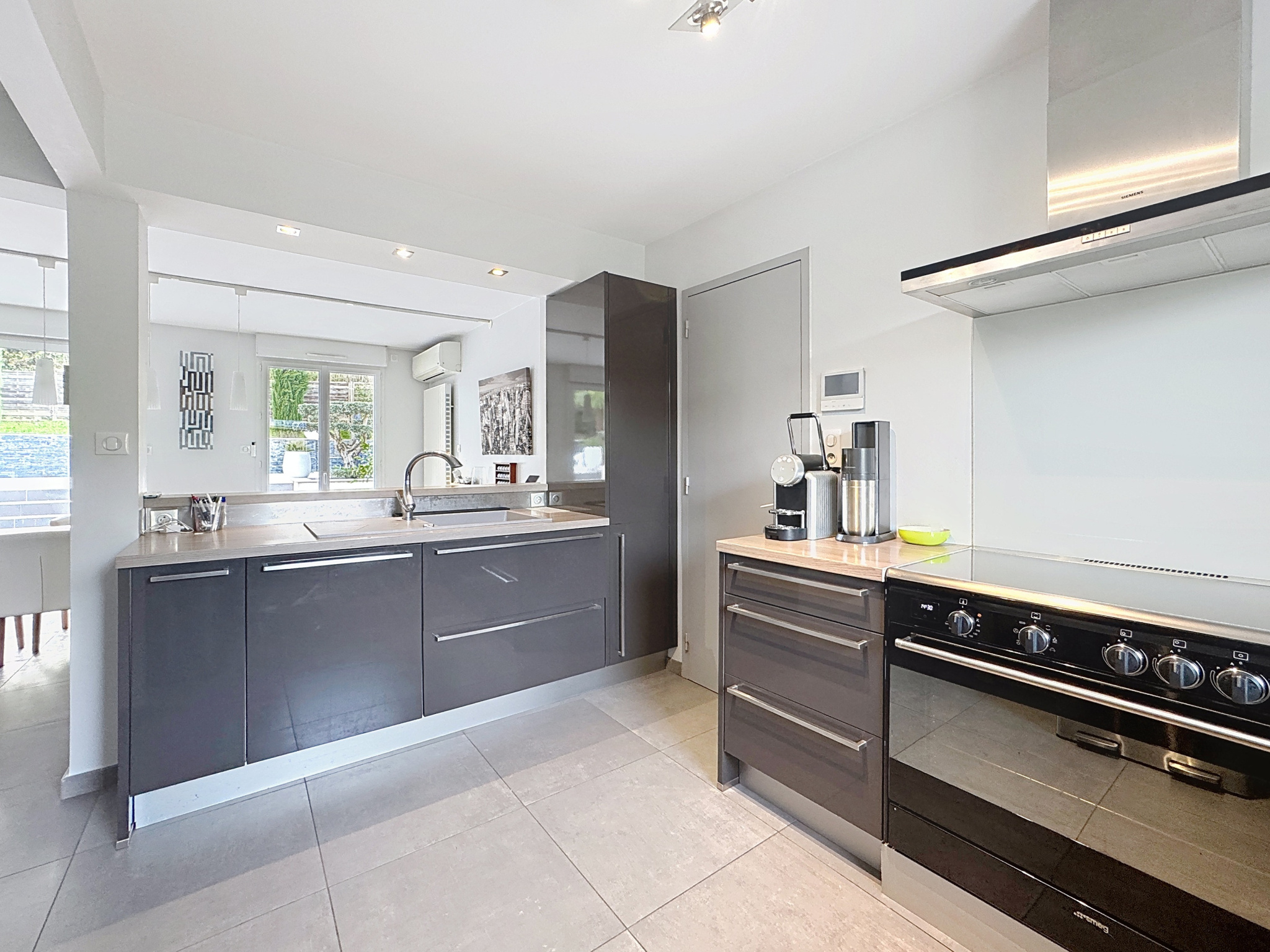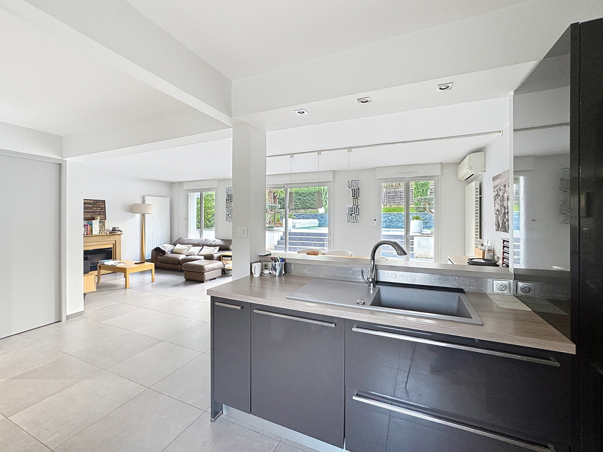 Édifiée dans les années 1970 puis entièrement rénovée en 2010, la maison séduit dès l’entrée par ses volumes généreux et sa luminosité. La vaste pièce de vie s’ouvre sur une cuisine contemporaine entièrement équipée et aménagée, conviviale et élégante, prolongée par un séjour baigné de lumière en après midi. De grandes baies vitrées offrent un accès direct à la terrasse et à la piscine chauffée et sécurisée par un volet roulant extérieur électrique créant une harmonie parfaite entre intérieur et extérieur.