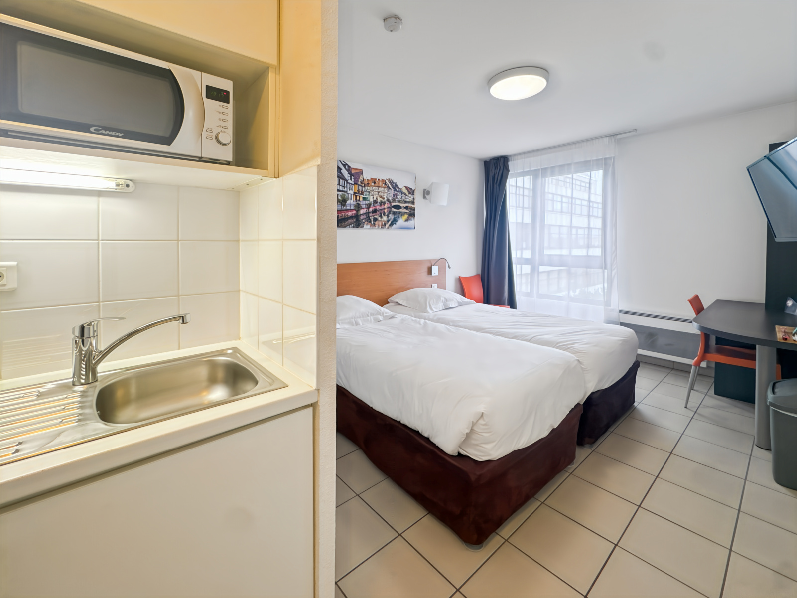 Il se compose d'une entrée, d'une chambre, d'une kitchenette et d'une salle d'eau avec toilettes.