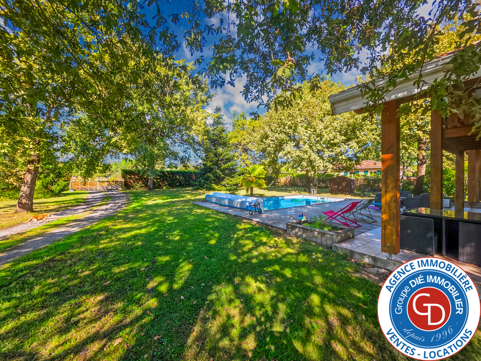 Jardin : Piscine chauffée (liner neuf, système de filtration neuf) avec rideau de protection, portail automatique et grand garage (35 m2) avec salle d'eau