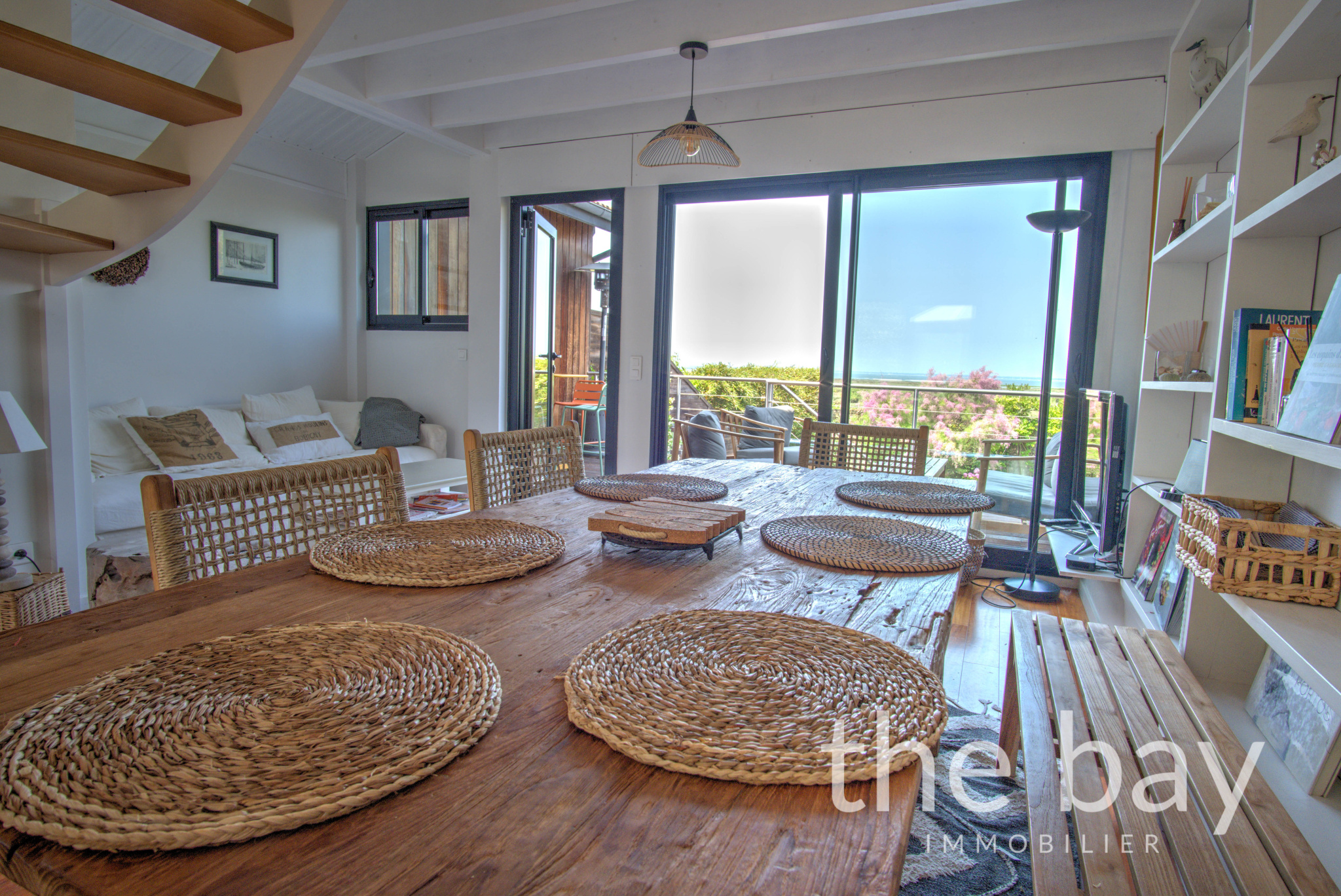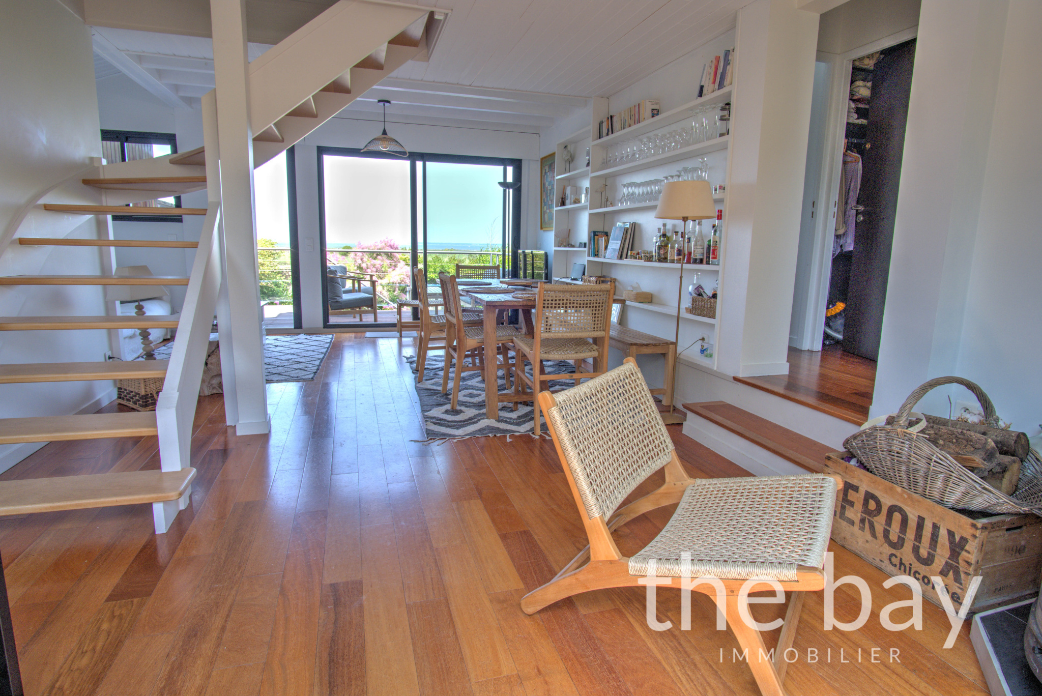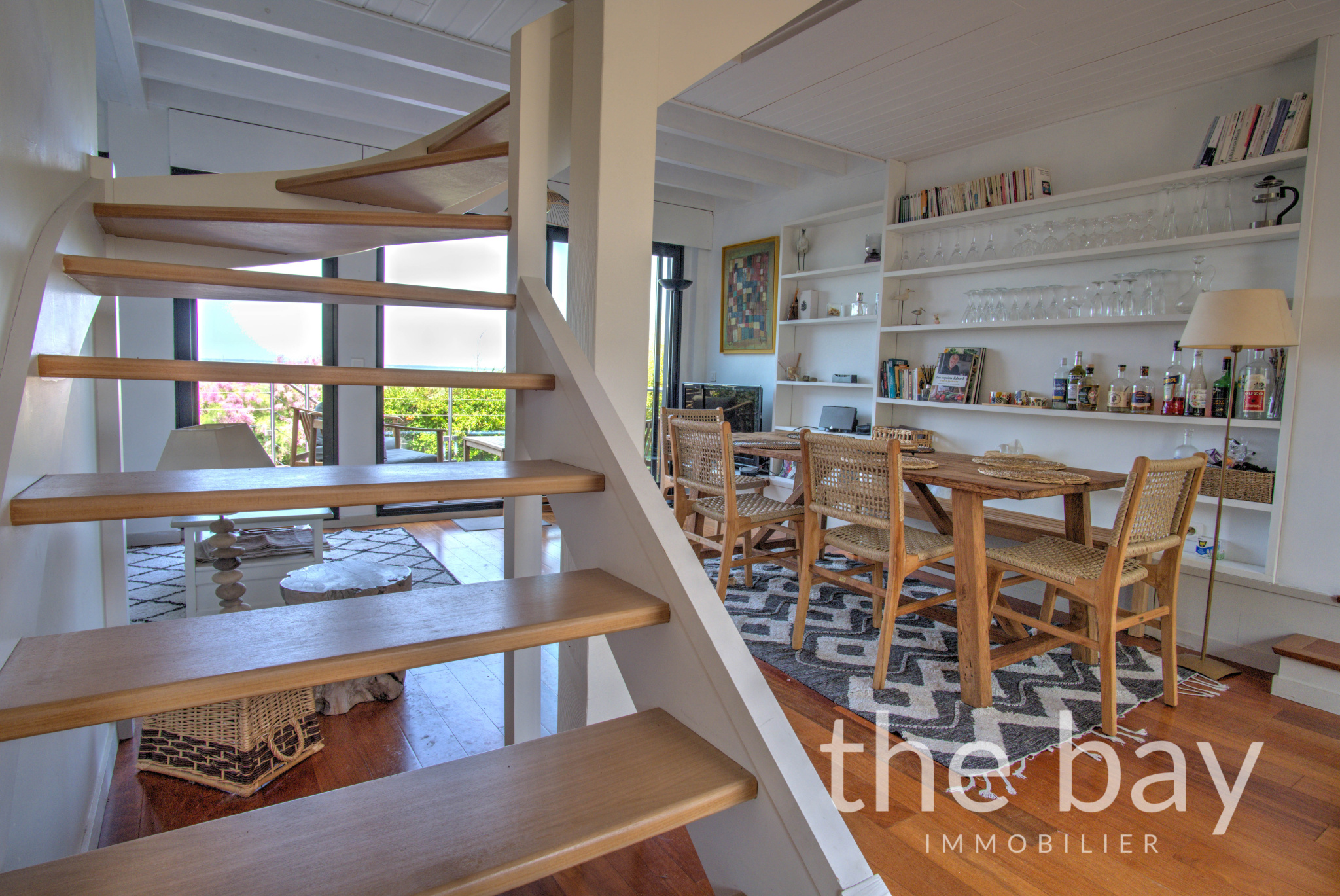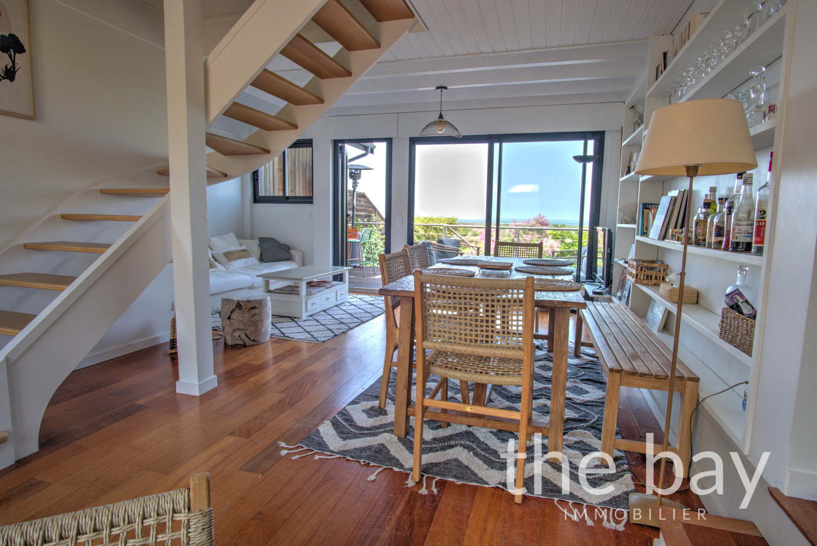 Au premier niveau, le salon-séjour traversant, qui semble flotter au-dessus du Bassin, s'ouvre sur deux terrasses, apportant une luminosité et une sensation d’espace appréciable.