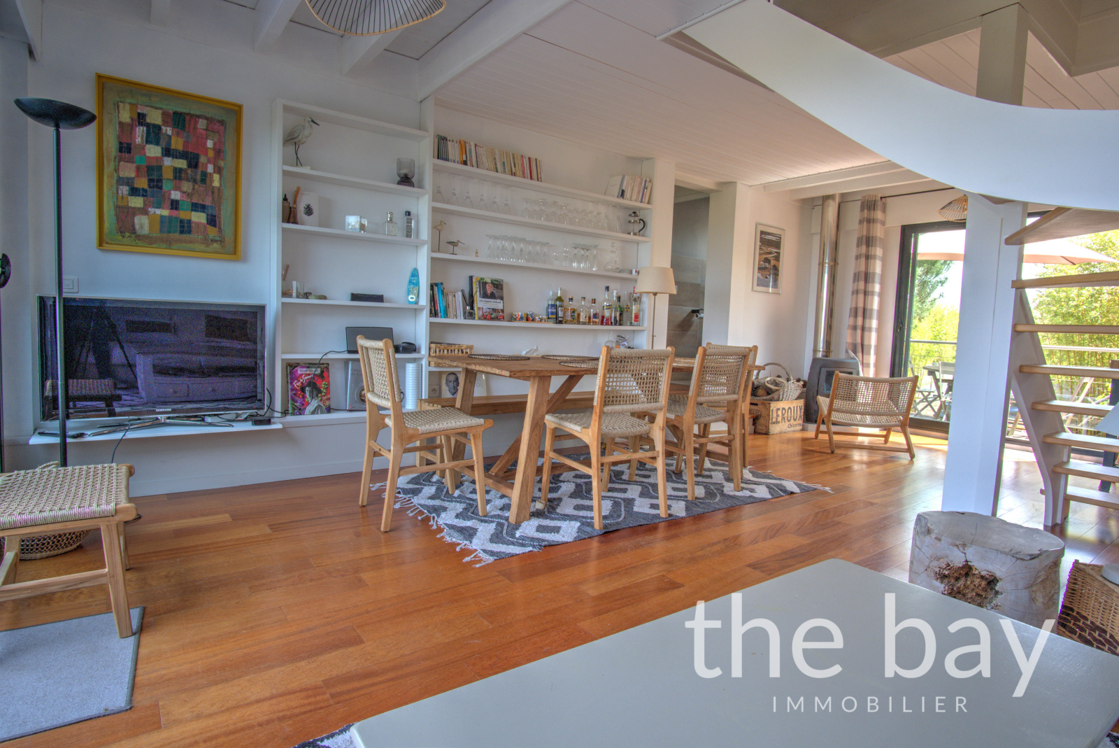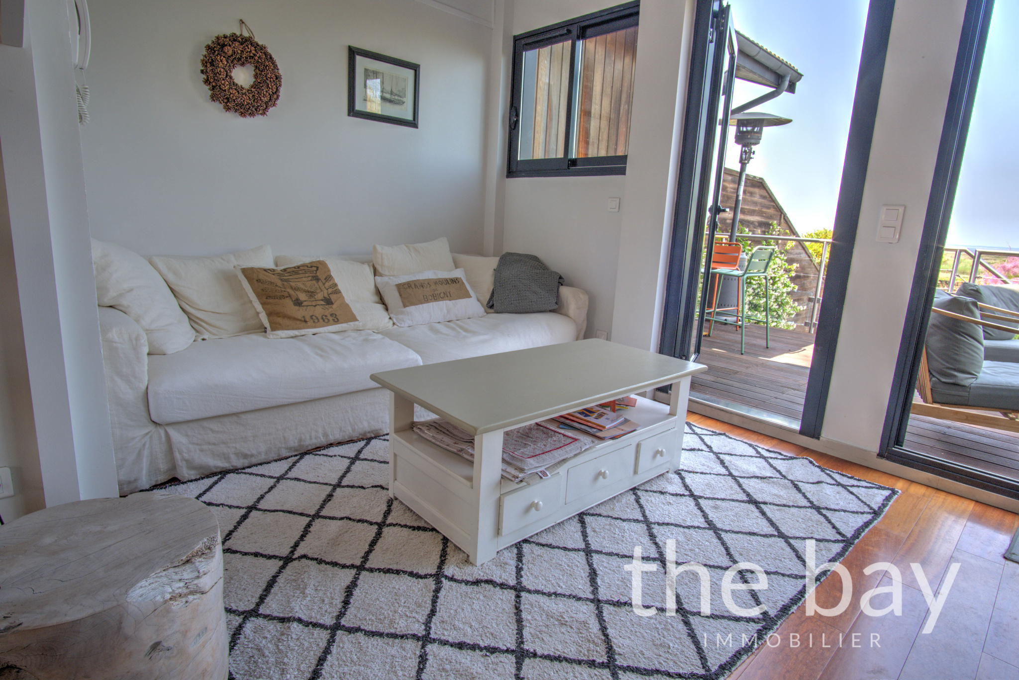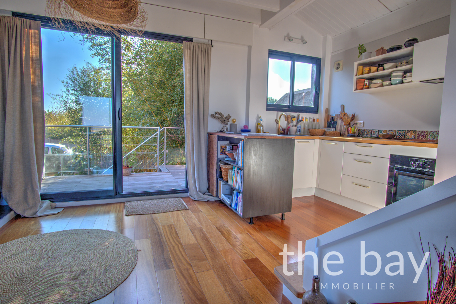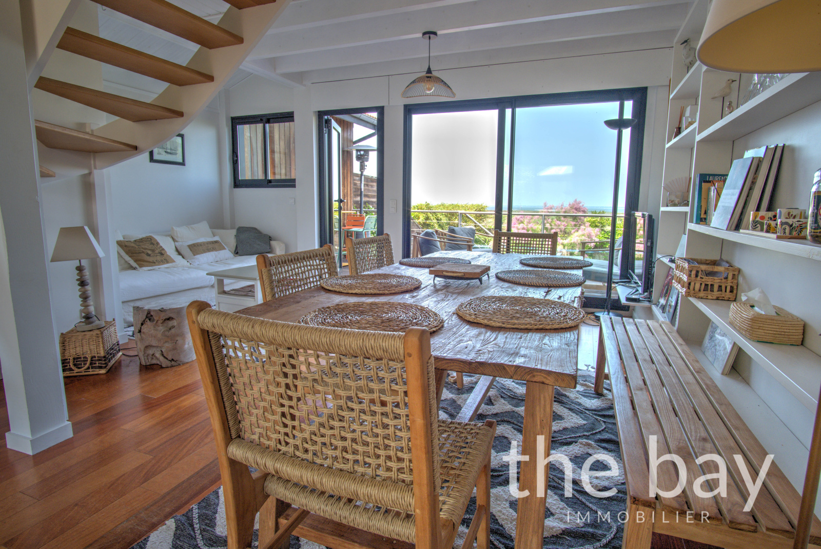Au premier niveau, le salon-séjour traversant, qui semble flotter au-dessus du Bassin, s'ouvre sur deux terrasses, apportant une luminosité et une sensation d’espace appréciable.