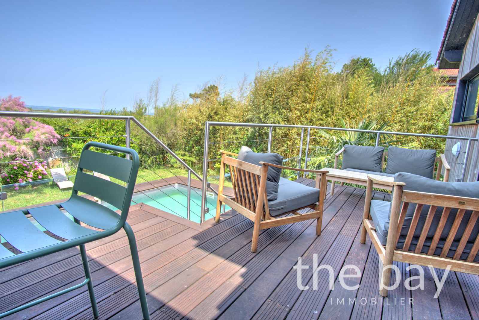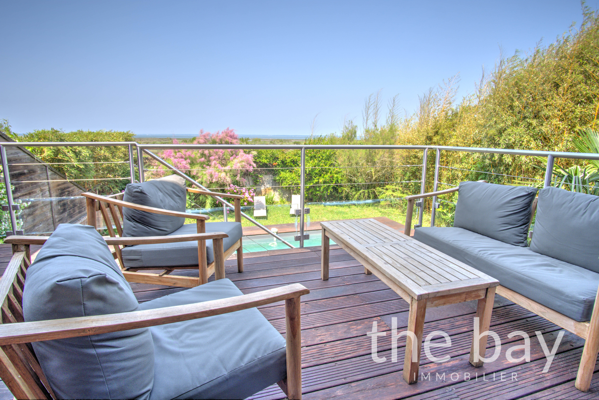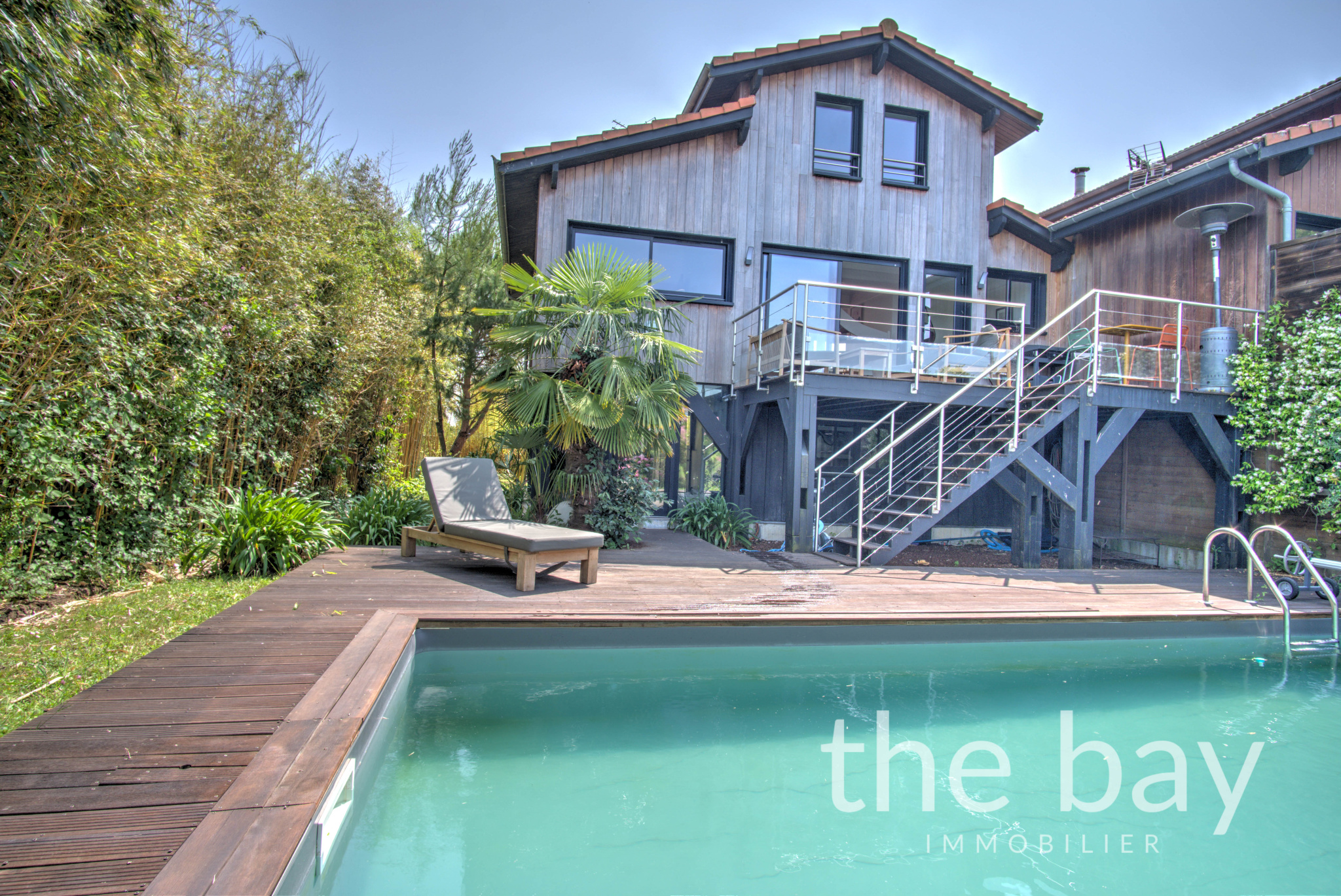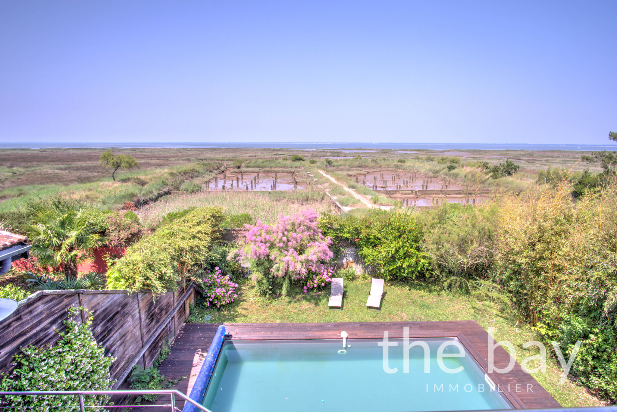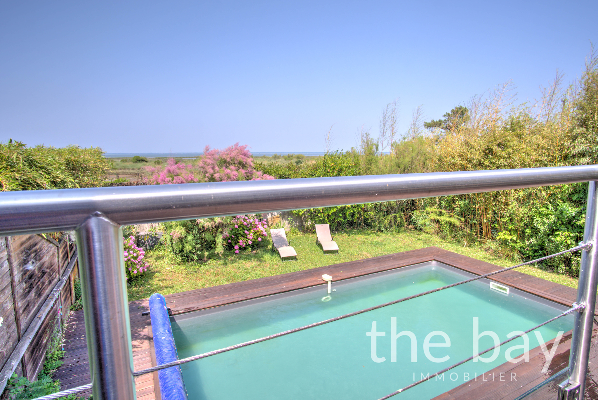 A l'extérieur jolie piscine donnant sur le bassin.