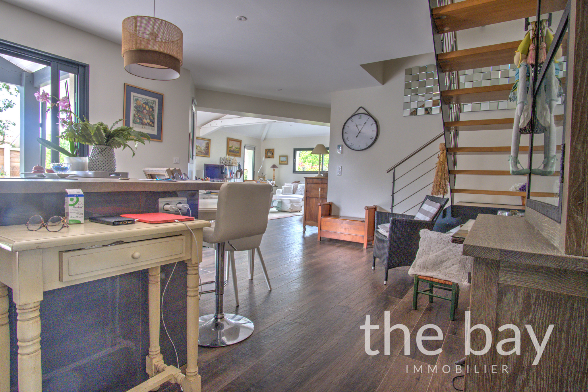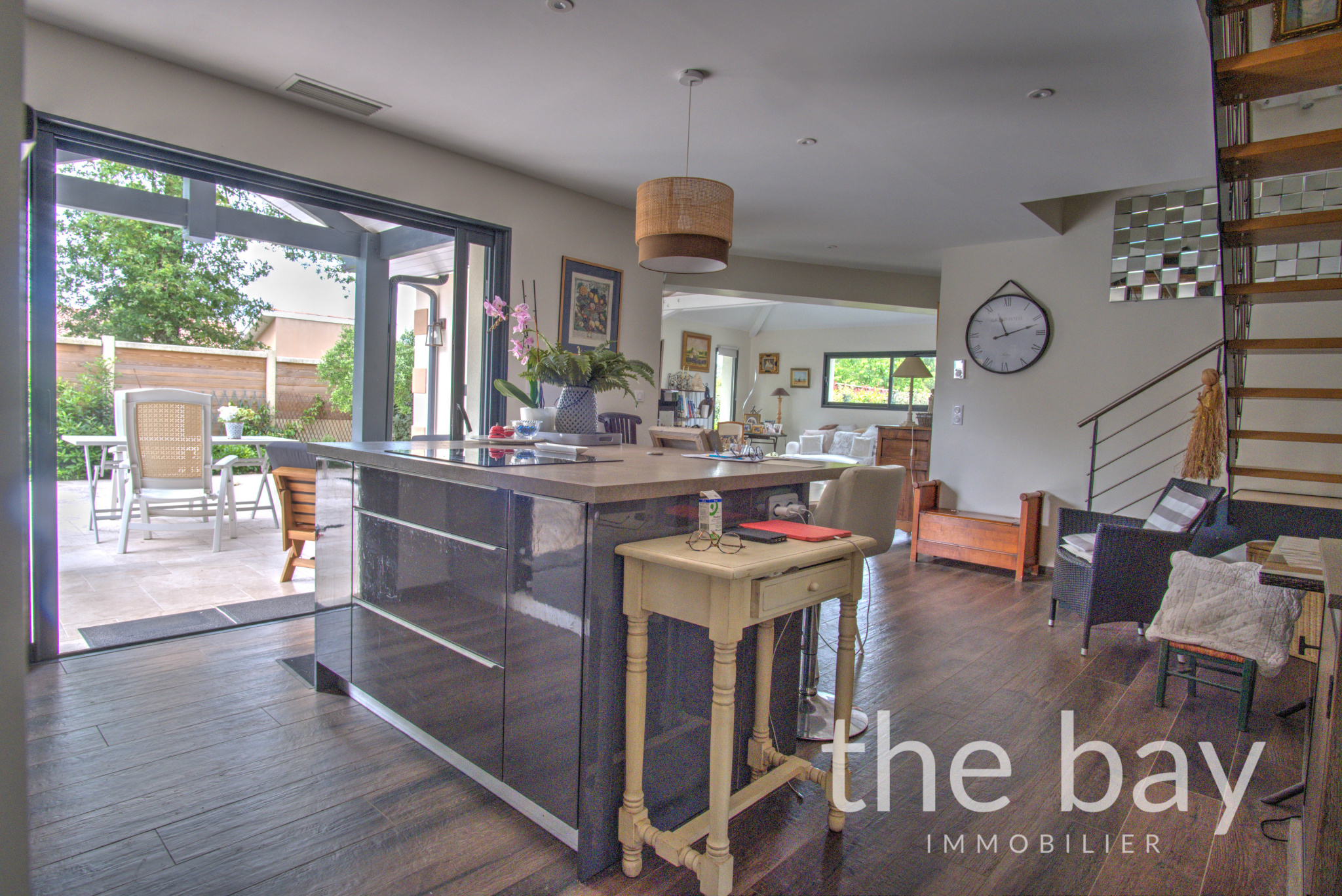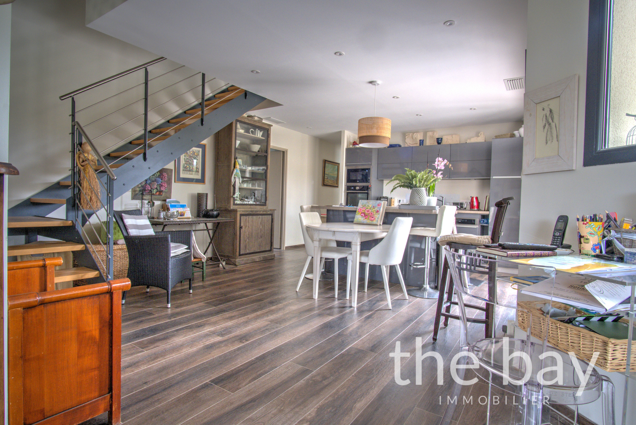 Dès l’entrée, les volumes généreux et la lumière omniprésente donnent le ton. La pièce de vie d’environ 55 m², avec ses belles hauteurs sous plafond et sa cuisine américaine équipée prolongée par un cellier discret, s’ouvre largement sur l’extérieur.