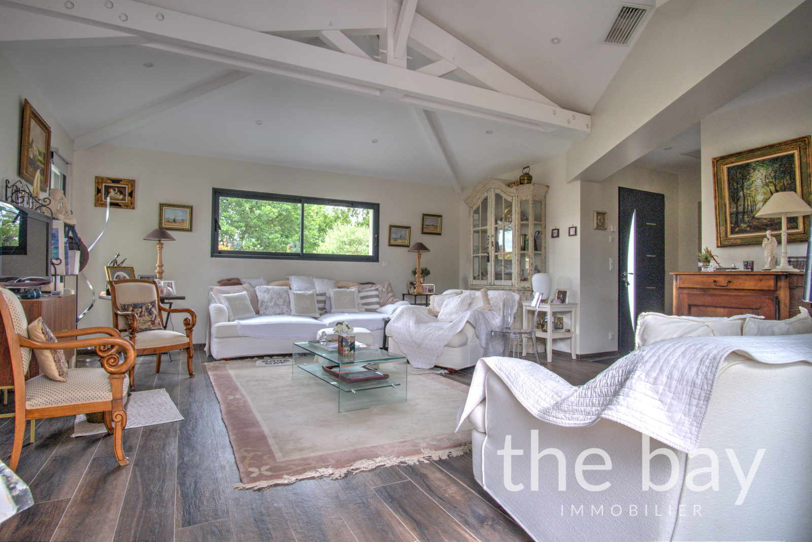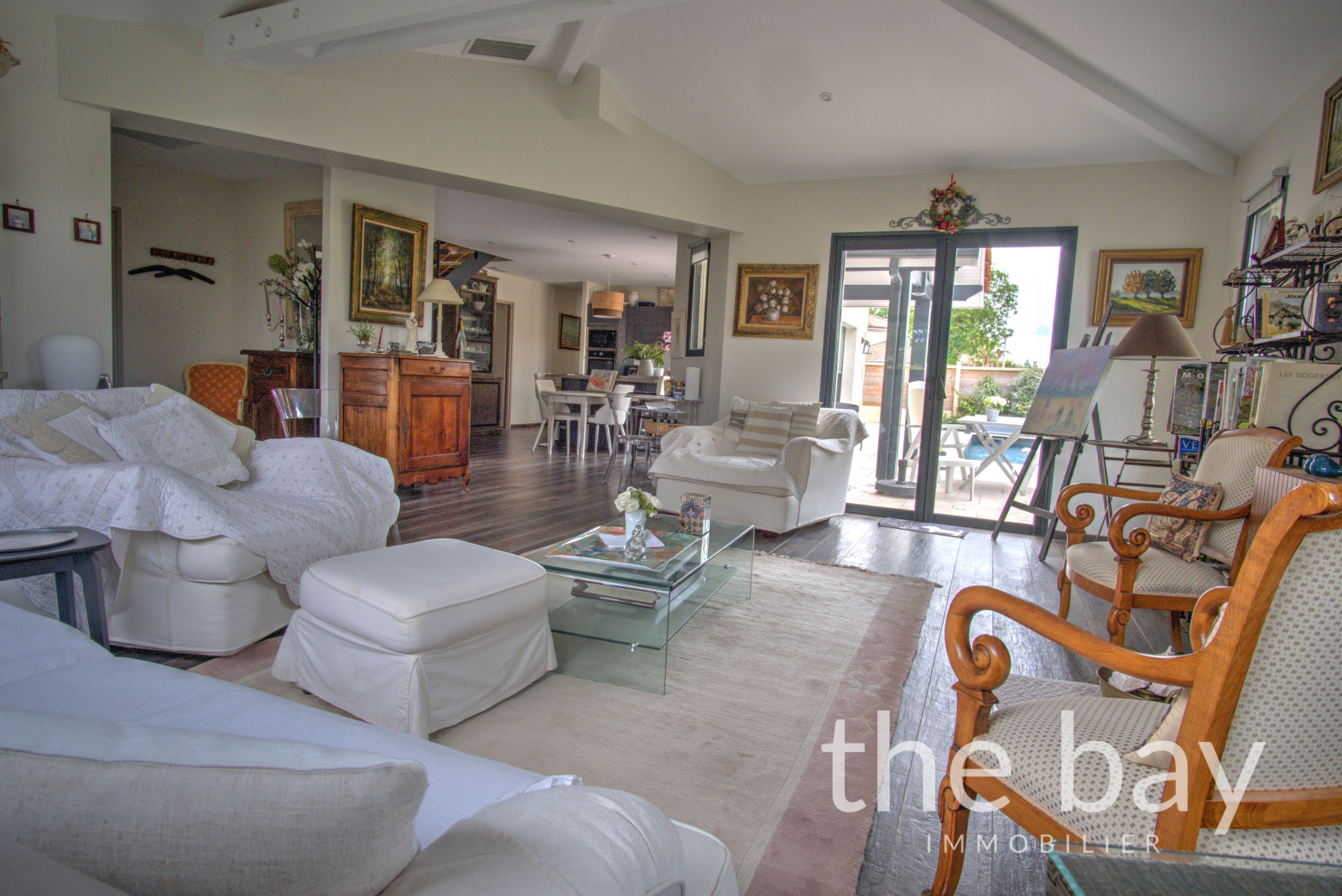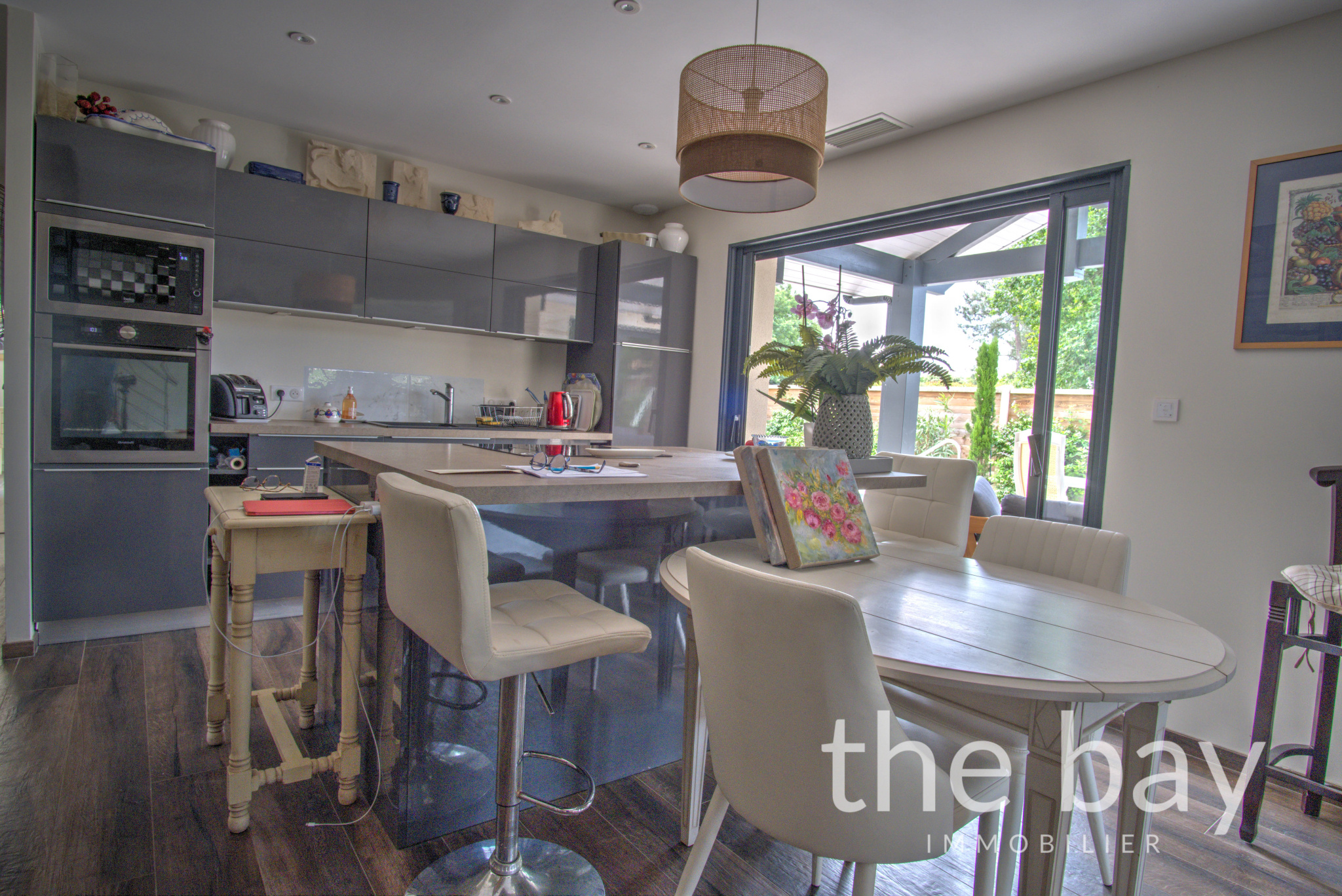 Dès l’entrée, les volumes généreux et la lumière omniprésente donnent le ton. La pièce de vie d’environ 55 m², avec ses belles hauteurs sous plafond et sa cuisine américaine équipée prolongée par un cellier discret, s’ouvre largement sur l’extérieur.