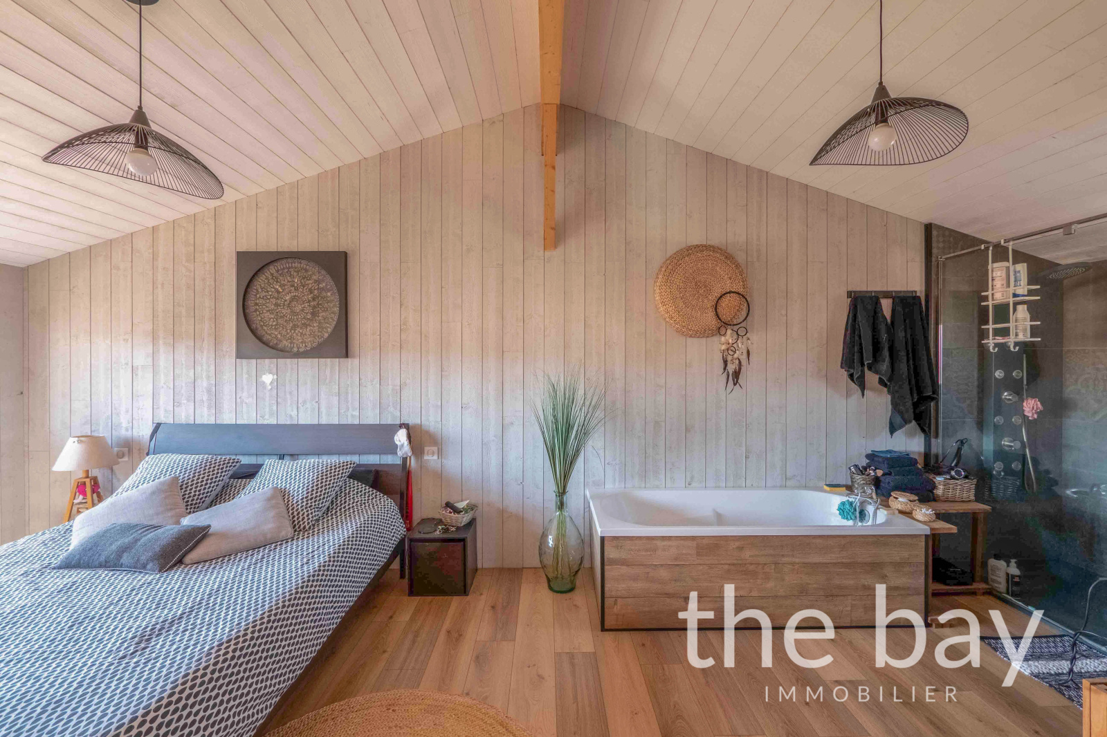 Édifiée sur deux niveaux, elle offre au rez-de-chaussée une vaste pièce de vie baignée de lumière grâce à son plafond cathédrale et ses larges baies vitrées ouvrant sur la terrasse avec piscine et bar extérieur. La cuisine, entièrement équipée, est ouverte sur le séjour pour une convivialité optimale. Trois chambres, une salle de bain avec douche, un WC et un cellier complètent ce niveau.