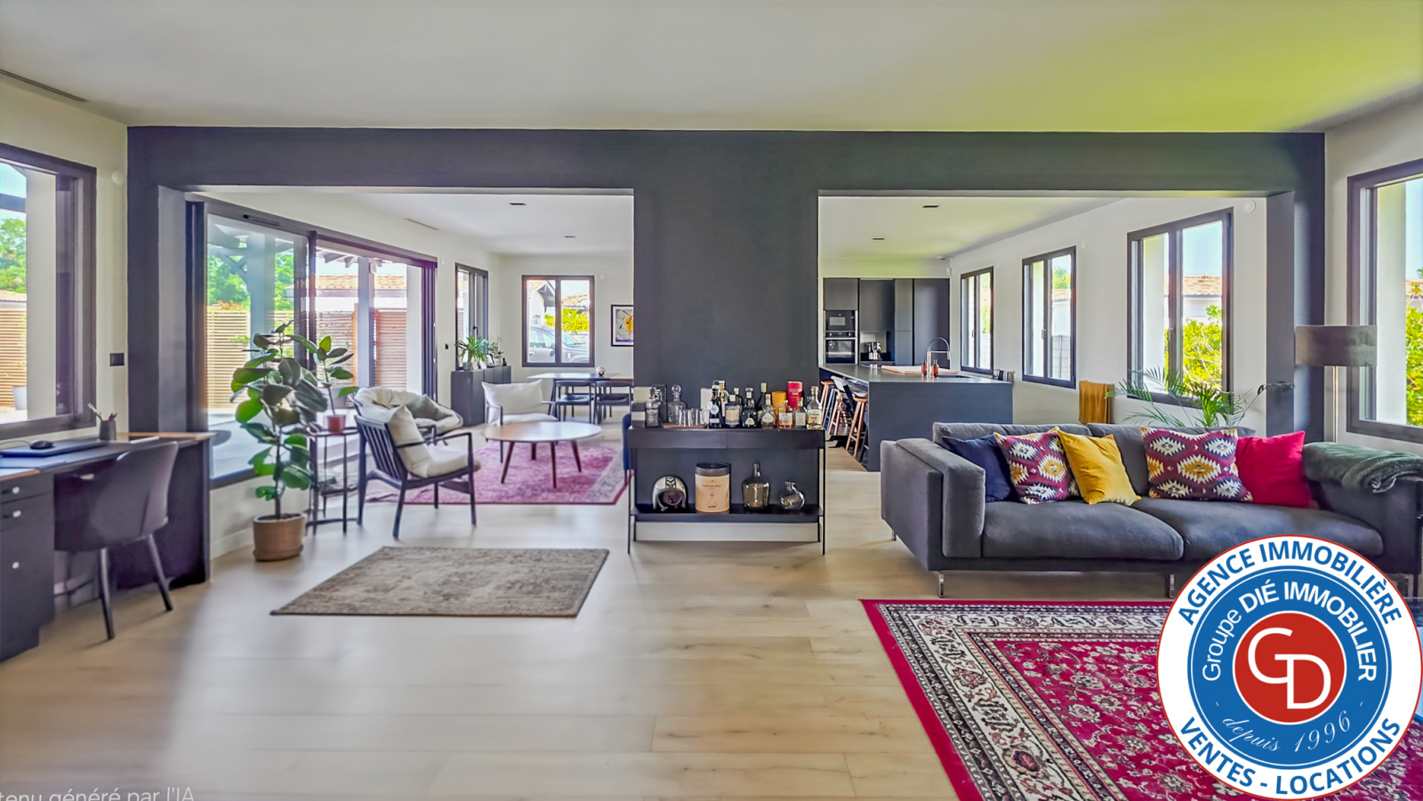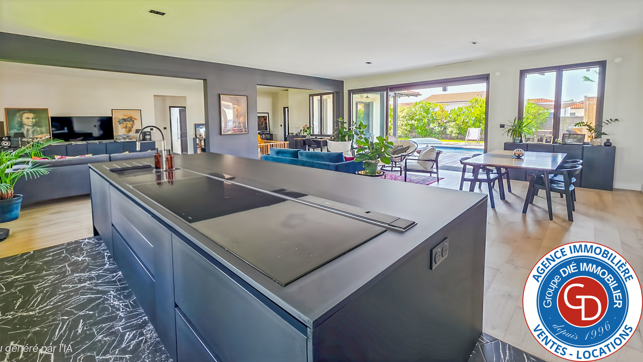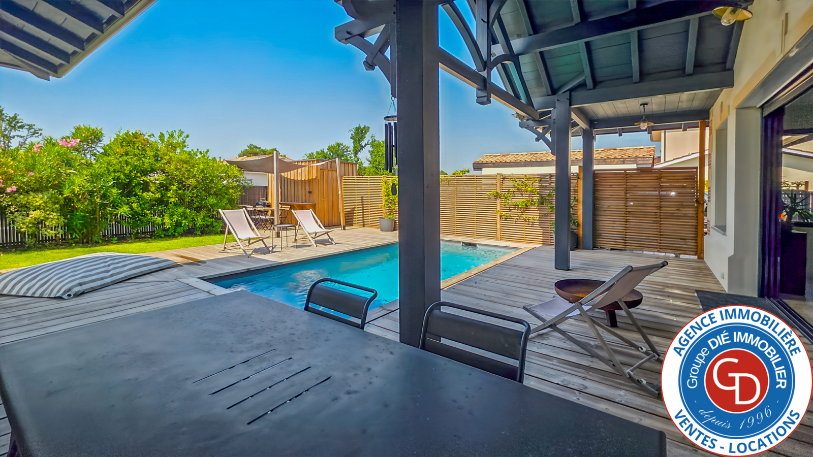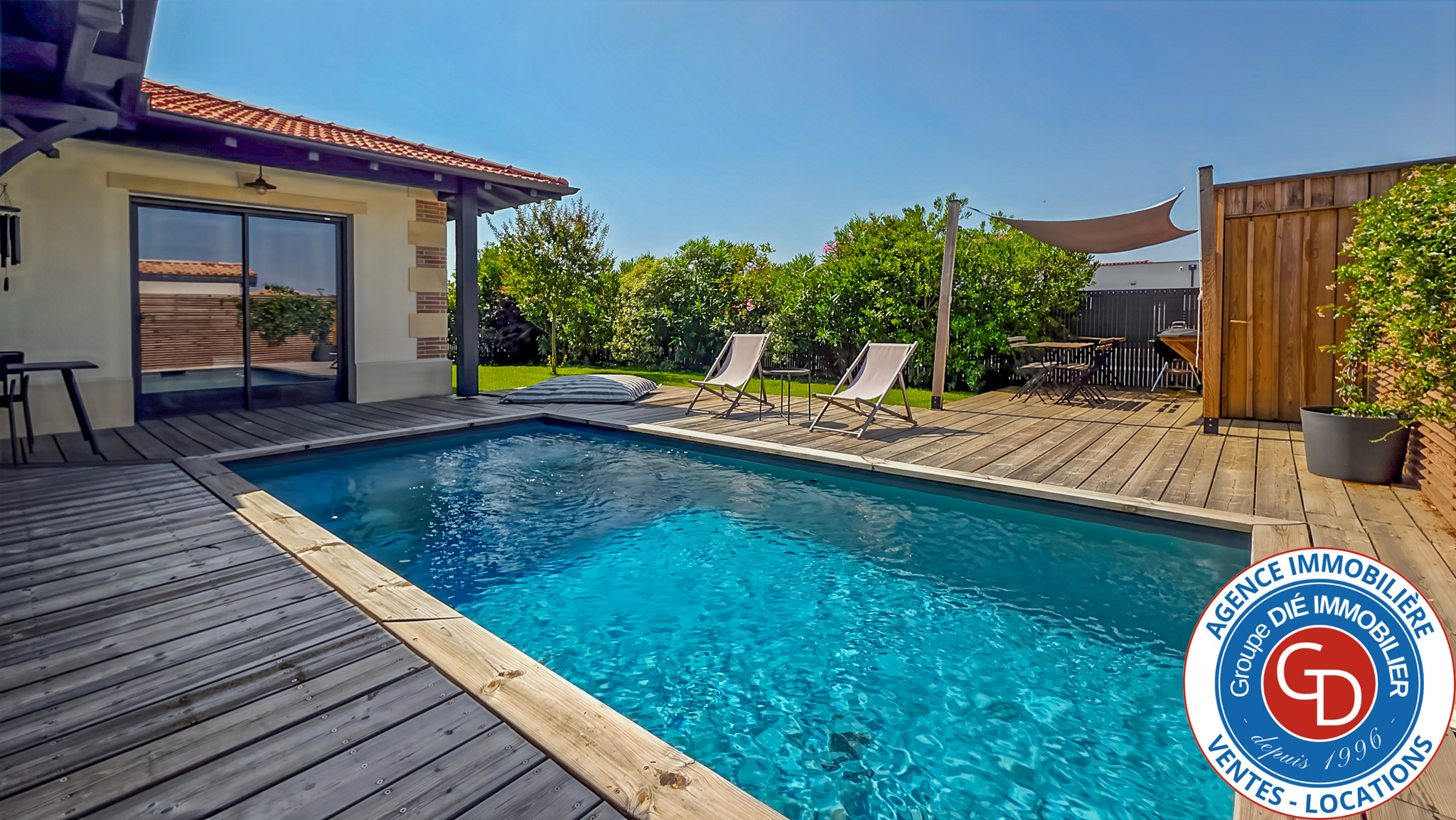 A Mios, Le Groupe DIÉ IMMOBILIER a l'honneur de vous présenter une villa (168 m2 avec garage) indépendante d'exception construite en 2021, de plain-pied et traversante avec 3 chambres (possibilité 4), édifiée sur une parcelle de terrain de 572 m2 avec garage et piscine chauffée au sel.