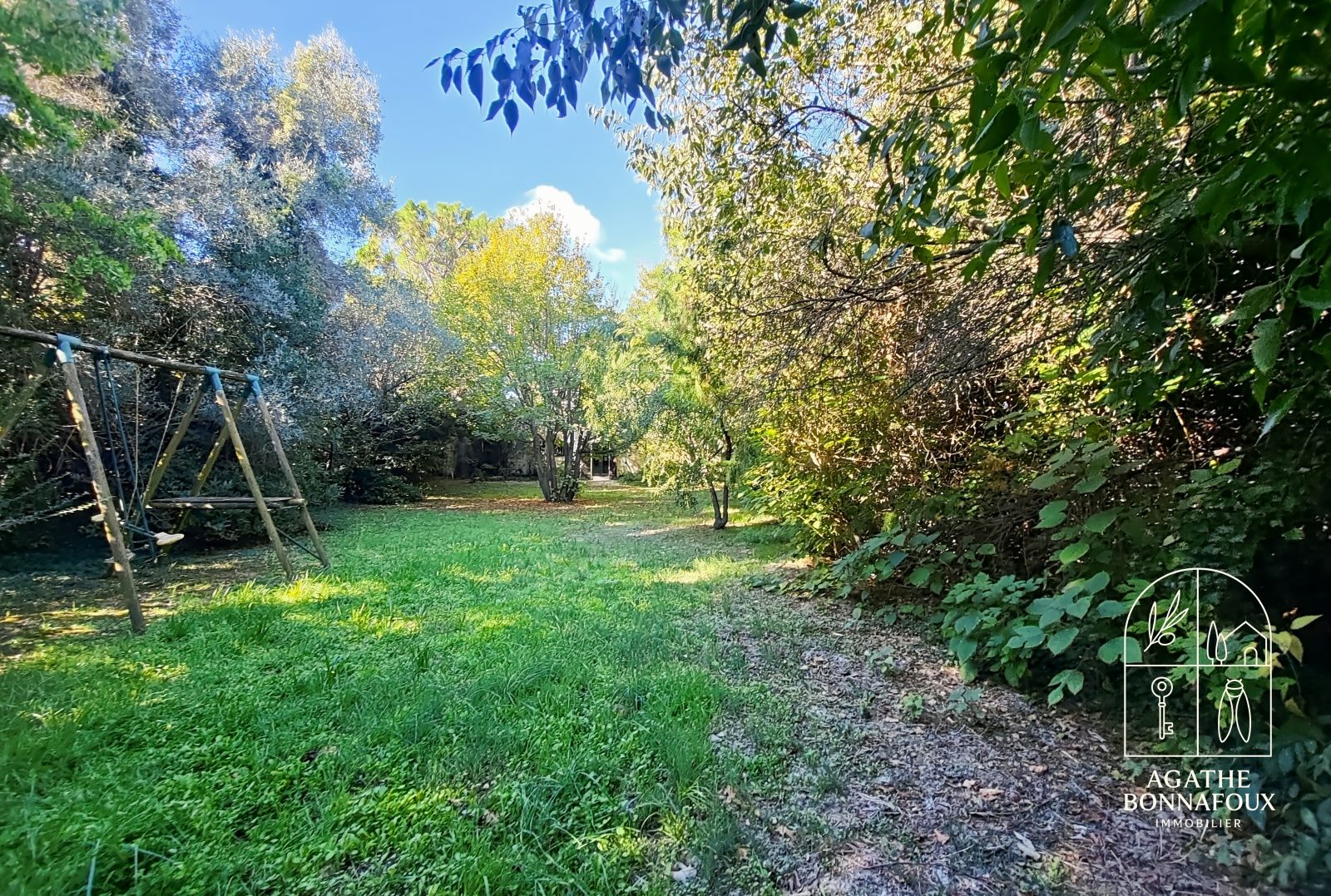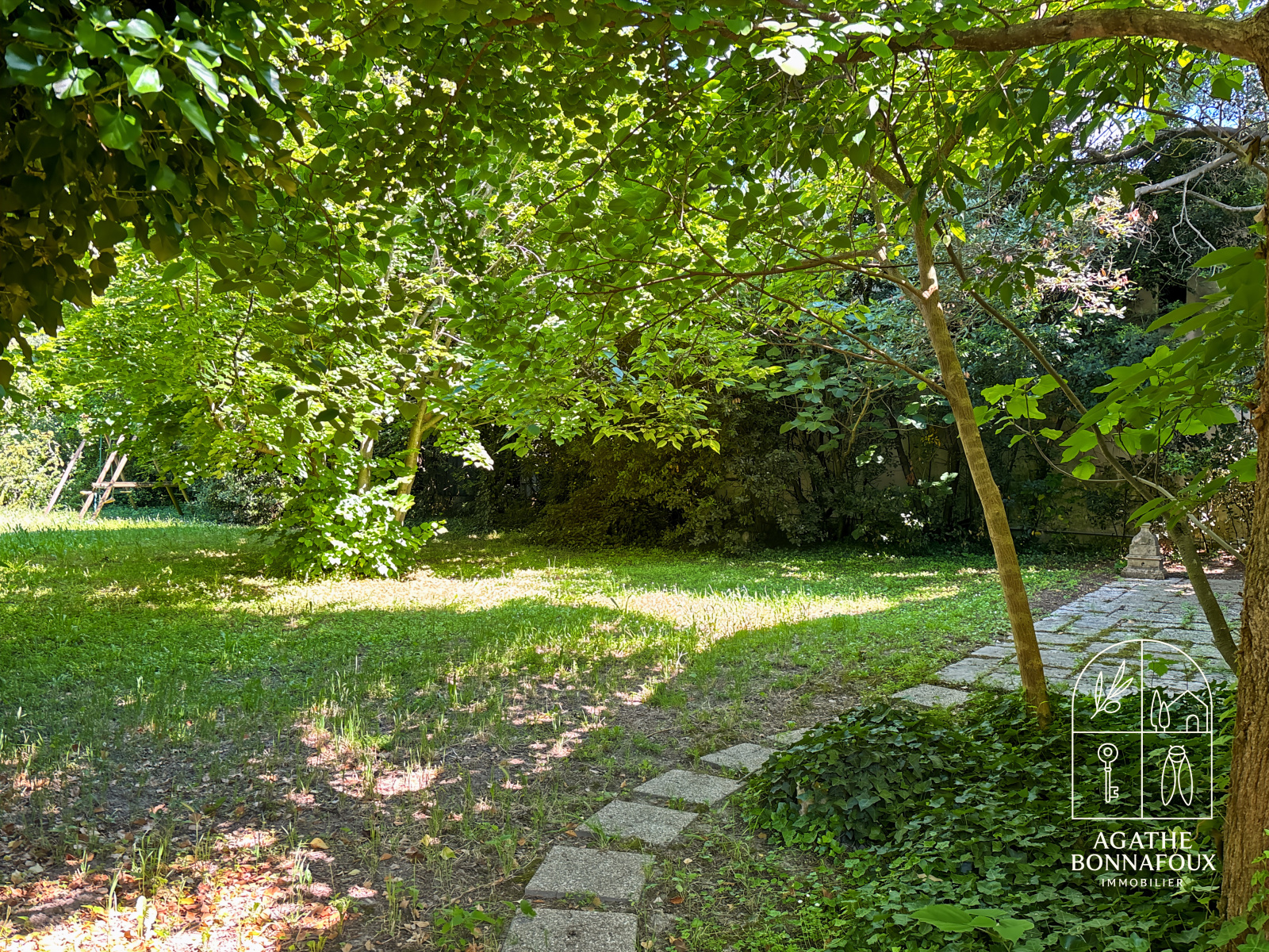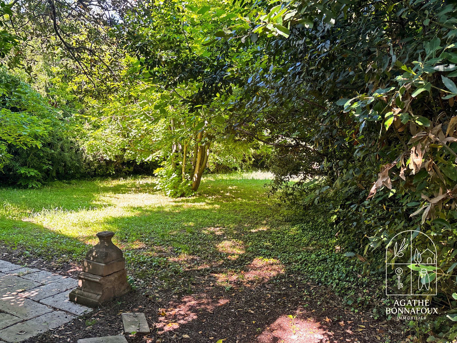 Entrée par le portillon ancien afin de découvrir un beau jardin arboré "buccolique" disposant de plusieurs places de stationnement sur l'arrière, un bel espace vert au sud et un terrain de loisir "piscinable" à l'abri des regards (1575 m2).