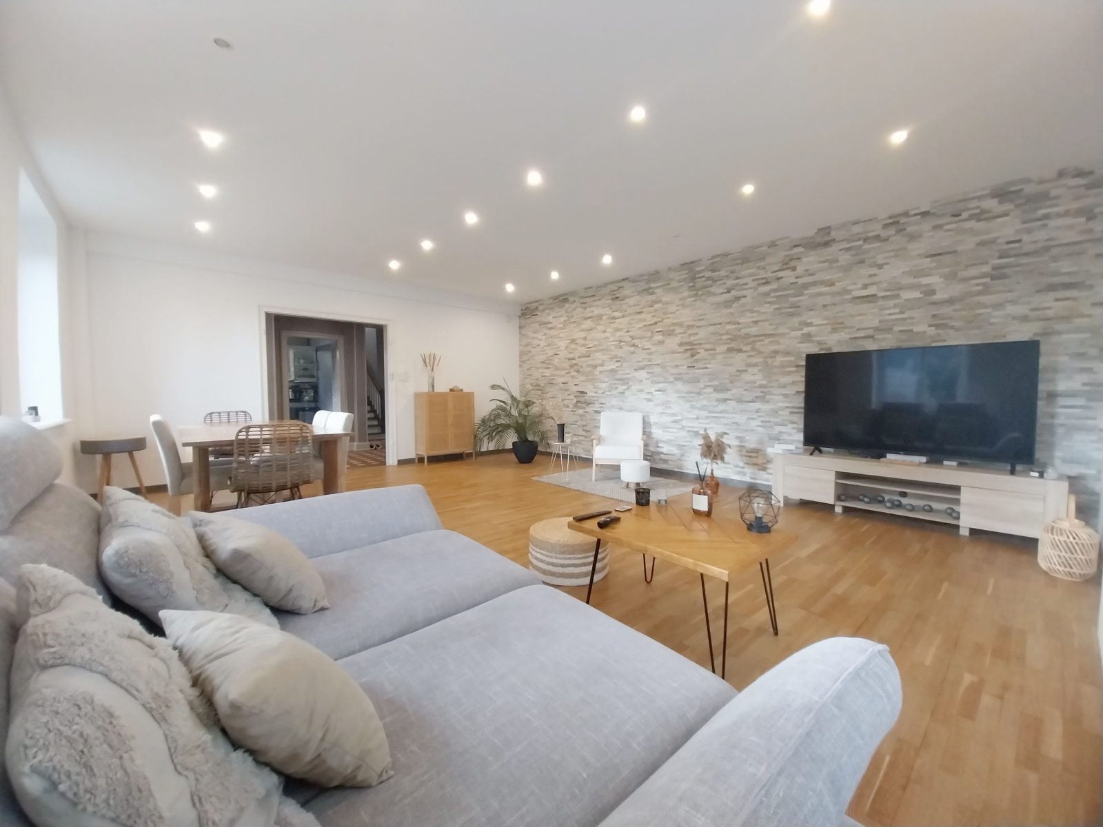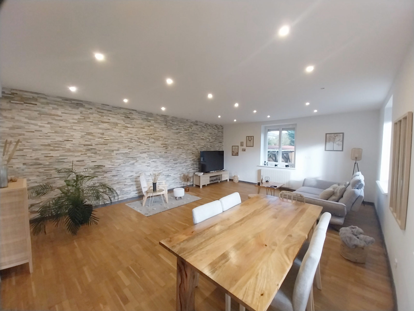 Au rez-de-chaussée une grande entrée, la cuisine séparée et équipée, un espace cave/buanderie, et un salon-séjour en parquet et pierre de parement, baigné de lumière avec la possiblité d'installer une cheminée.