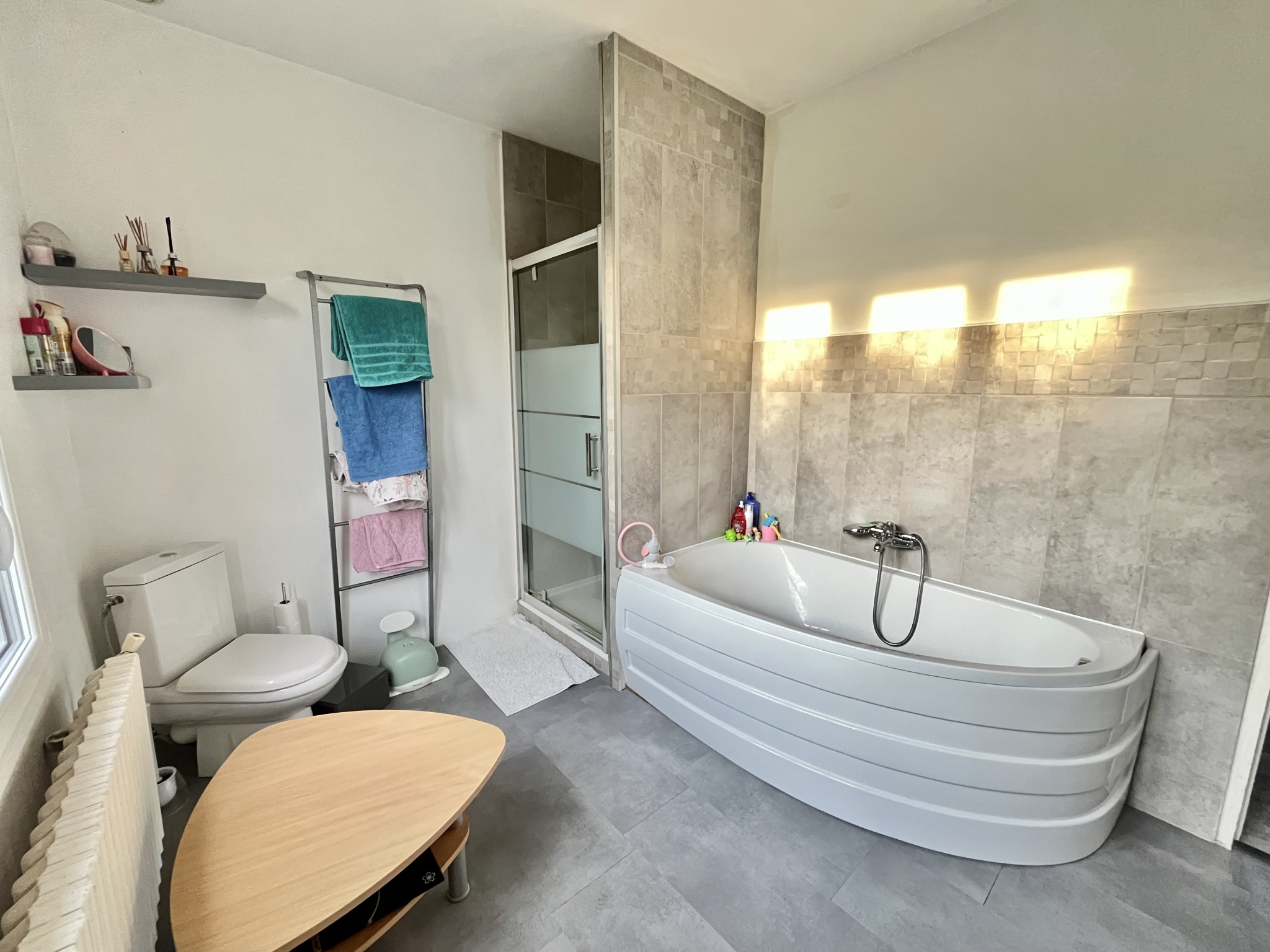 une salle de bains équipée d’une baignoire et d’une douche ainsi que d'un wc.