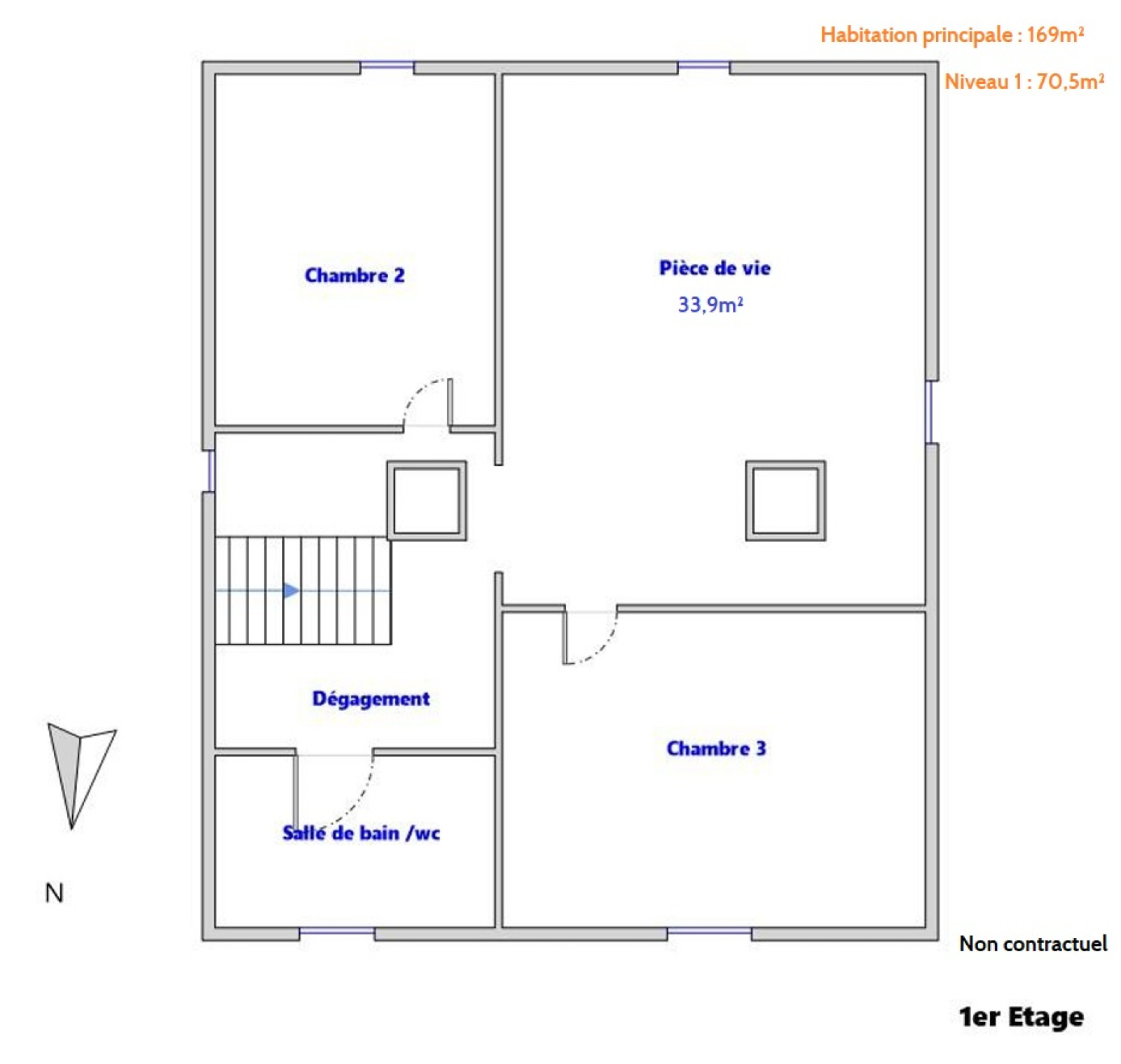 La maison principale développe environ 169 m² habitables sur deux niveaux.