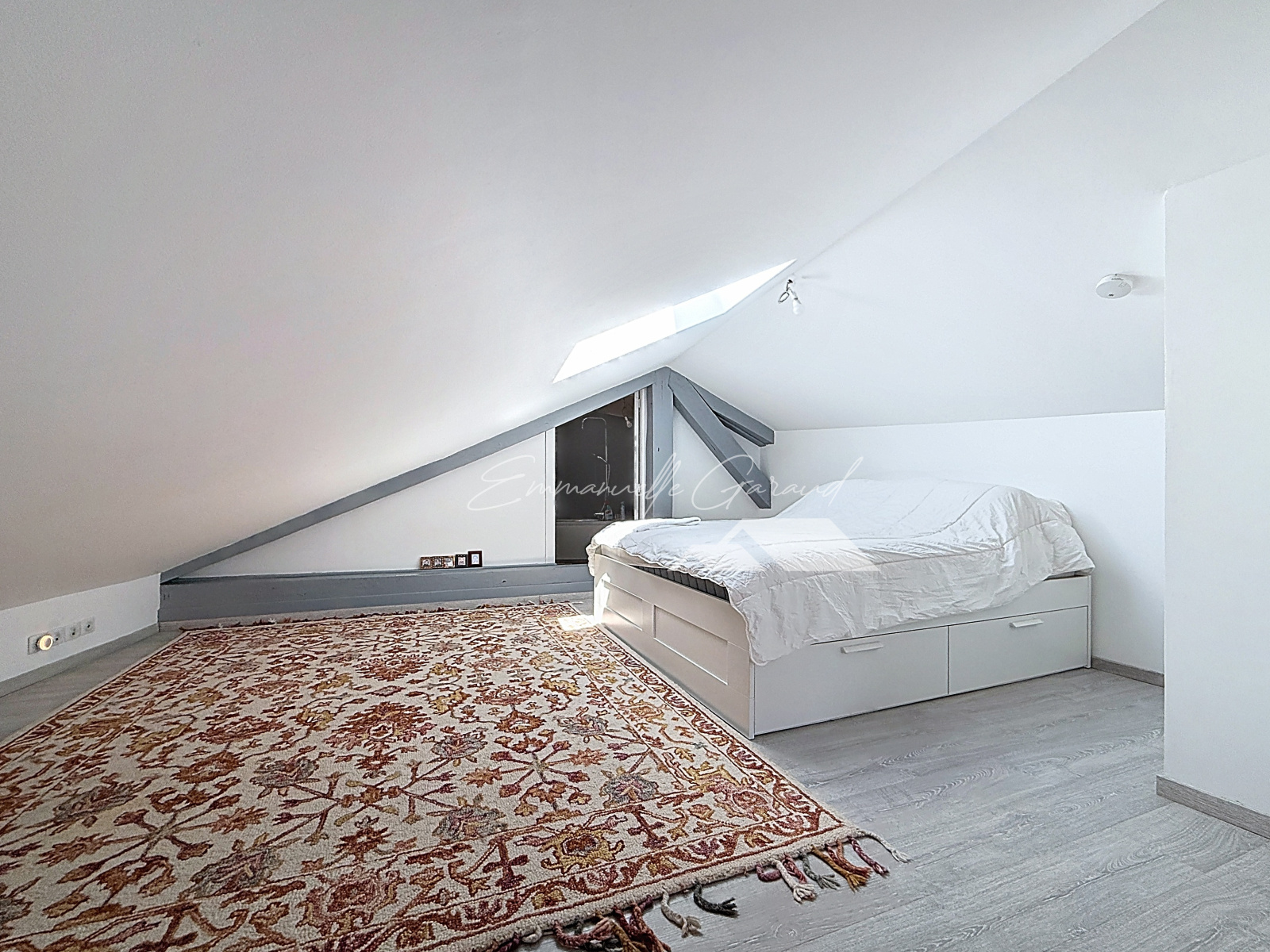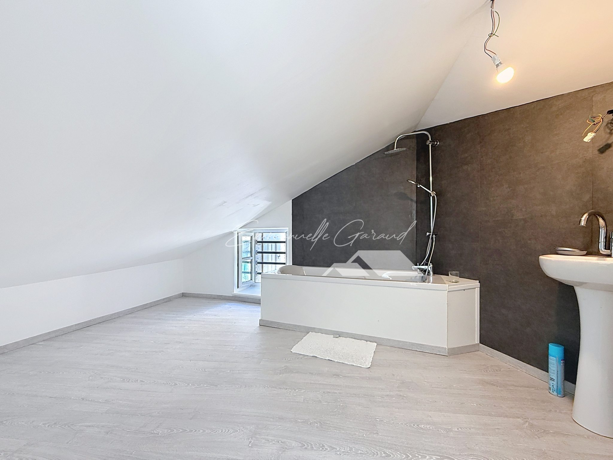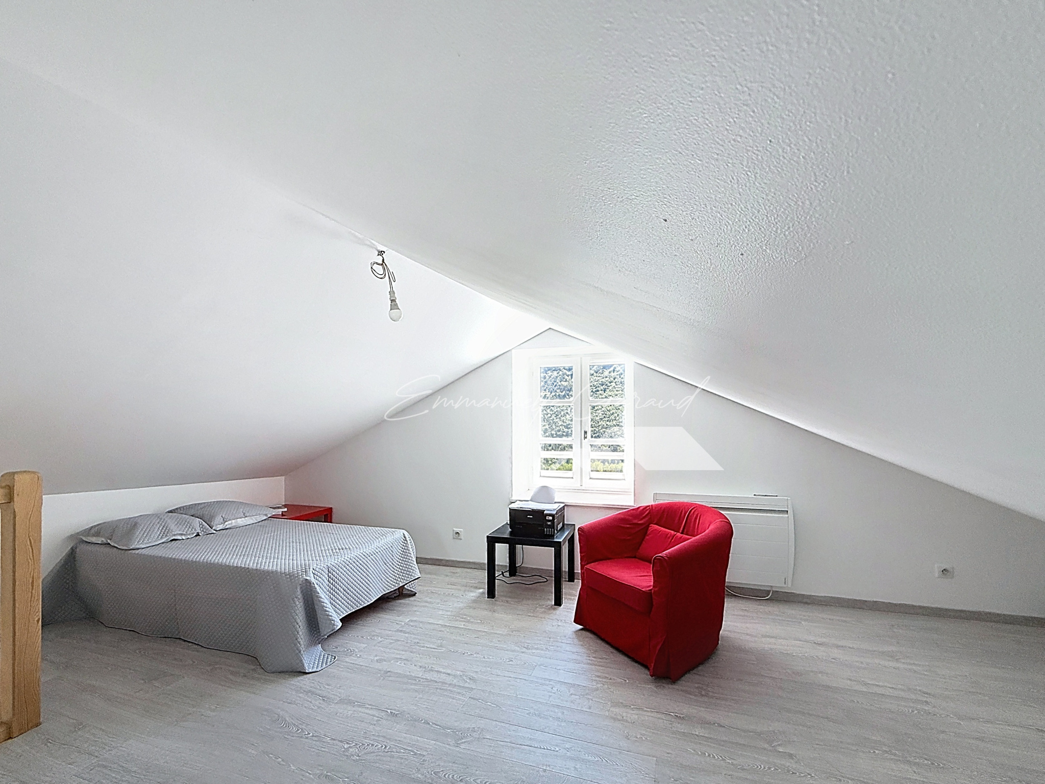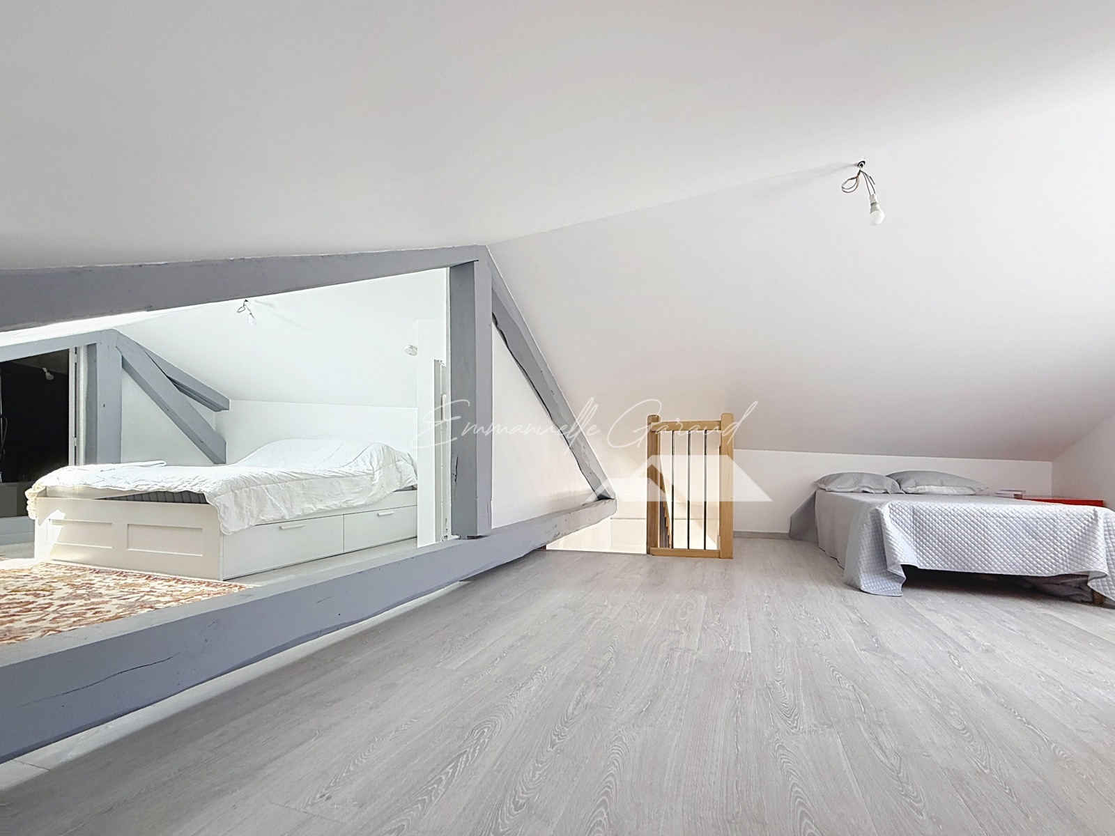 À l’étage, sous les combles entièrement isolés et aménagés en 2021, vous trouverez deux espaces nuit ainsi qu’une salle de bain.