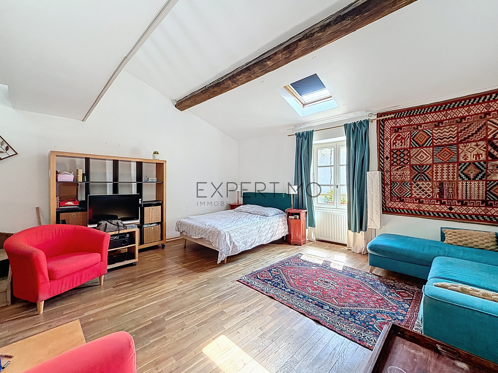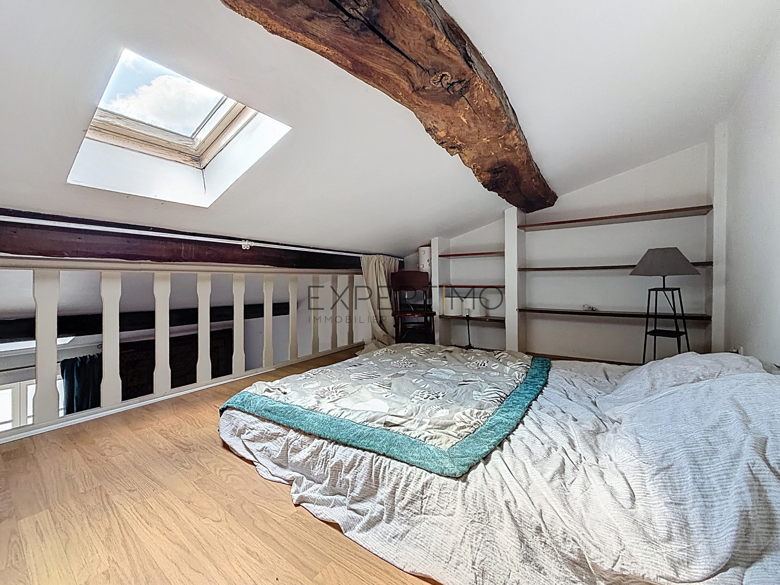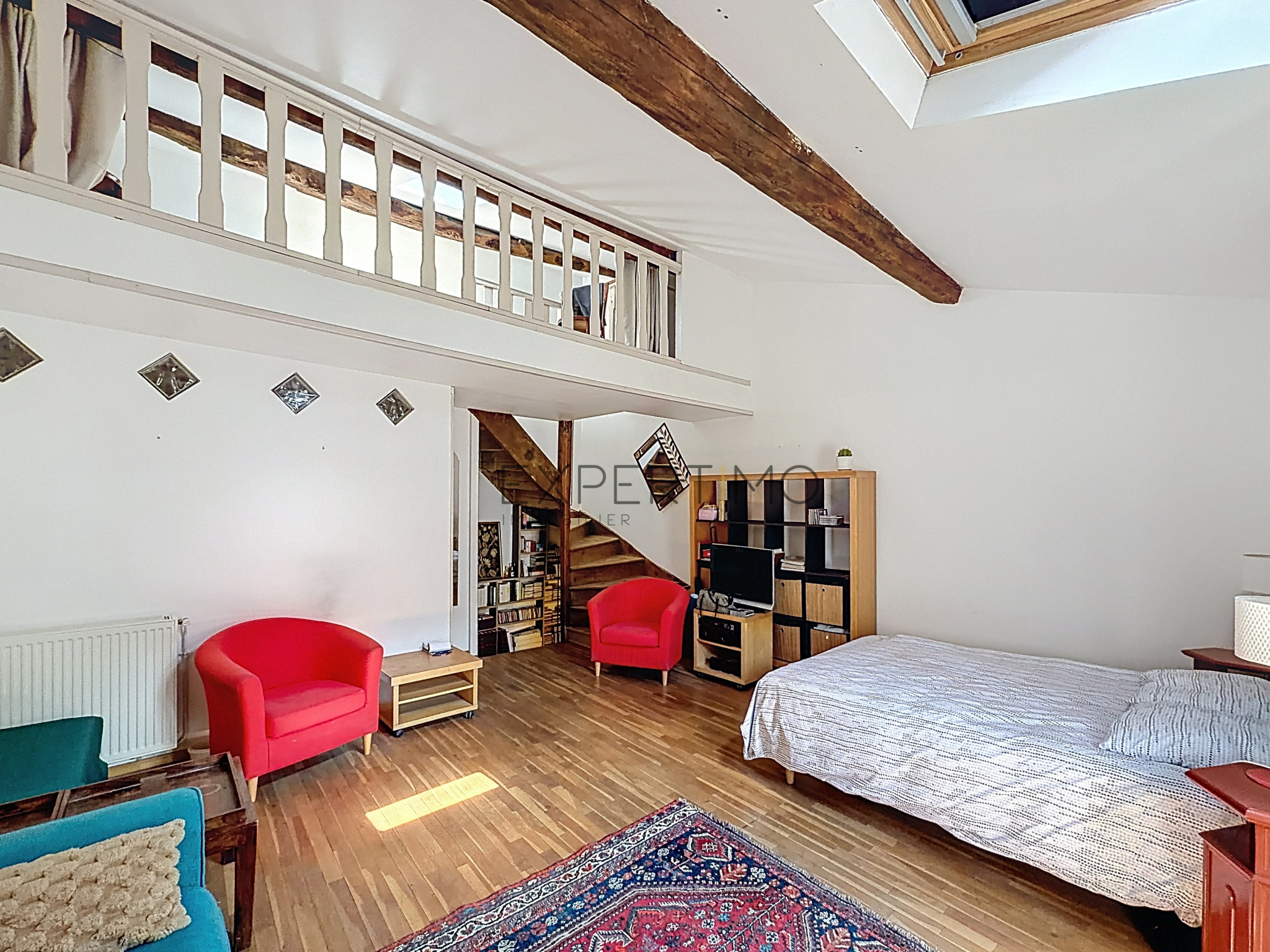 Au dernier niveau, une grande chambre pleine de cachet vous attend, avec son coin salon cosy, ainsi qu’une mezzanine (hauteur 1,60 m), parfaite pour un couchage d’appoint ou un espace nuit supplémentaire, baignée de lumière grâce à son velux.