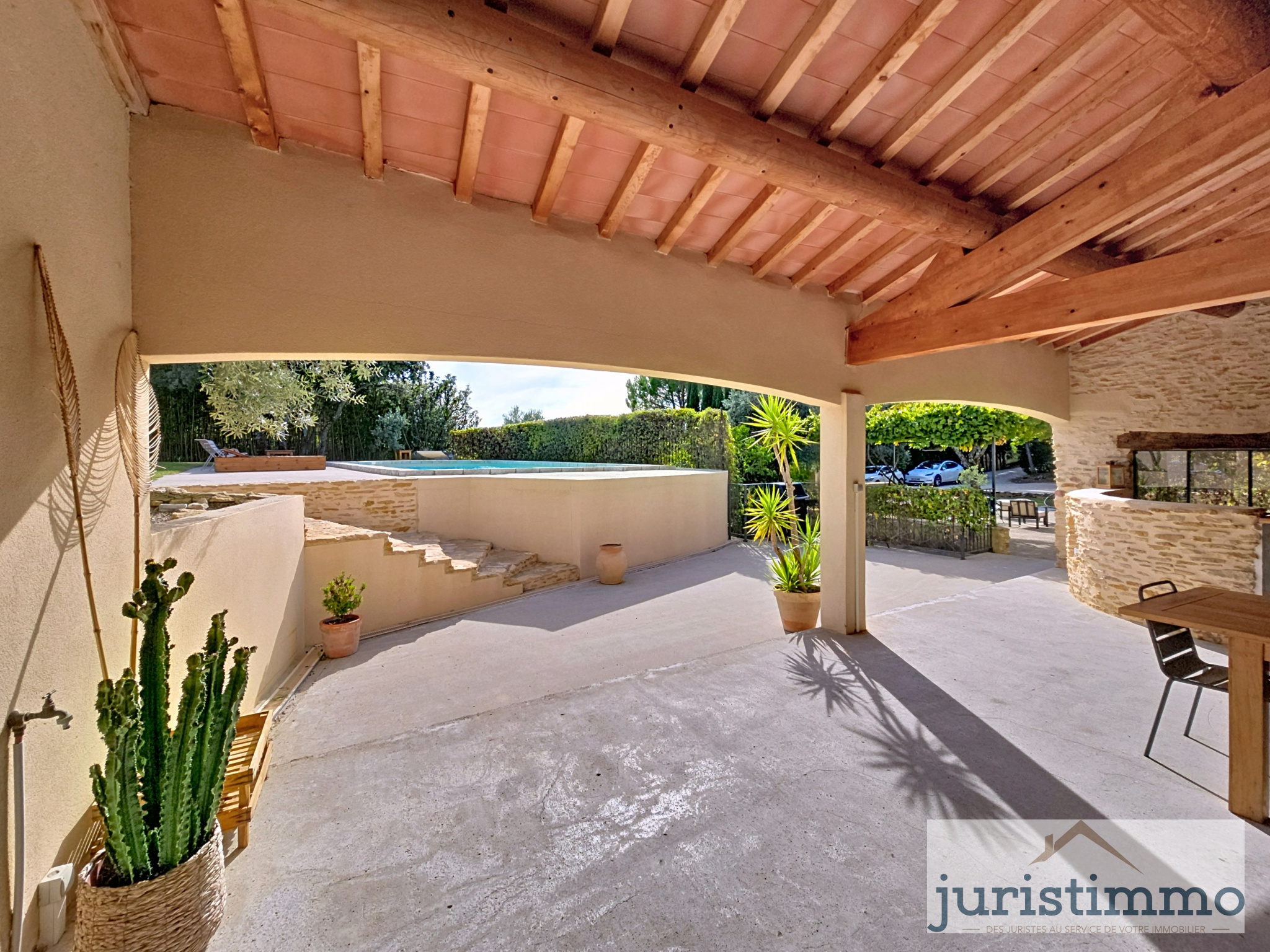 une terrasse couverte de 70 m² avec cuisine d’été, une piscine 10x5 m, un garage aménageable, un carport et un magnifique jardin paysagé (figuiers, oliviers, cyprès, pins...).