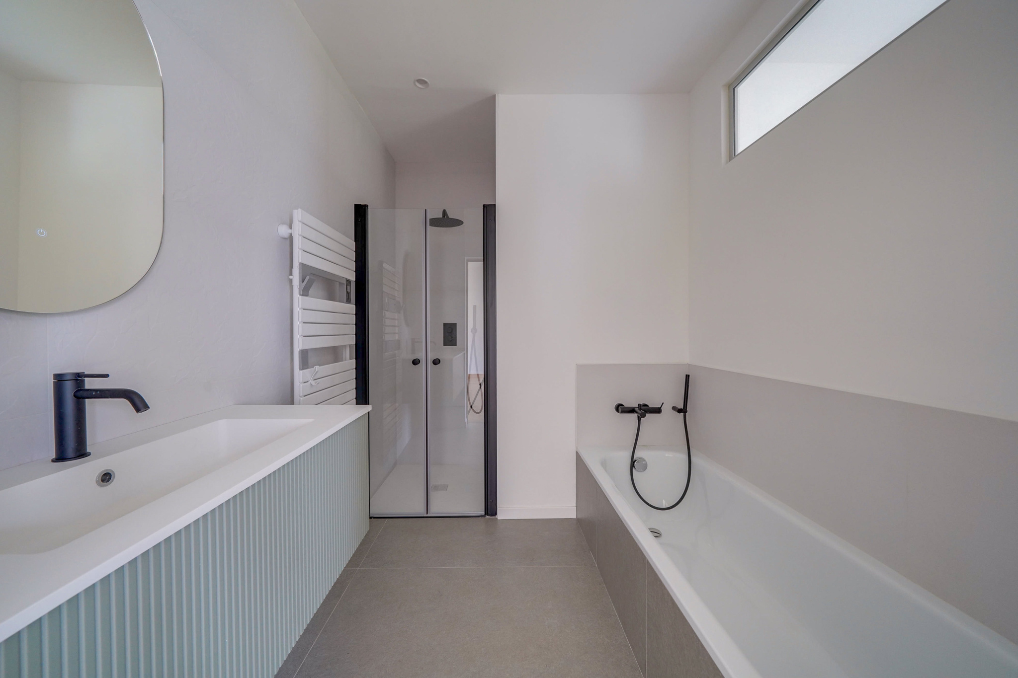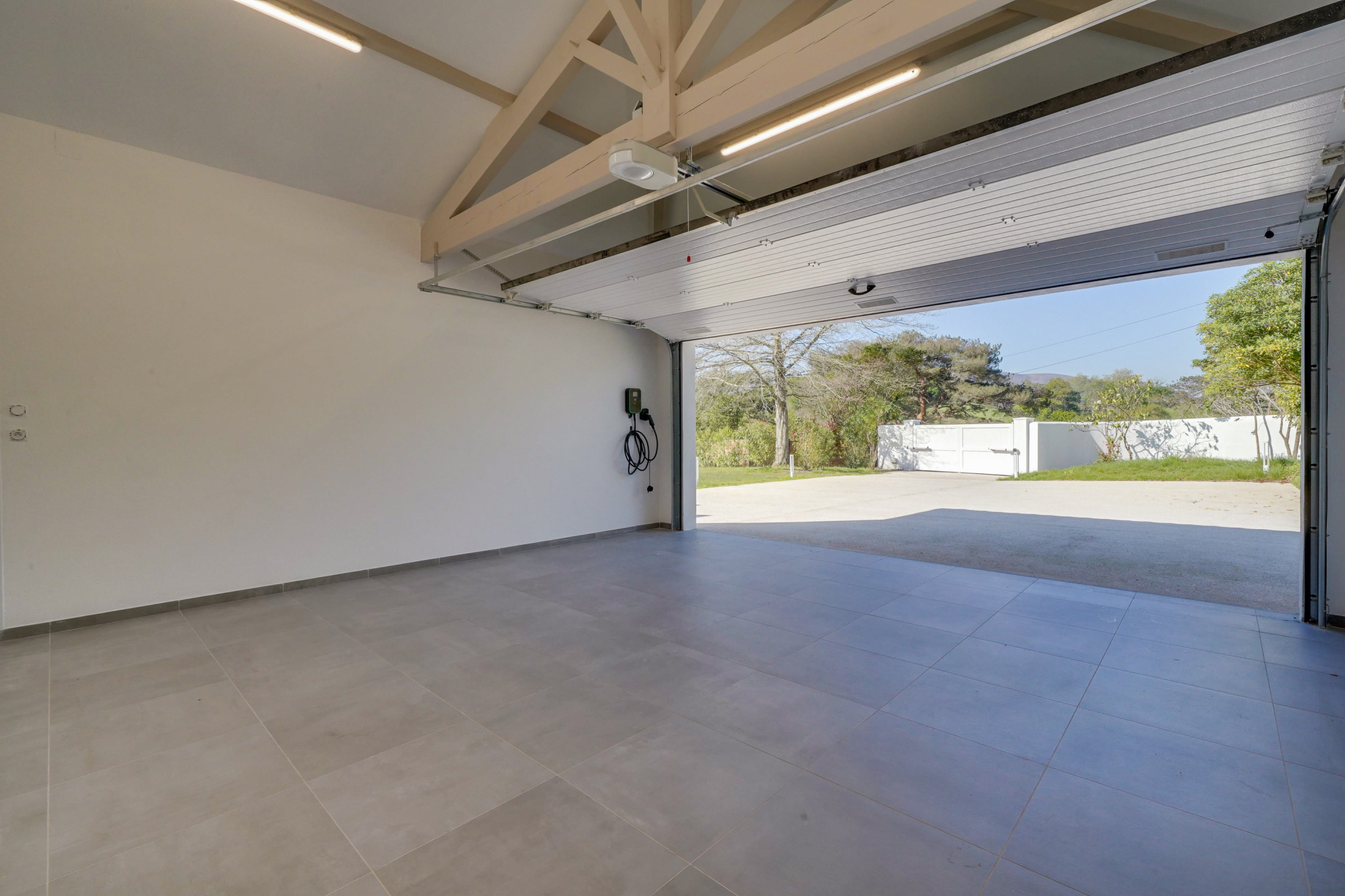 Un double garage indépendant avec borne de recharge pour véhicules électriques complète l’ensemble.