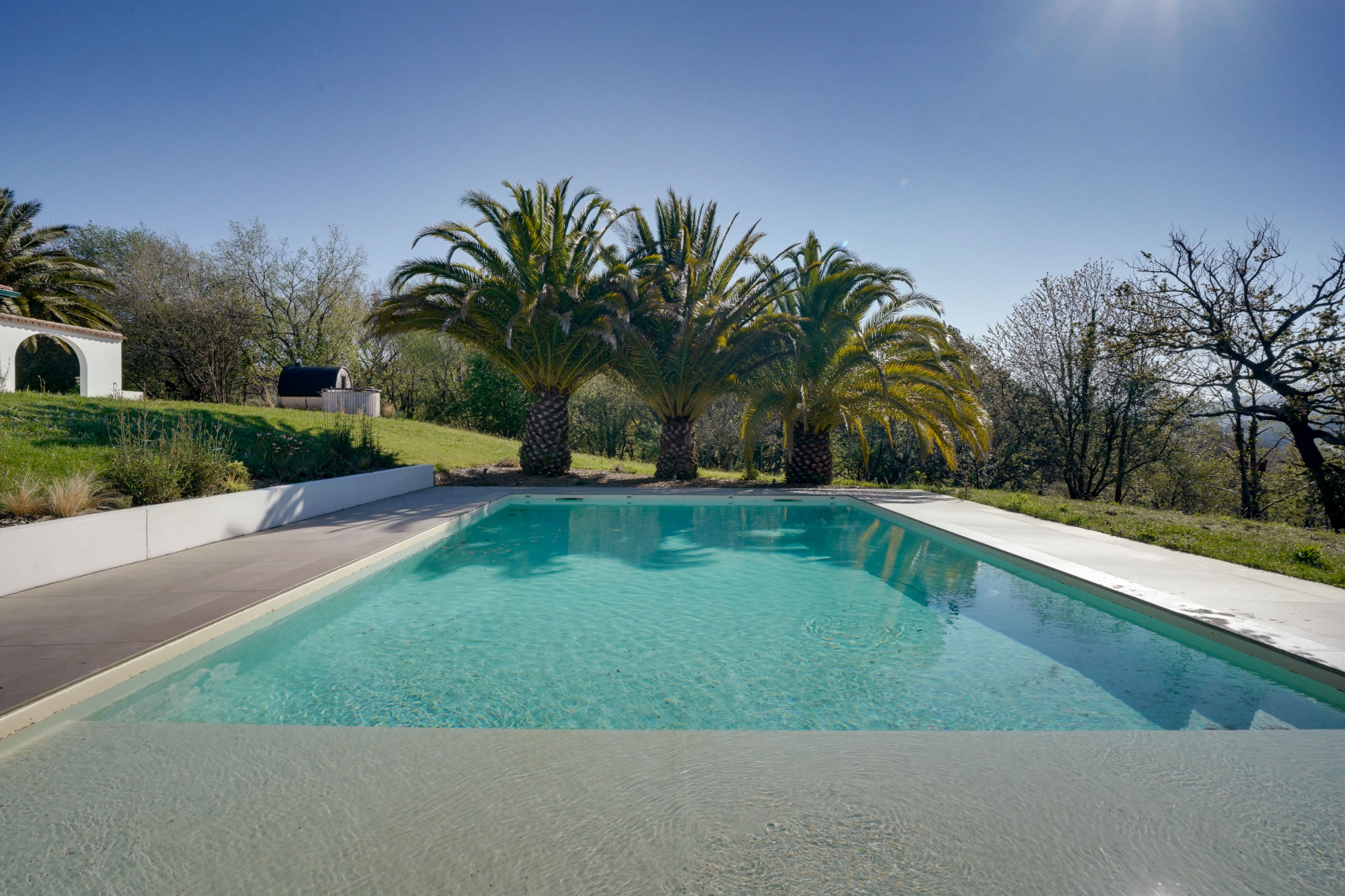 Un grand balcon surplombe la propriété et l’espace piscine, avec une vue dégagée sur l’environnement naturel.
