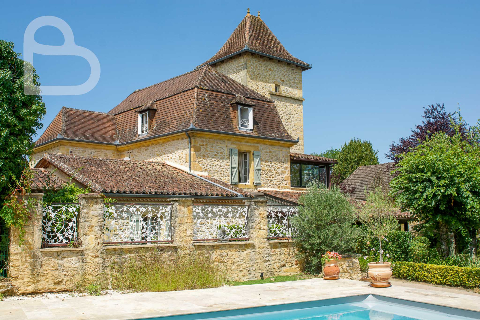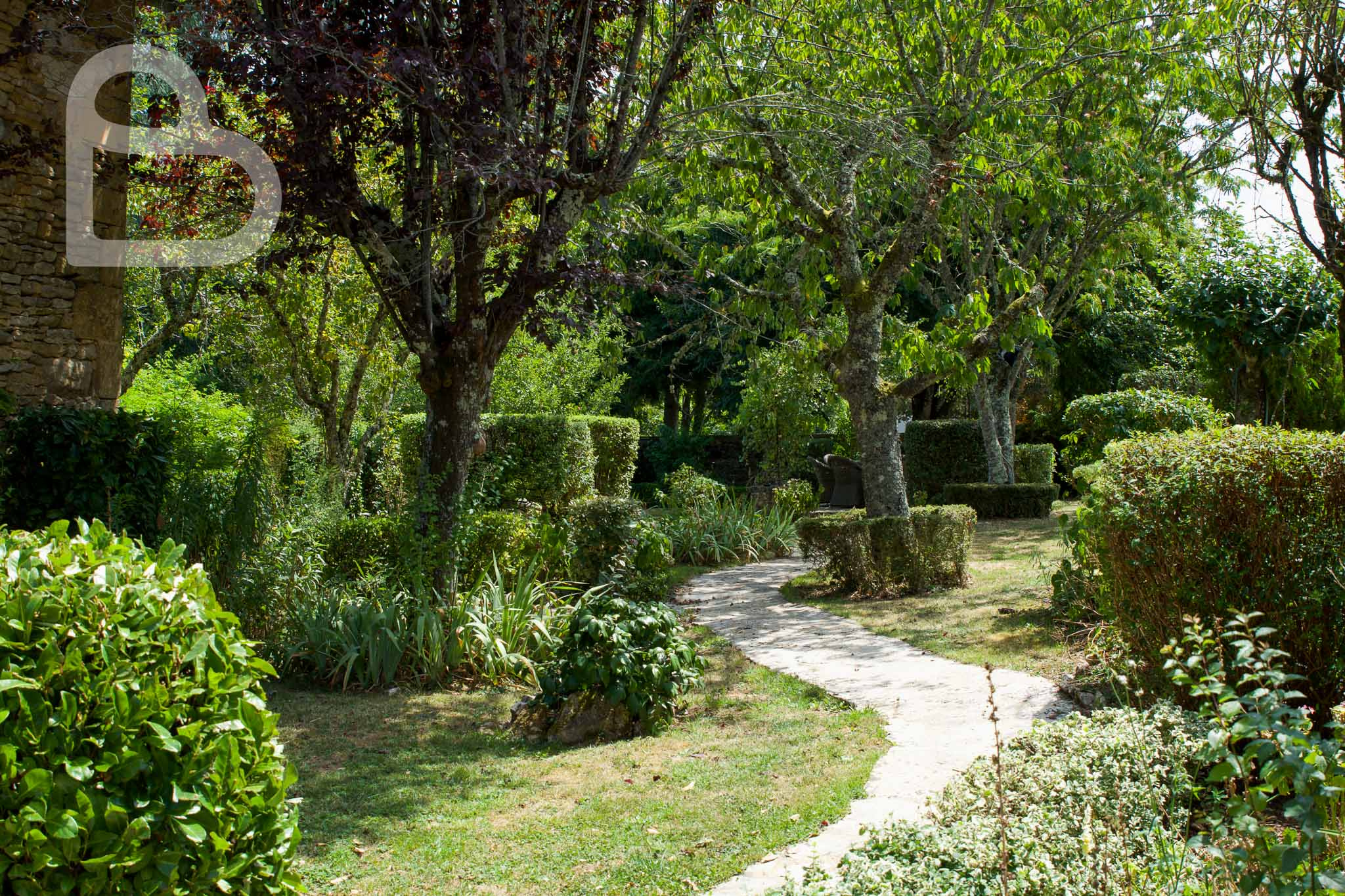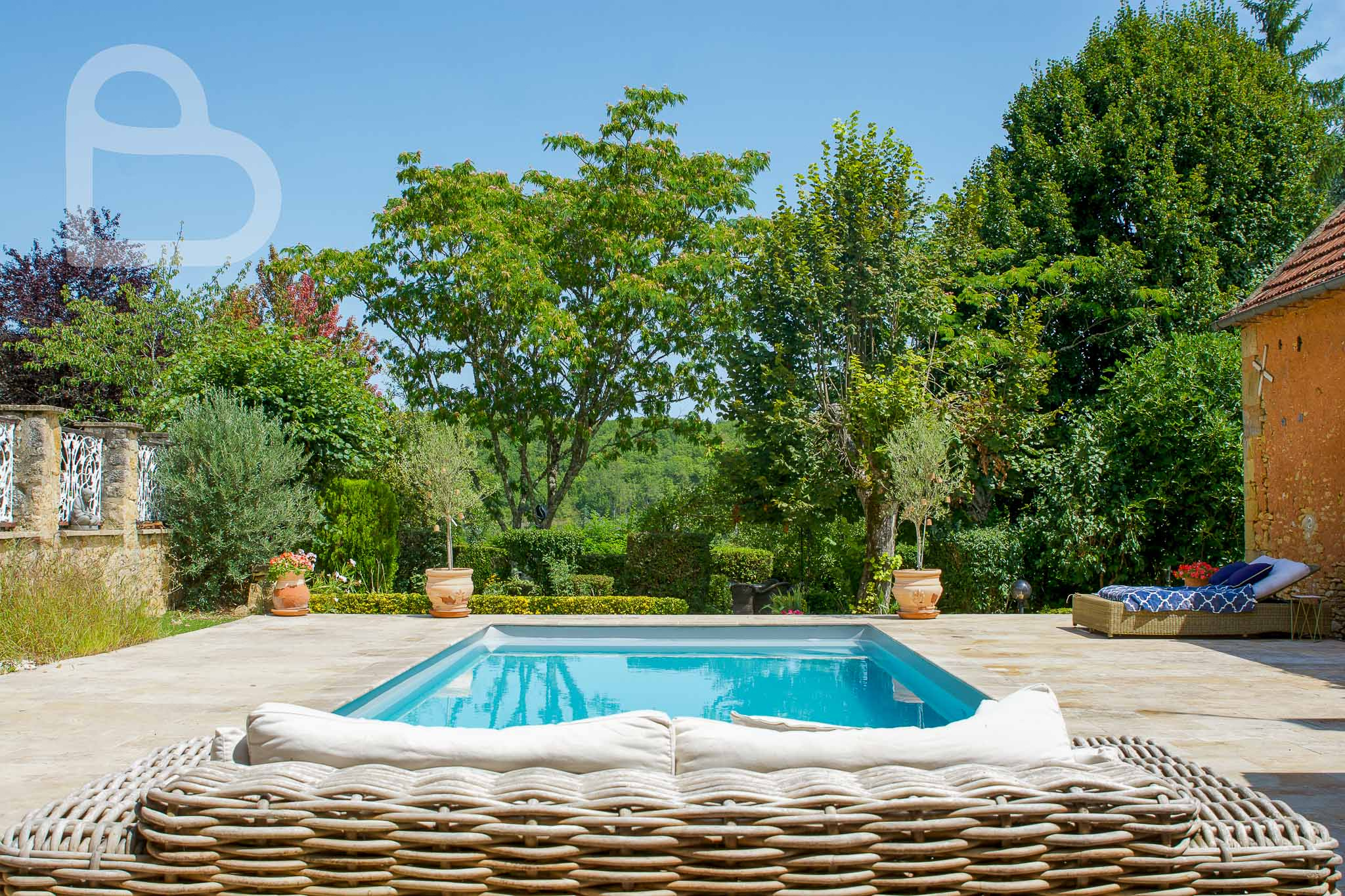 Le jardin paysager est un véritable havre de paix : arbres fruitiers, massifs fleuris, arbustes et allées sinueuses mènent aux dépendances, au kiosque et à la piscine chauffée récemment construite (10 x 4 m) avec terrasse en travertin. Bien que située dans le village, la propriété bénéficie d’un environnement intime, sans vis-à -vis, avec une vue imprenable sur les collines boisées.