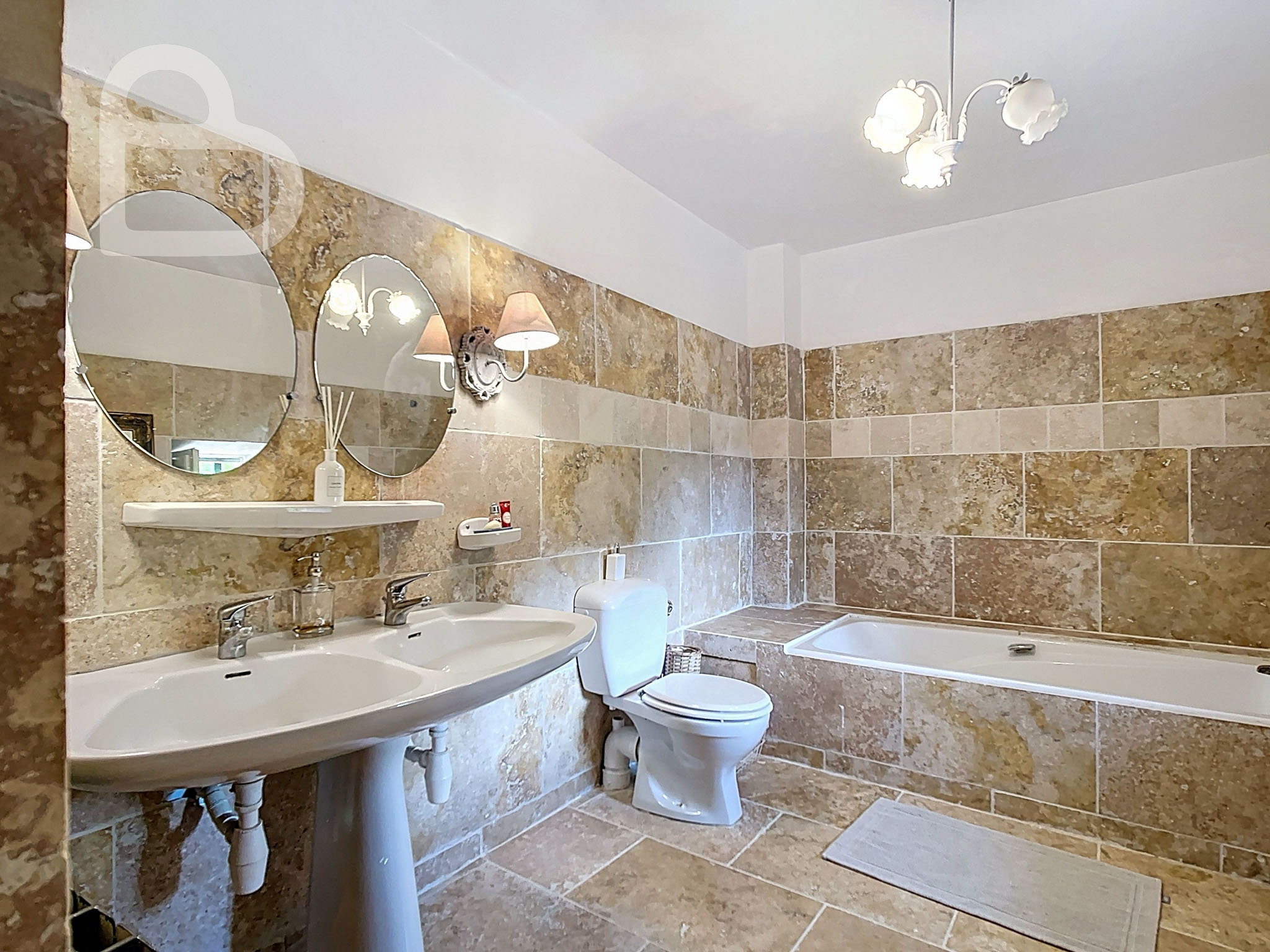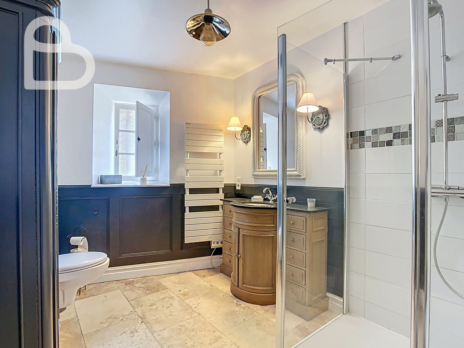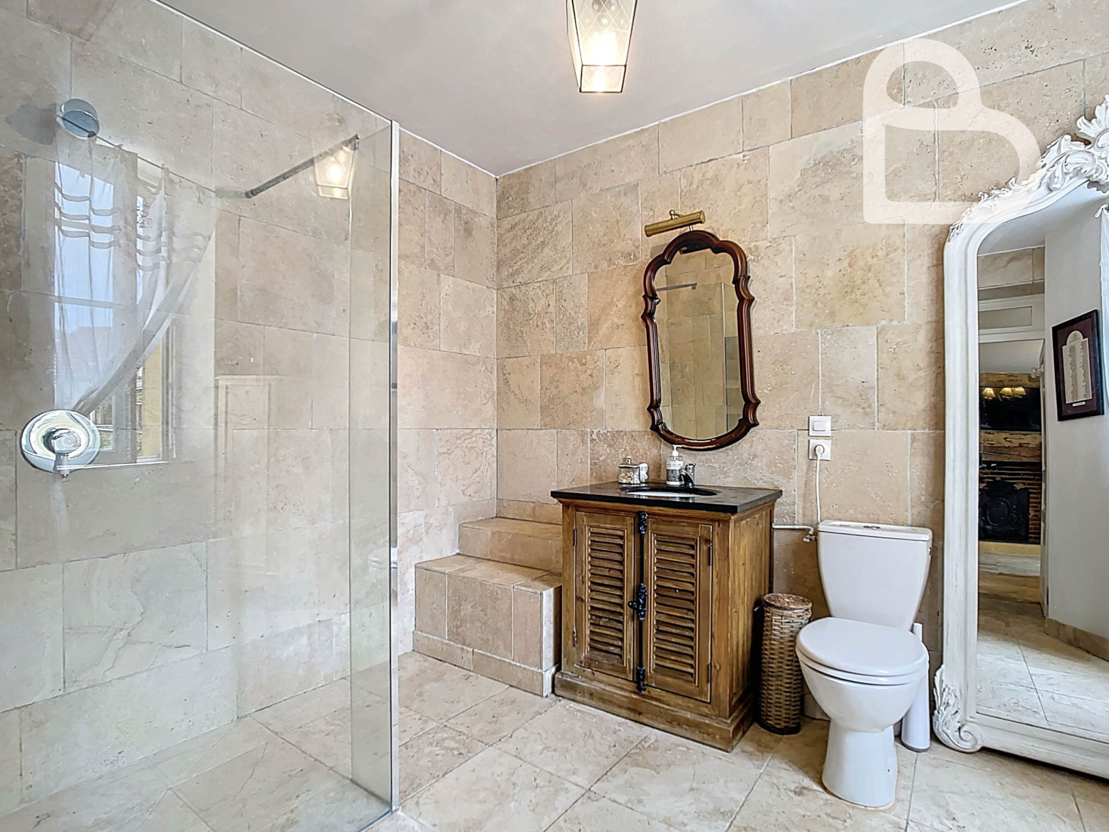 Toujours au rez-de-chaussée, une chambre généreuse avec un authentique évier en pierre bénéficie d’une salle d’eau attenante en travertin avec douche à l’italienne, lavabo et WC.