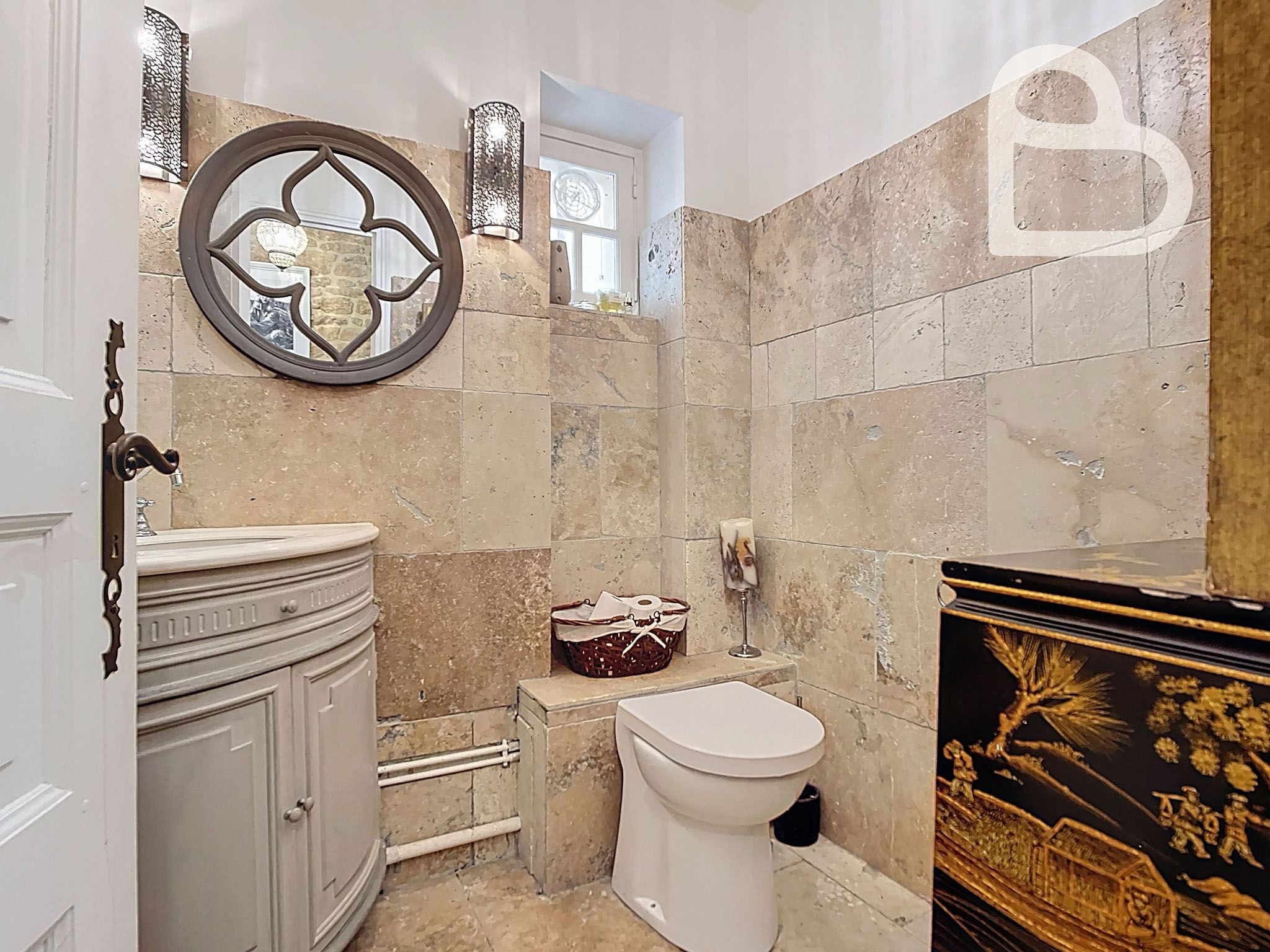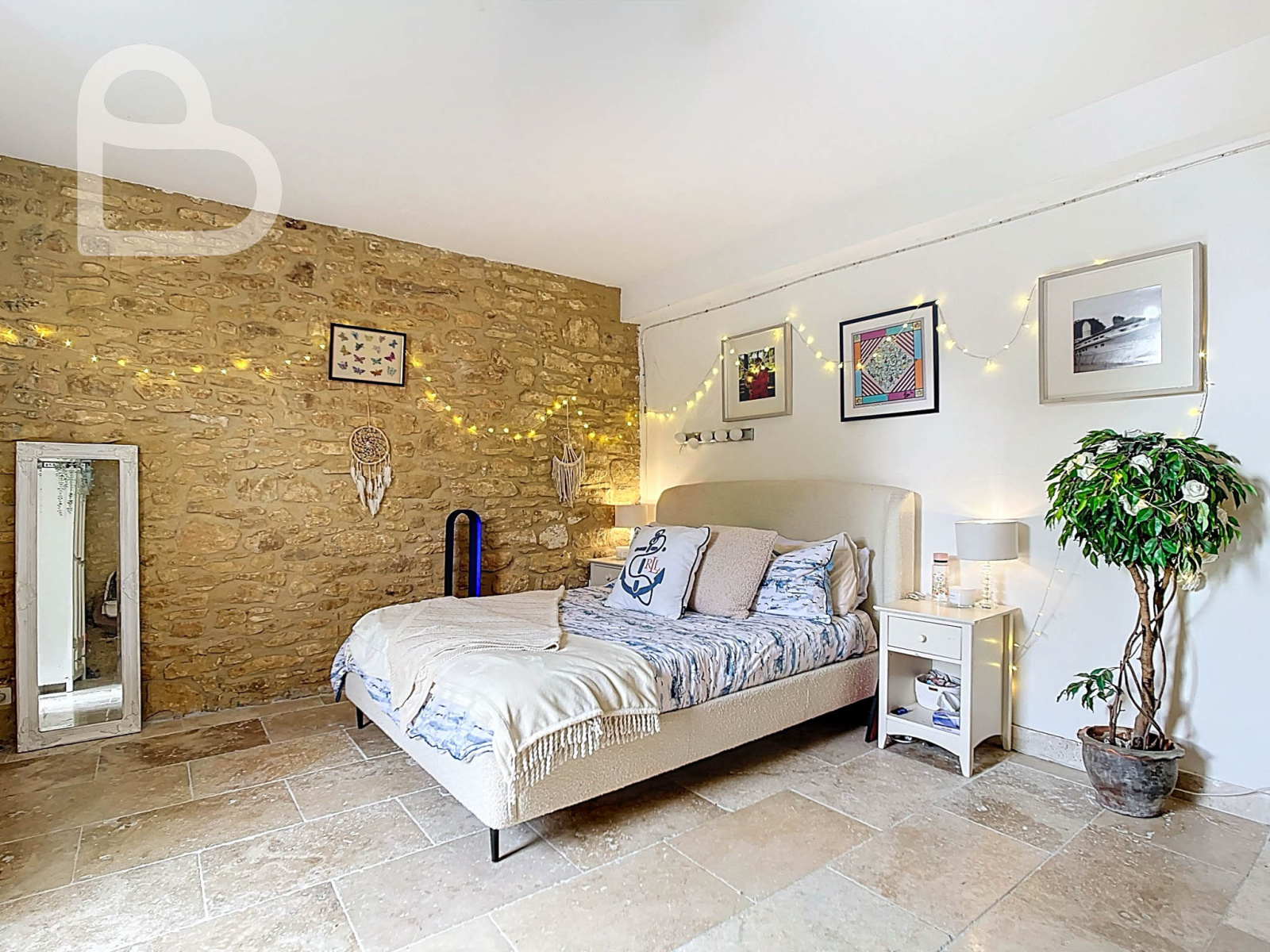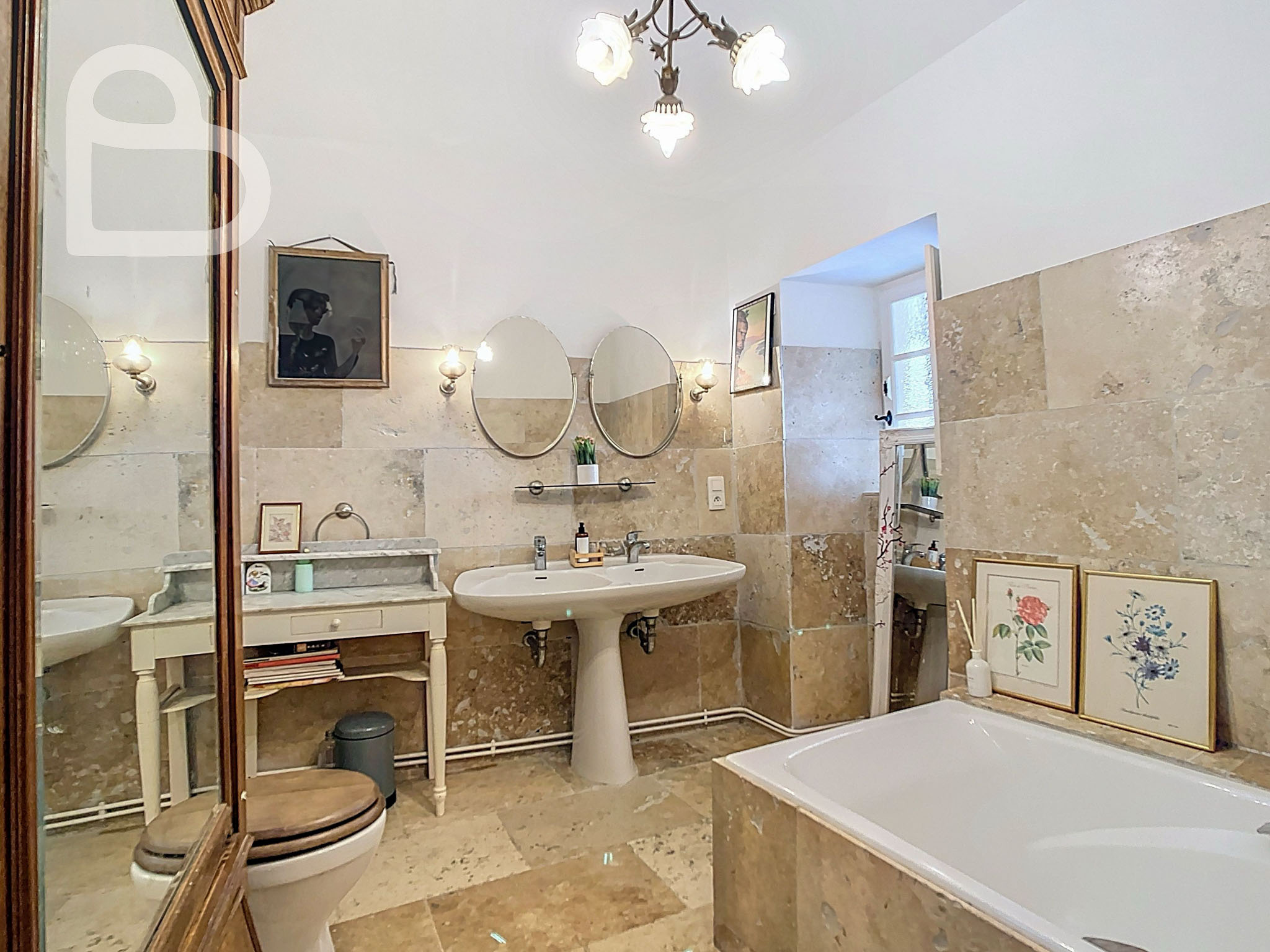 Toujours au rez-de-chaussée, une chambre généreuse avec un authentique évier en pierre bénéficie d’une salle d’eau attenante en travertin avec douche à l’italienne, lavabo et WC.