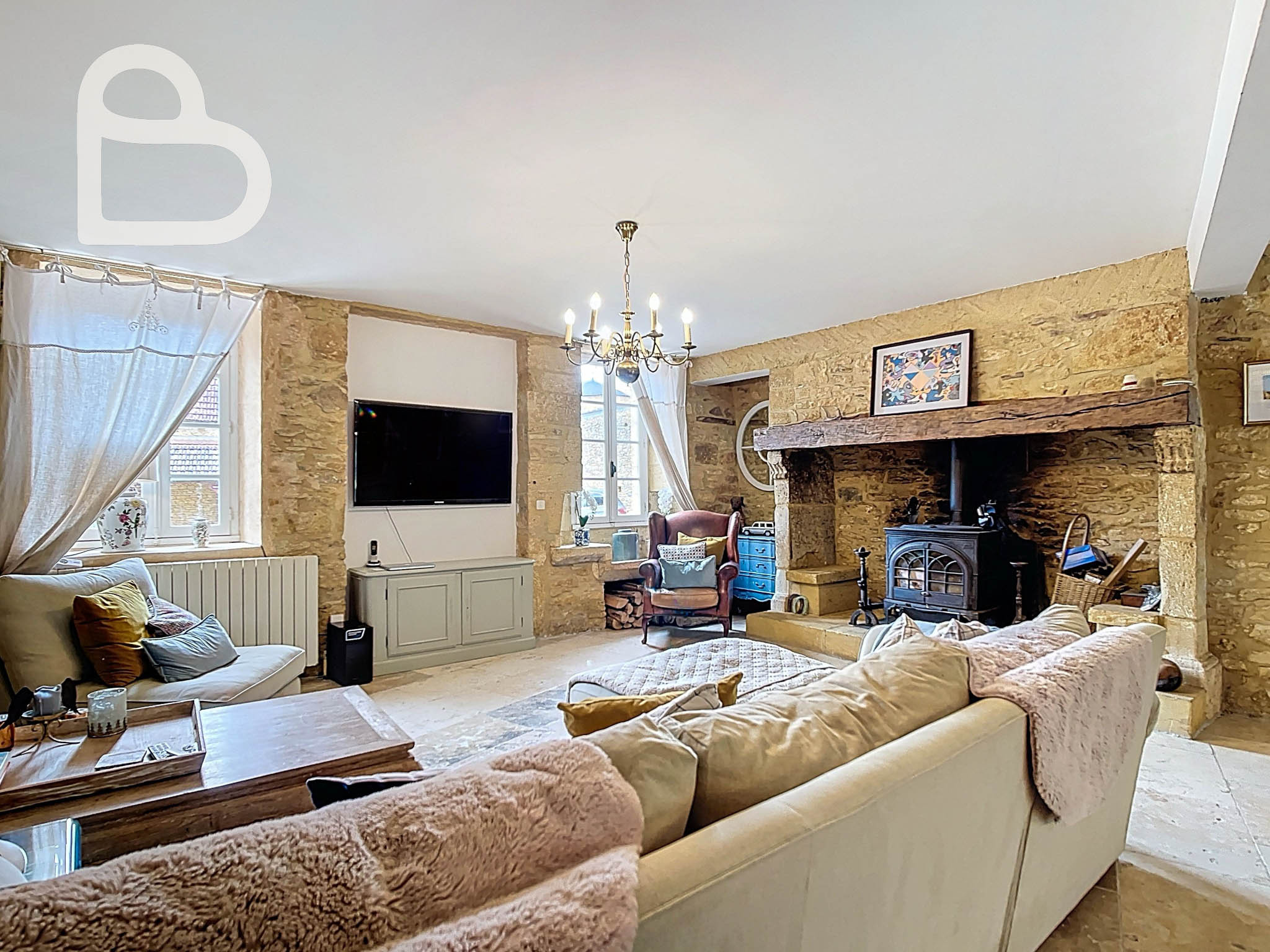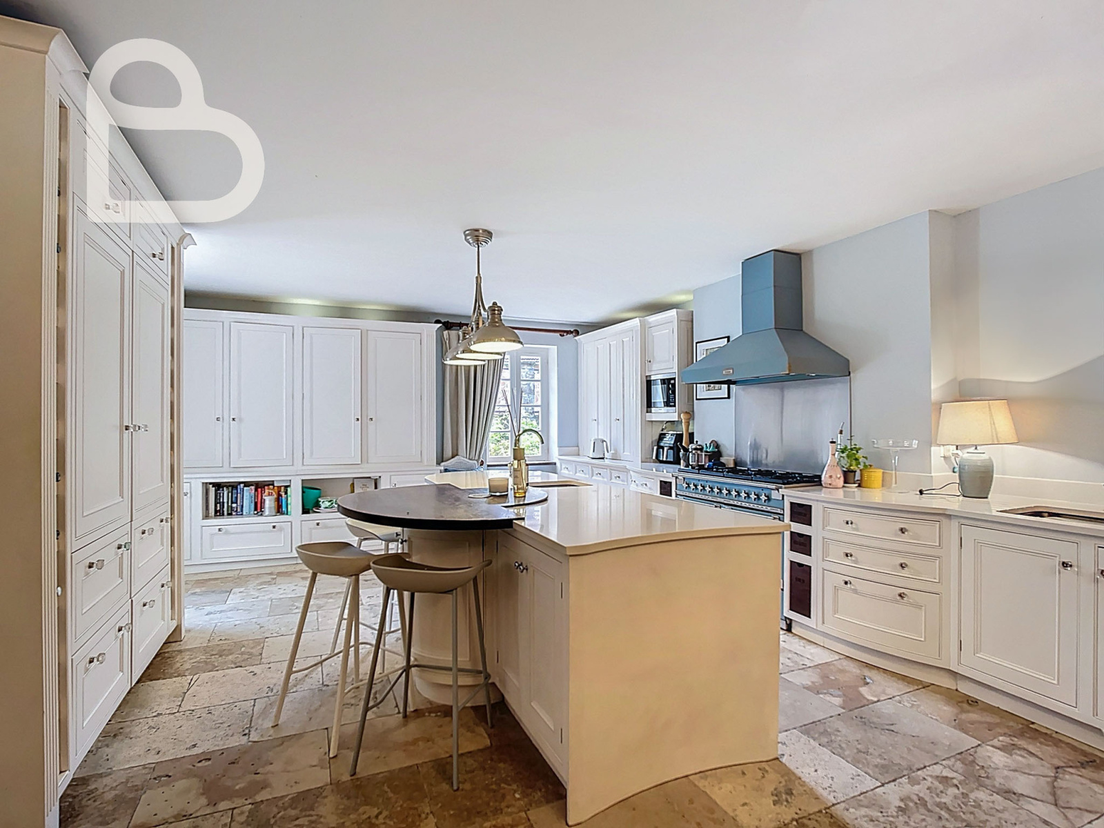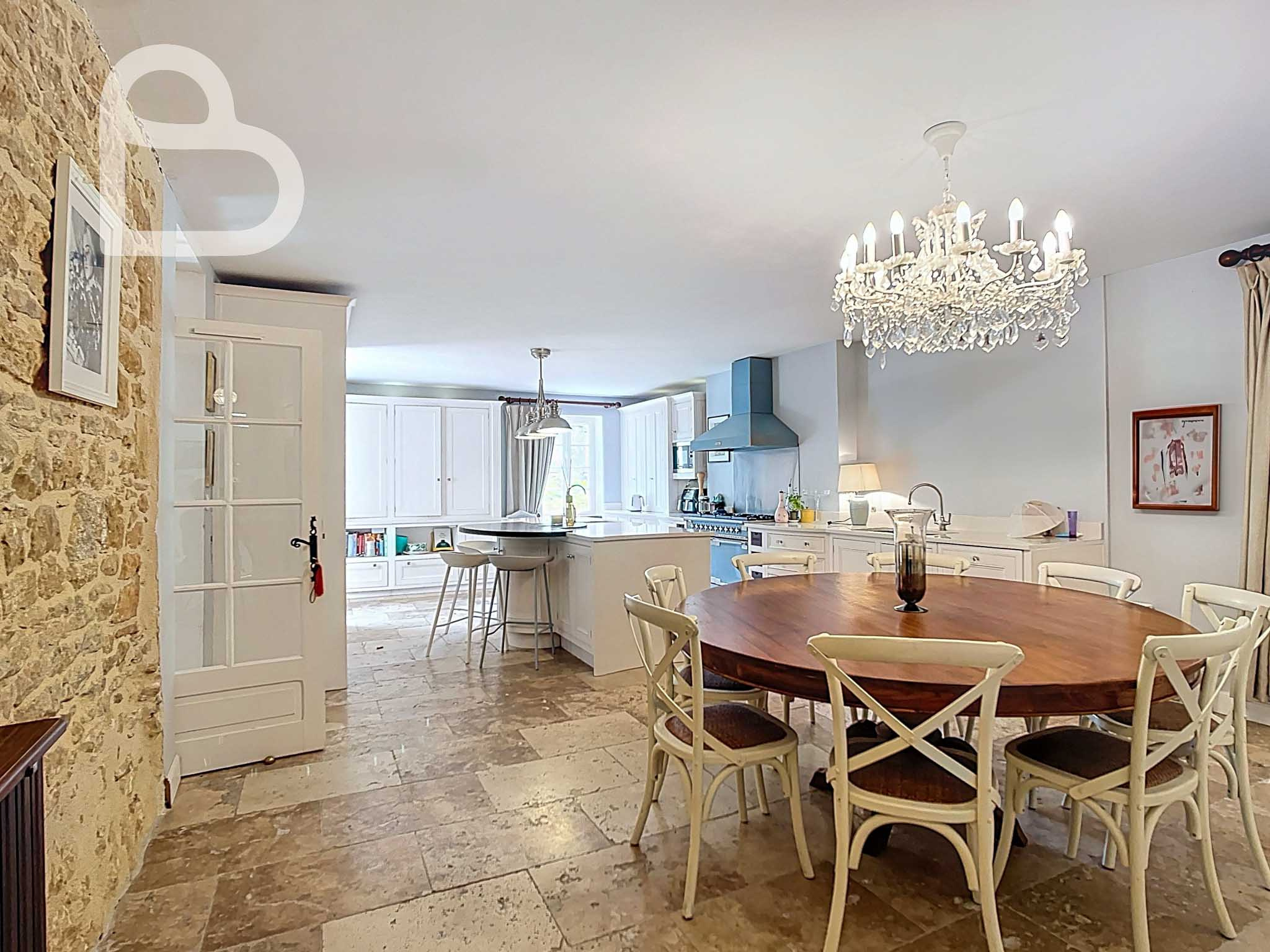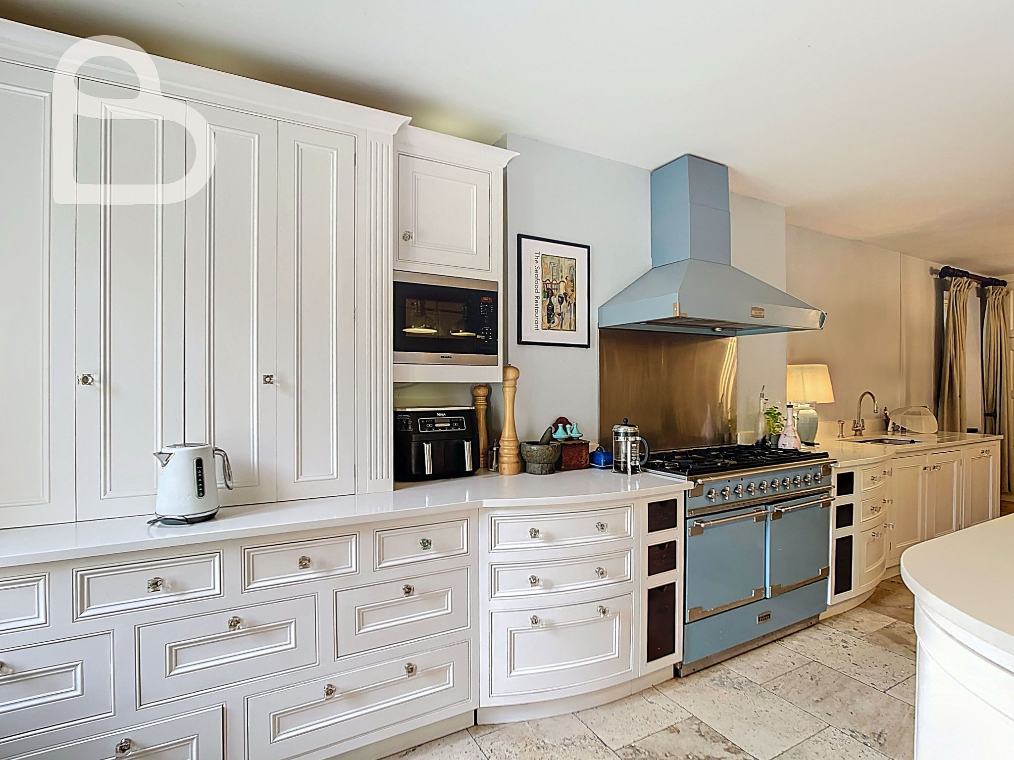 Dès l’entrée, un vaste hall avec banquette intégrée, rangements et toilettes indépendantes mène à la cuisine familiale et au salon. Véritable pièce maîtresse de la maison, la cuisine, parfaitement équipée, séduit par sa fonctionnalité et son confort : grand espace de rangement, piano de cuisson Falcon, deux éviers et un îlot central. Le grand salon attenant respire l’authenticité grâce à ses murs en pierre, ses sols en travertin et sa cheminée dotée d’un poêle à bois.