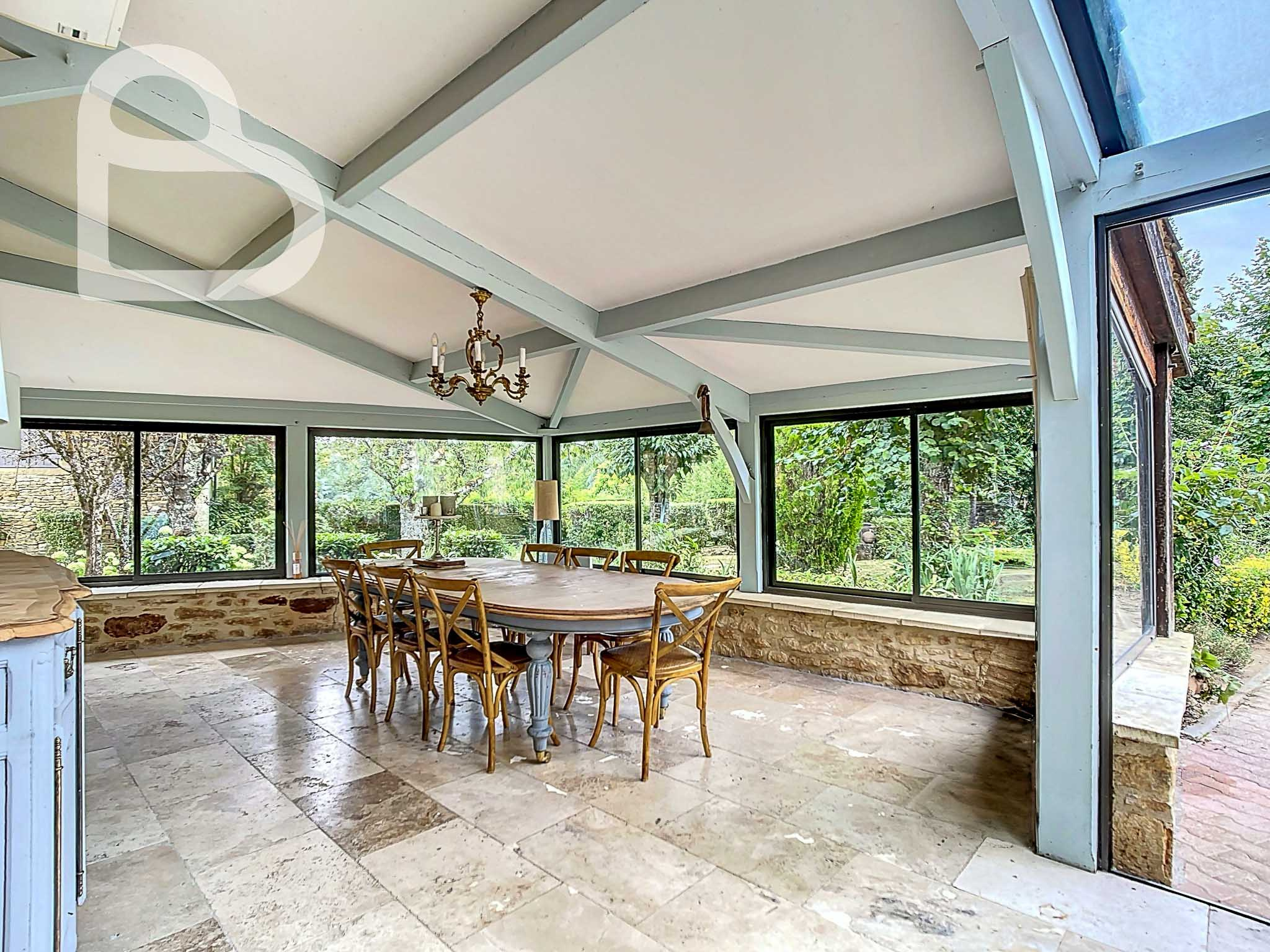 Accessible depuis la cuisine et le salon, la spacieuse véranda est l’espace préféré de la maison, utilisable en toute saison, offrant une vue dégagée et apaisante sur le jardin.