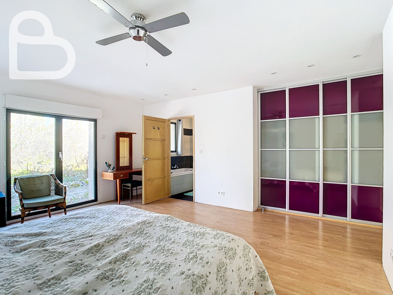 A l’autre côté du hall se trouve un garage de 9X9m avec deux portails automatique. Il y a des fenêtres, de l'eau et du chauffage, rendant la création d’une ou deux chambres supplémentaires assez facile. Vu la profondeur de cette pièce, cela pourrait même se faire en conservant une partie du garage.