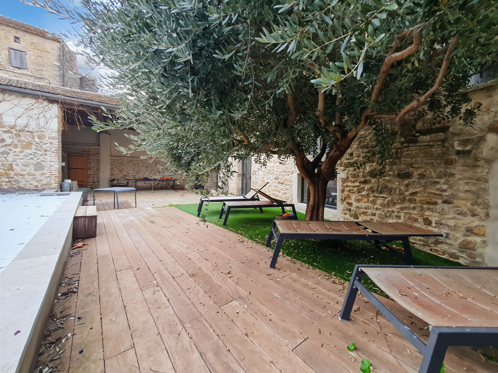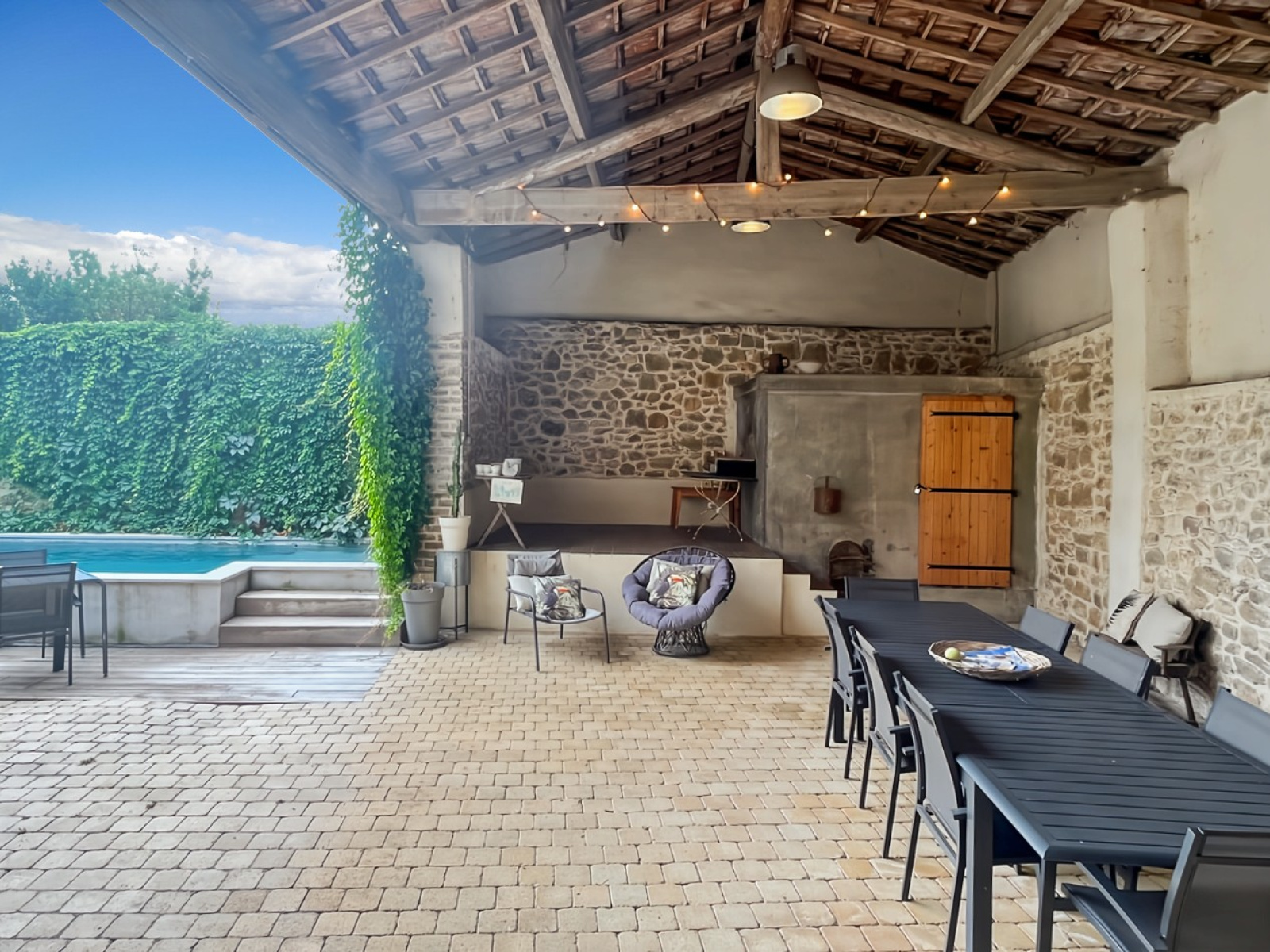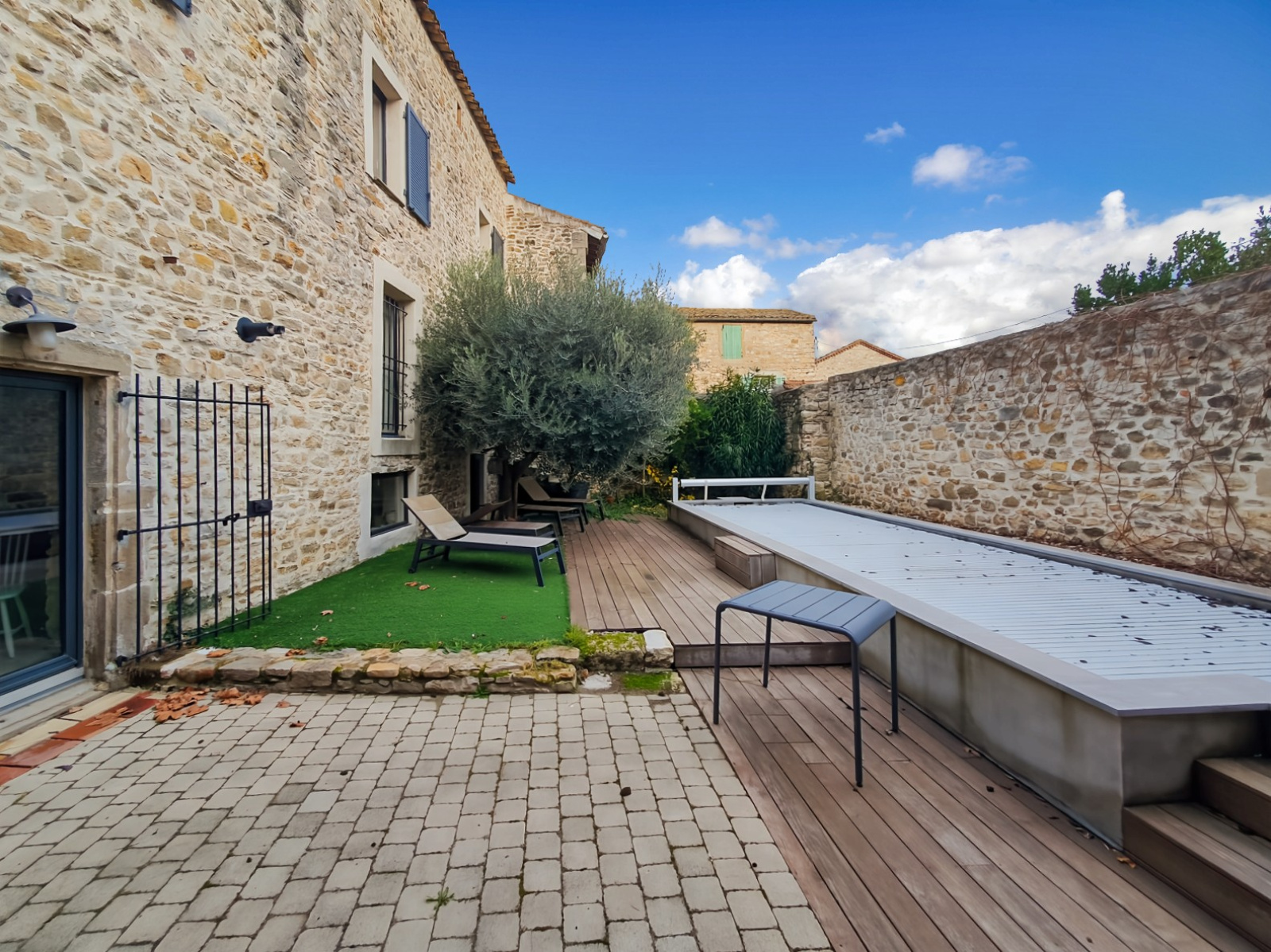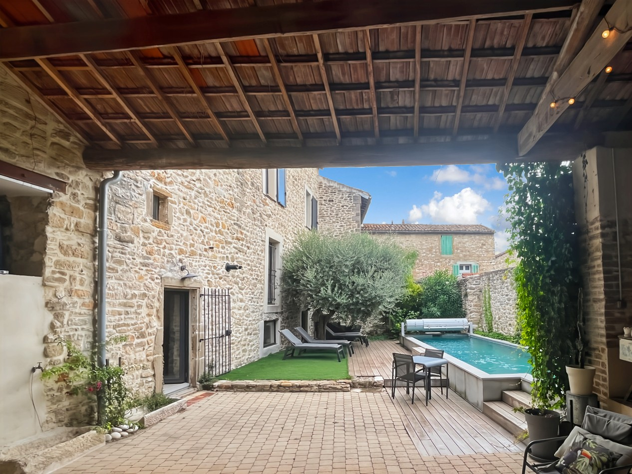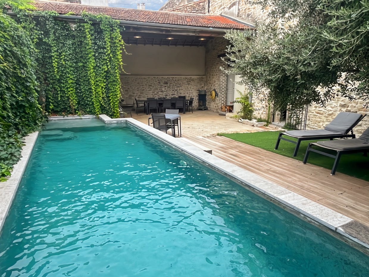 À 25 minutes d'Uzès et de Nîmes (Gare TGV et aéroport), découvrez cette magnifique maison de village entièrement rénovée avec goût. Cette propriété de charme, répartie sur trois niveaux, offre 8 pièces spacieuses et lumineuses.Le rez-de-chaussée s'ouvre sur un vaste séjour baigné de lumière, prolongé par une superbe cuisine équipée en décroché. Une grande entrée mène à un immense auvent couvert et aménageable, parfait pour vos moments de détente, ainsi qu'à un garage avec portail automatique et un wc. Au premier étage, vous trouverez un deuxième salon ainsi qu'un bureau. Le deuxième étage abrite quatre chambres confortables, une salle de bains + douche moderne et une buanderie pratique. Le charme de cette maison réside également dans son extérieur : un joli terrain arboré de303 m² accueille une piscine de 9x2,5 mètres.