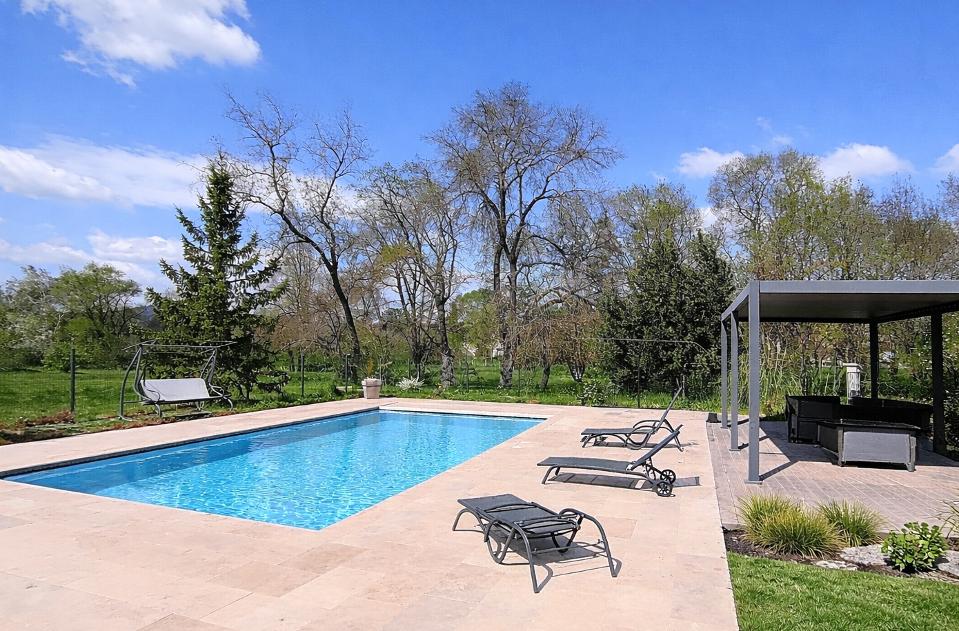 Terrain de plus de 2000 m² avec piscine, plage, pergola et espaces arborés, environnement calme et agréable.