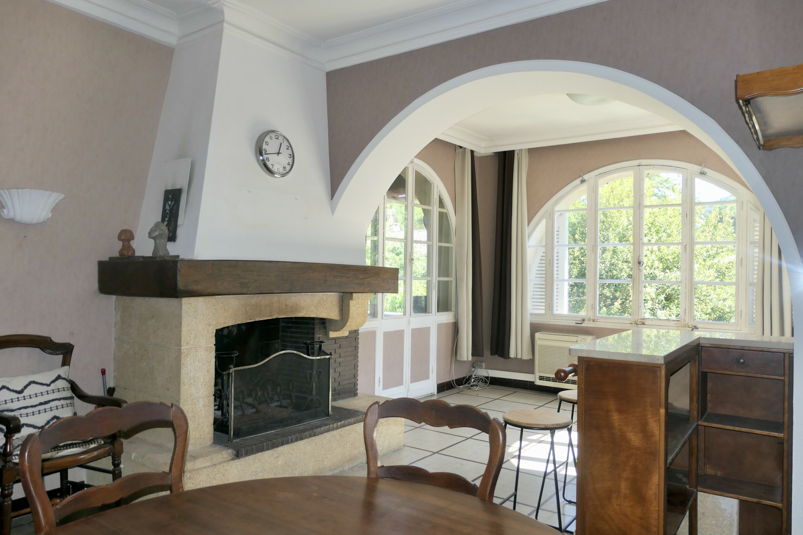 - Le 1er logement, aux jolis éléments architecturaux et avec ses hauts plafonds,a pour distribution 1 belle pièce de réception avec cheminée et accès, par ses généreuses ouvertures cintrées, sur 1 charmante et vaste terrasse avec vue dégagée, 2 chambres, 1 bureau, 1 cuisine, 1 salle d’eau et des toilettes séparées.