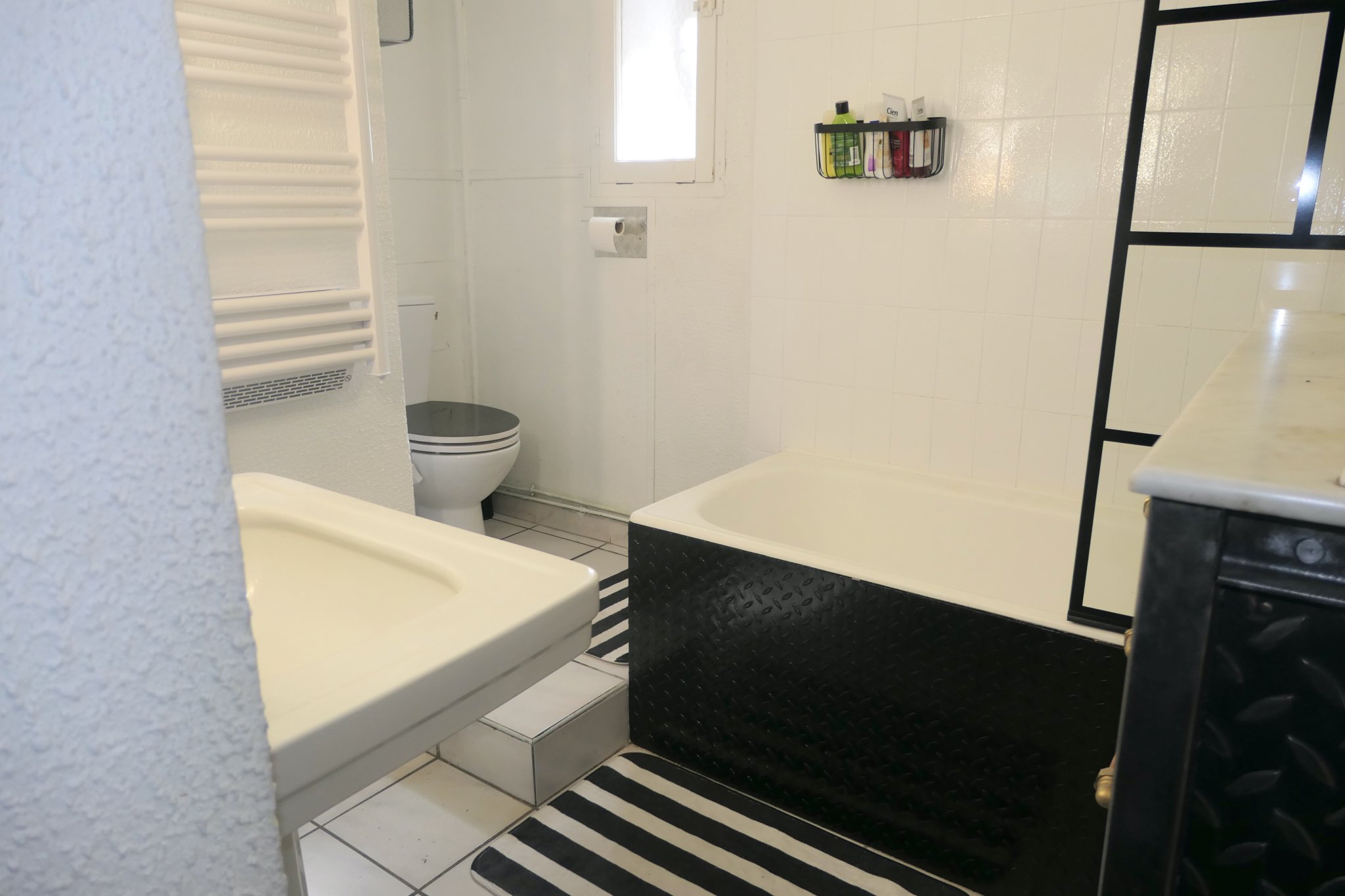 - Le dernier logement , avec accès direct au joli jardin et sa terrasse, est composé d’une grande pièce de réception en L , de 2 chambres, d’une cuisine séparée et d’une salle de bain avec toilettes.