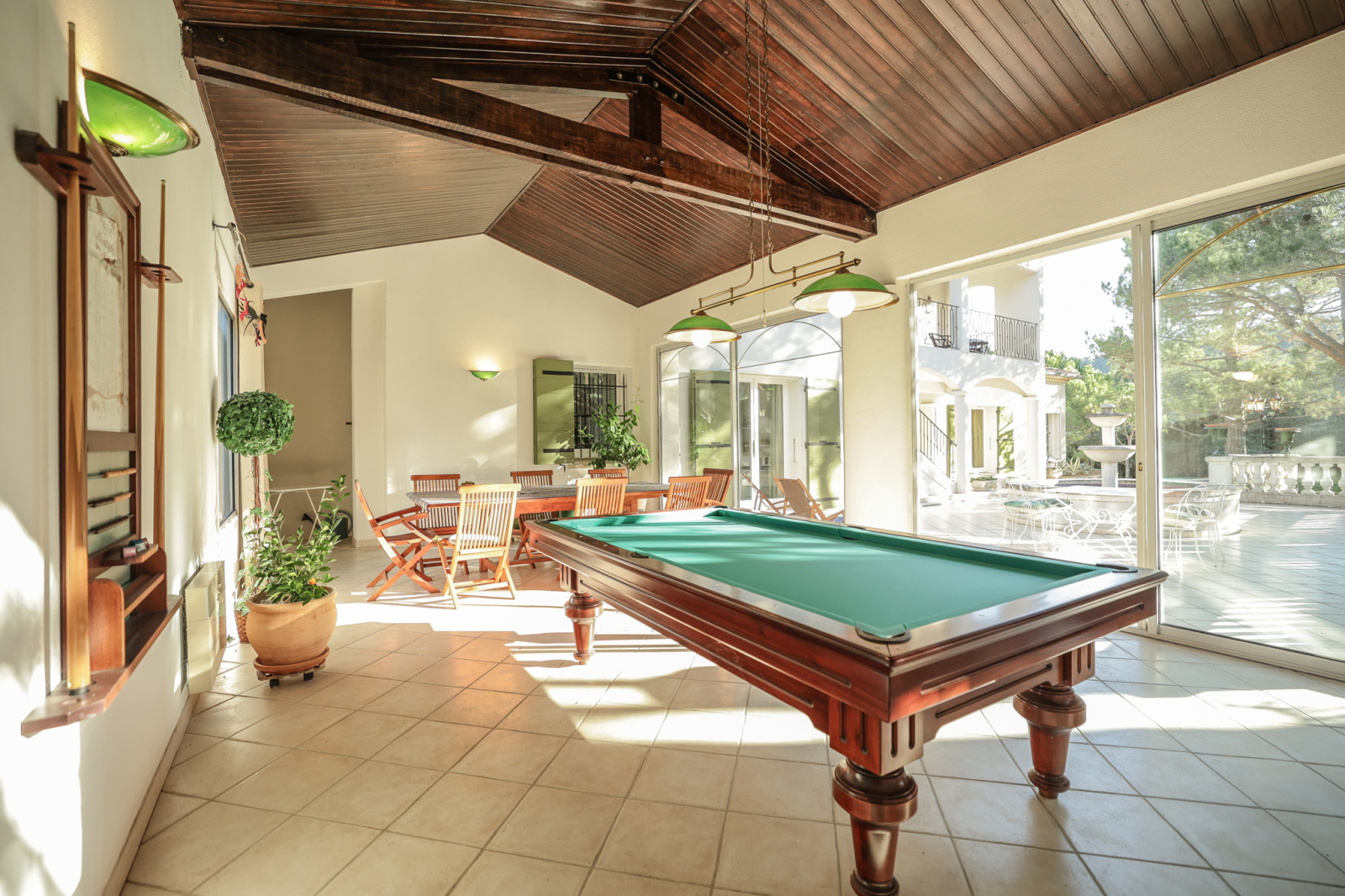 Accompagné d’une cheminée en marbre propice aux soirées chaleureuses, le salon de réception de 68 m² s’ouvre sur une terrasse baignée de soleil. Vous serez charmés notamment par sa bibliothèque, bel espace de détente à la vue inspirante, son espace billard en véranda, sa suite parentale de 49 m² avec dressing et salle de bain complètent ce décor raffiné.