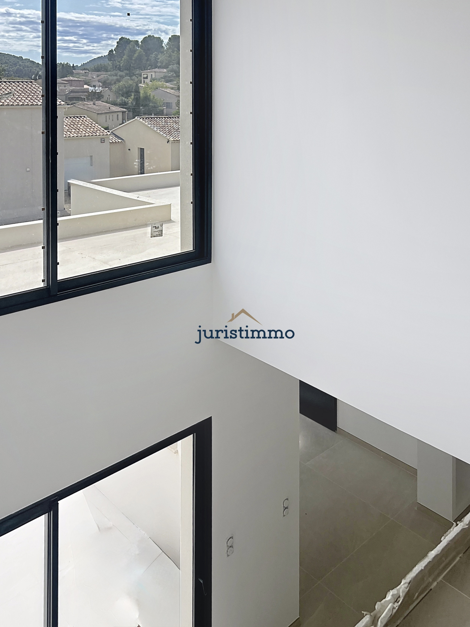 À l’étage, une passerelle en surplomb du séjour prolonge la perception des volumes et crée une relation directe avec la pièce de vie. Face à elle, une large baie vitrée tournée vers le Mont Ventoux et les collines environnantes apporte une luminosité particulièrement remarquable et laisse le regard se porter librement vers le paysage, avec une agréable sensation de surplomb.
