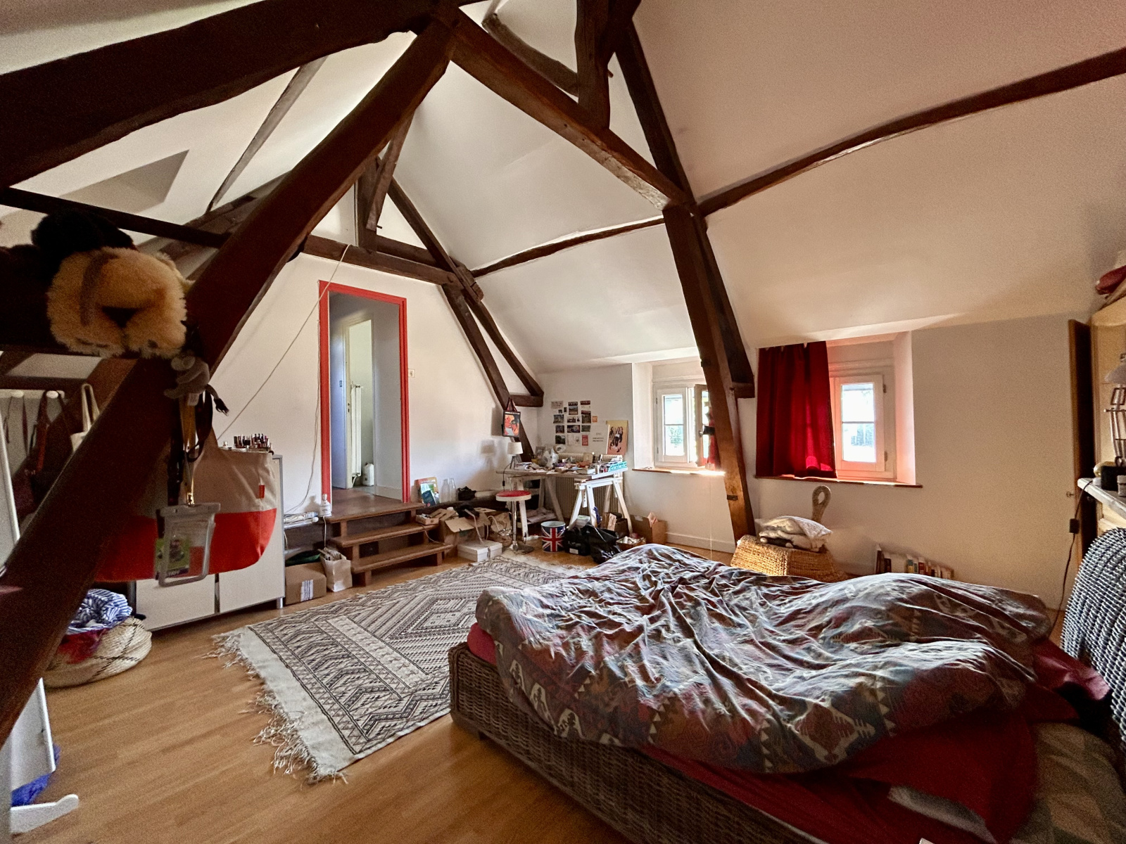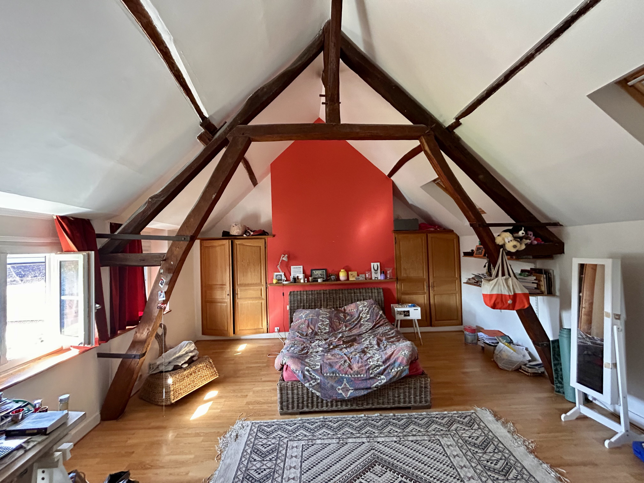 À l’étage, la maison propose trois belles chambres, dont une spacieuse de 30 m² pouvant faire office de suite parentale ou de grand espace bureau. Vous y trouverez également une salle d’eau et une salle de bain pour plus de confort.