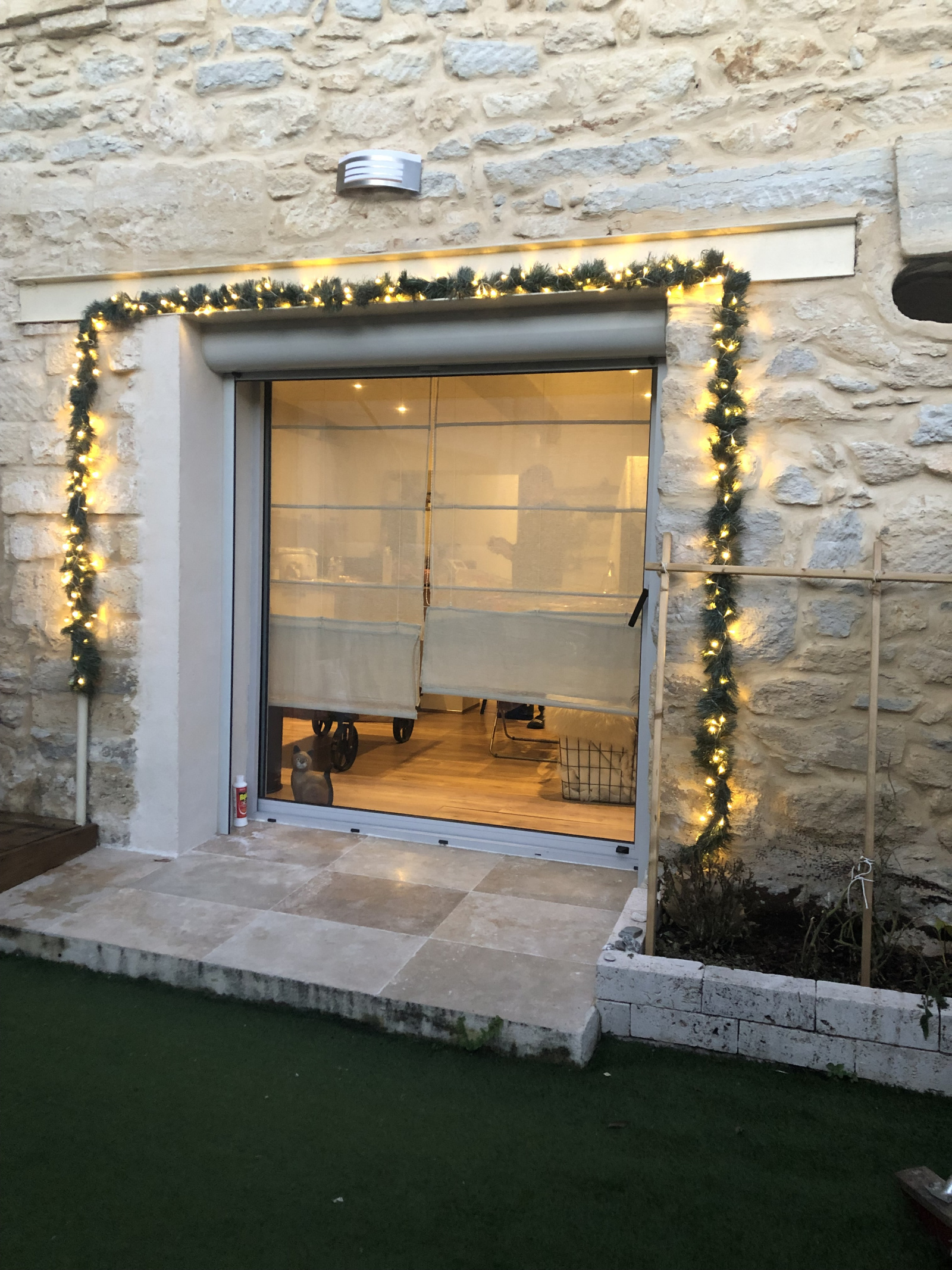 En plain-pied : un bel espace de vie ouvert sur la cour et la terrasse, une cuisine américaine équipée, une chambre avec sa salle d'eau, un wc et un espace de rangement.