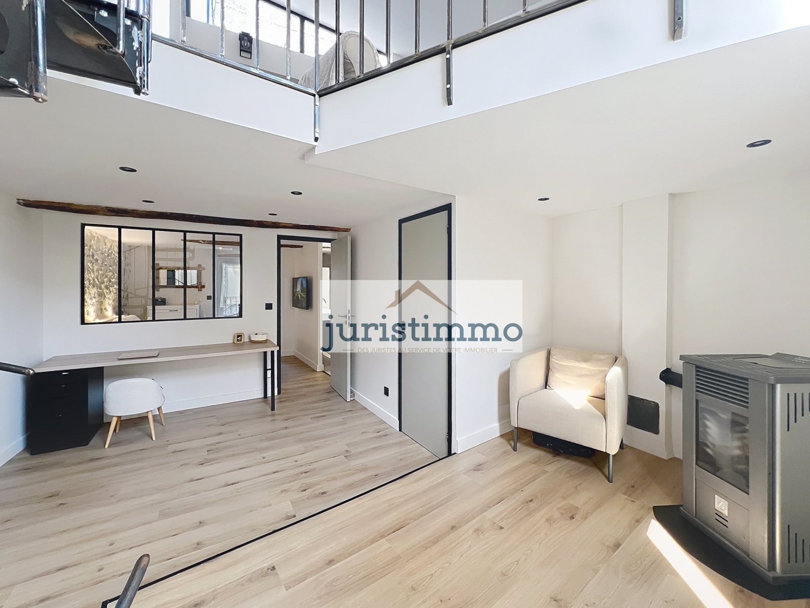 Un somptueux escalier en fer forgé sur mesure mène à un espace bibliothèque / bureau baigné de lumière, chauffé par un poêle à granulés.