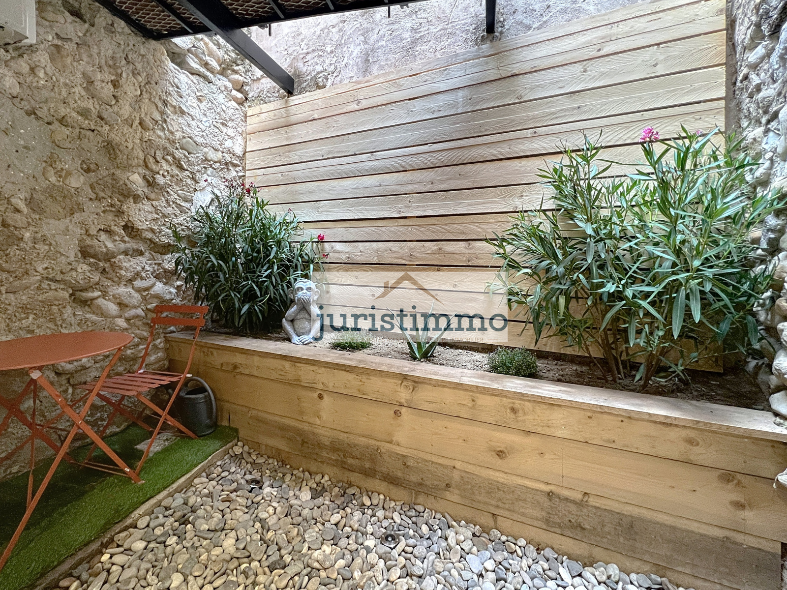 Une cour intime en pierre de 7 m², parfaite pour un petit déjeuner, complète l’ensemble, avec un coin buanderie pratique et un vaste rangement.