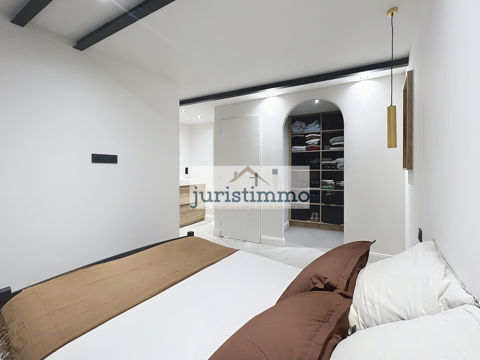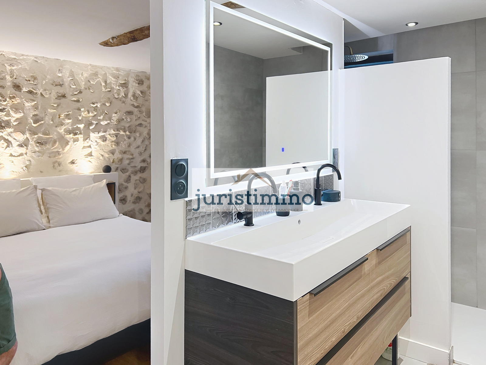 Cet espace indépendant comprend une chambre, un dressing ainsi qu'une pièce avec double-vasque et meuble, pouvant accueillir une douche ou des WC.