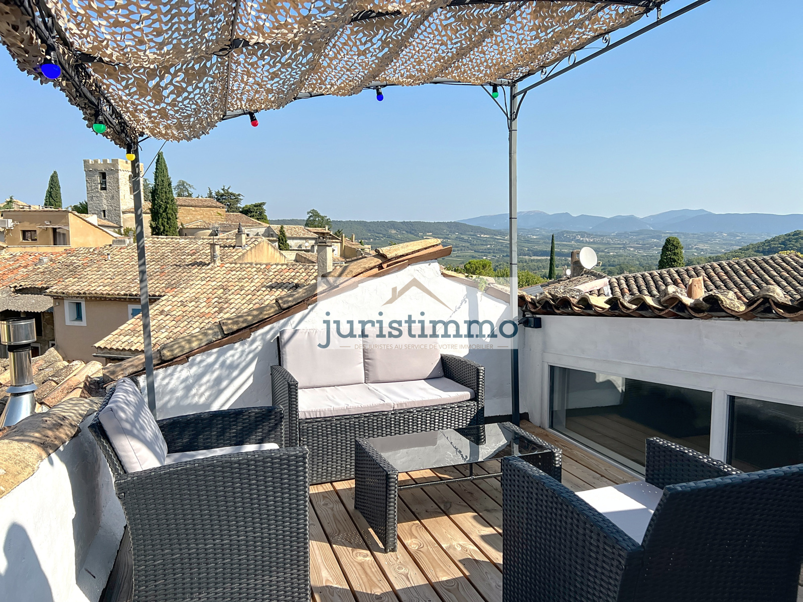 Le point d'orgue des lieux : une terrasse panoramique de 20 m² , belvédère d'exception, offre une vue à 360° sur le village, les collines et les vignobles. Un lieu magique pour admirer les couchers de soleil ou siroter un verre de rosé en été.