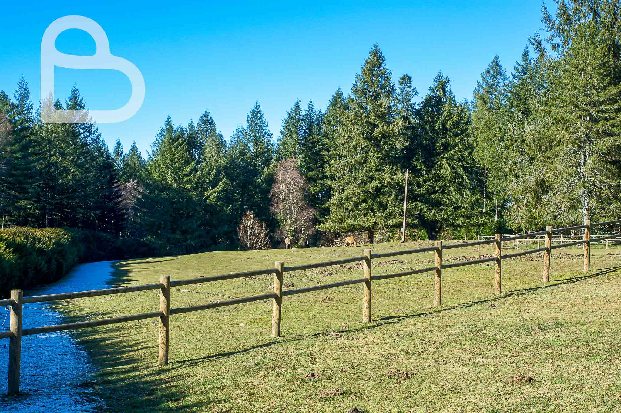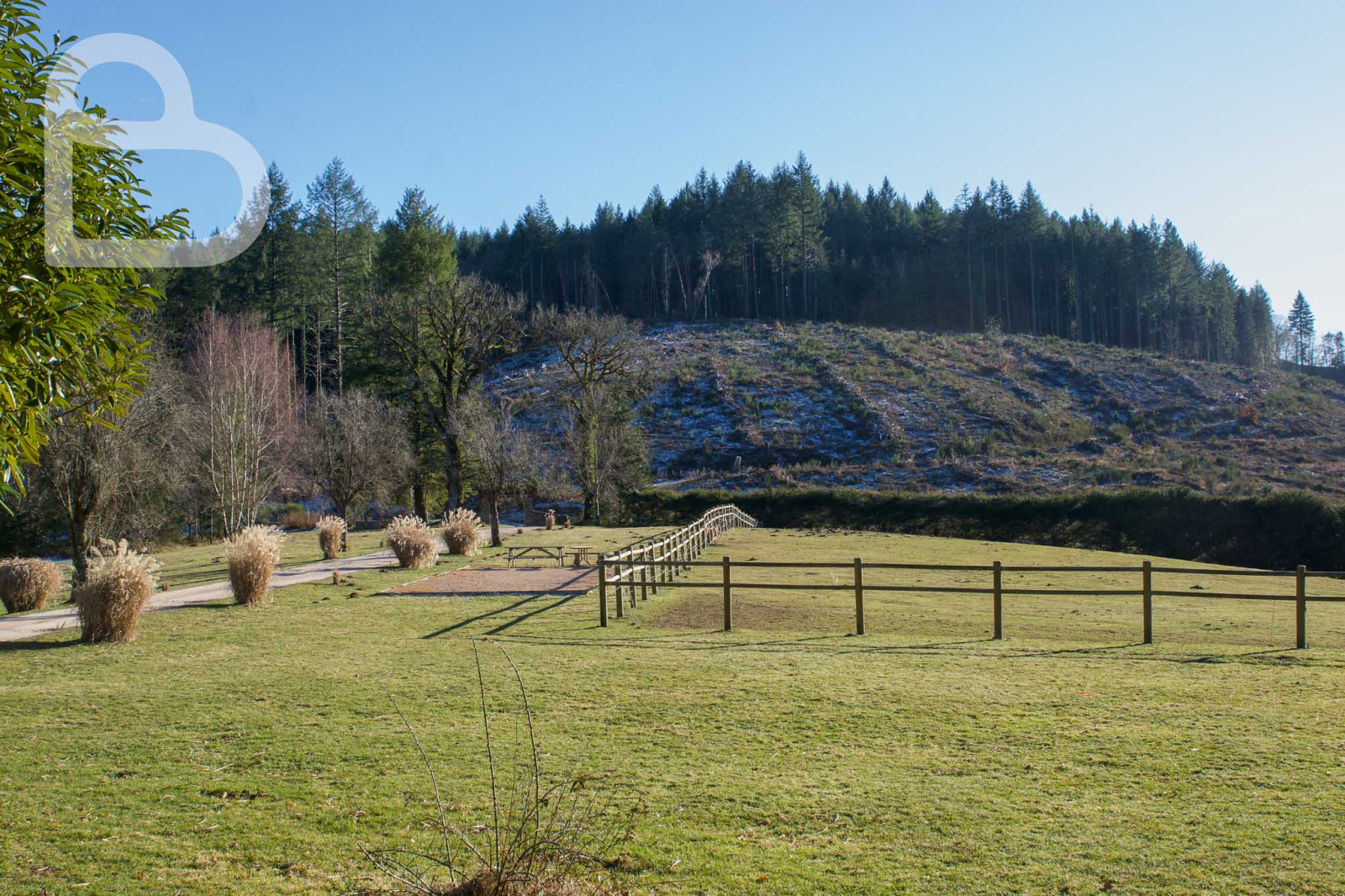 S’étendant sur 4,5 hectares, le domaine est majoritairement constitué de prairies pour chevaux et entièrement clôturé, ce qui en fait un lieu idéal pour les amoureux des animaux. Un hectare de bois, situé de l’autre côté de la route, fait également partie de la propriété.