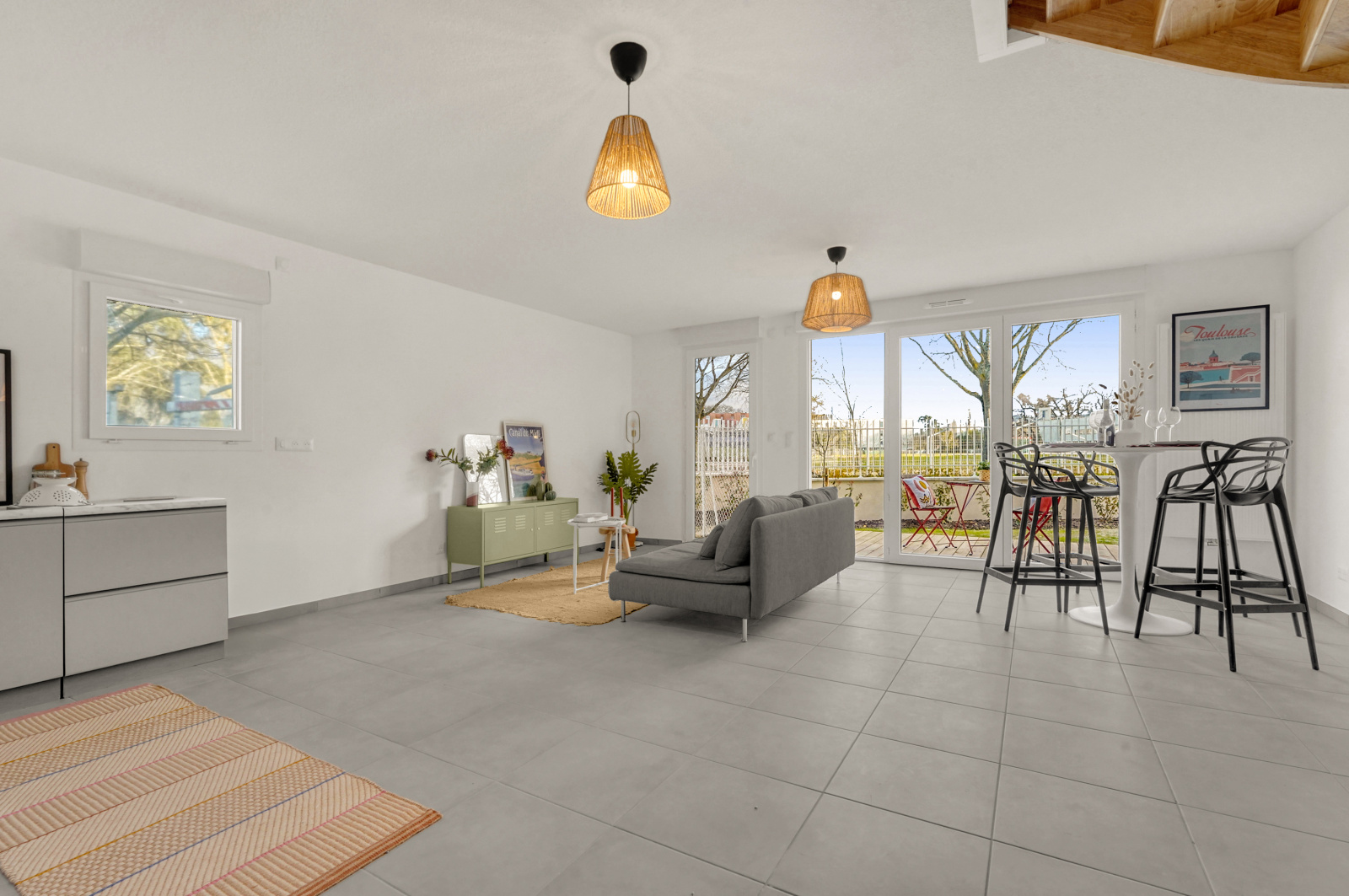 Le rez de chaussée se compose d'un cellier, d'un WC, d'un séjour cuisine très lumineux de 30 M² avec terrasse et petit jardin plein Sud.