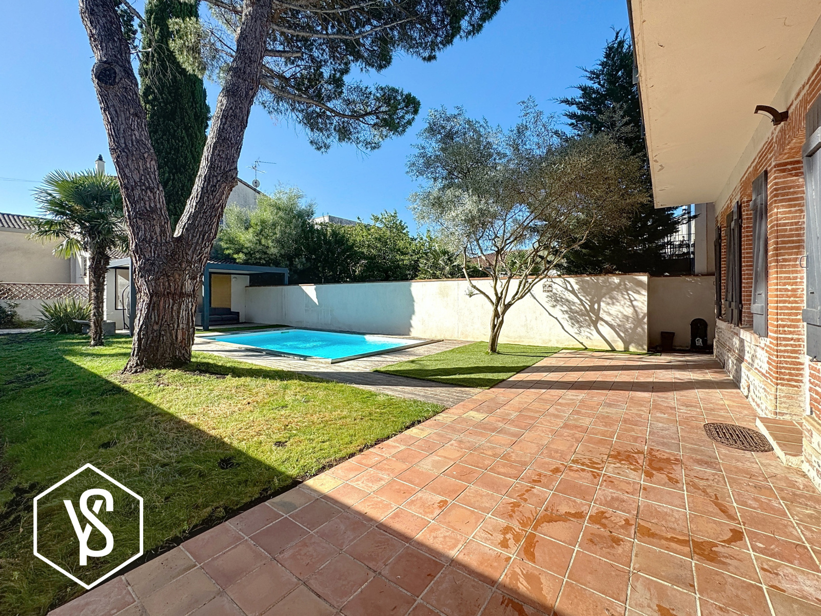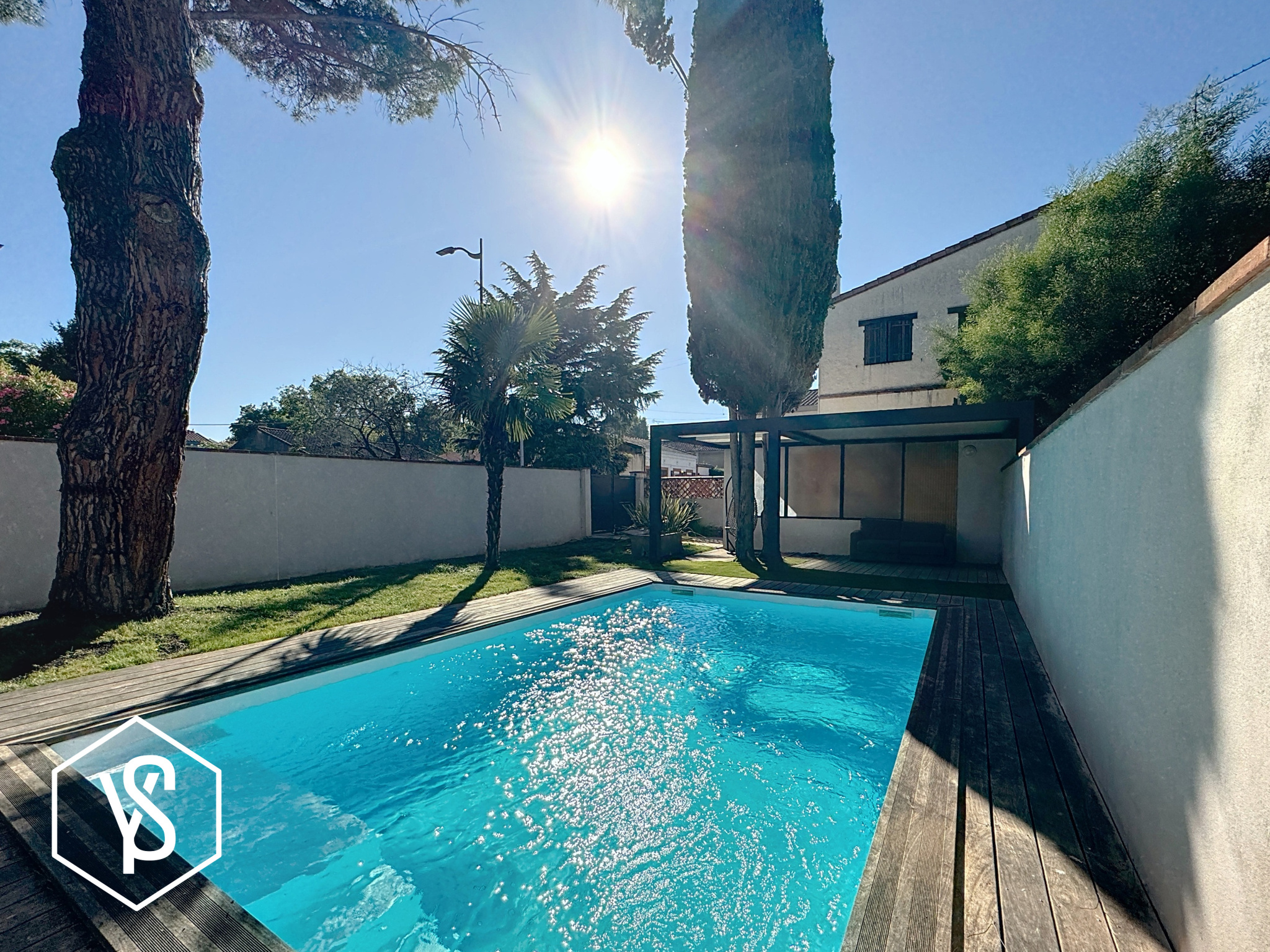 A l'extérieur : piscine 4x7 sans vis à vis, terrasse sous pergola bioclimatique et abri pour rangement ou voiture.