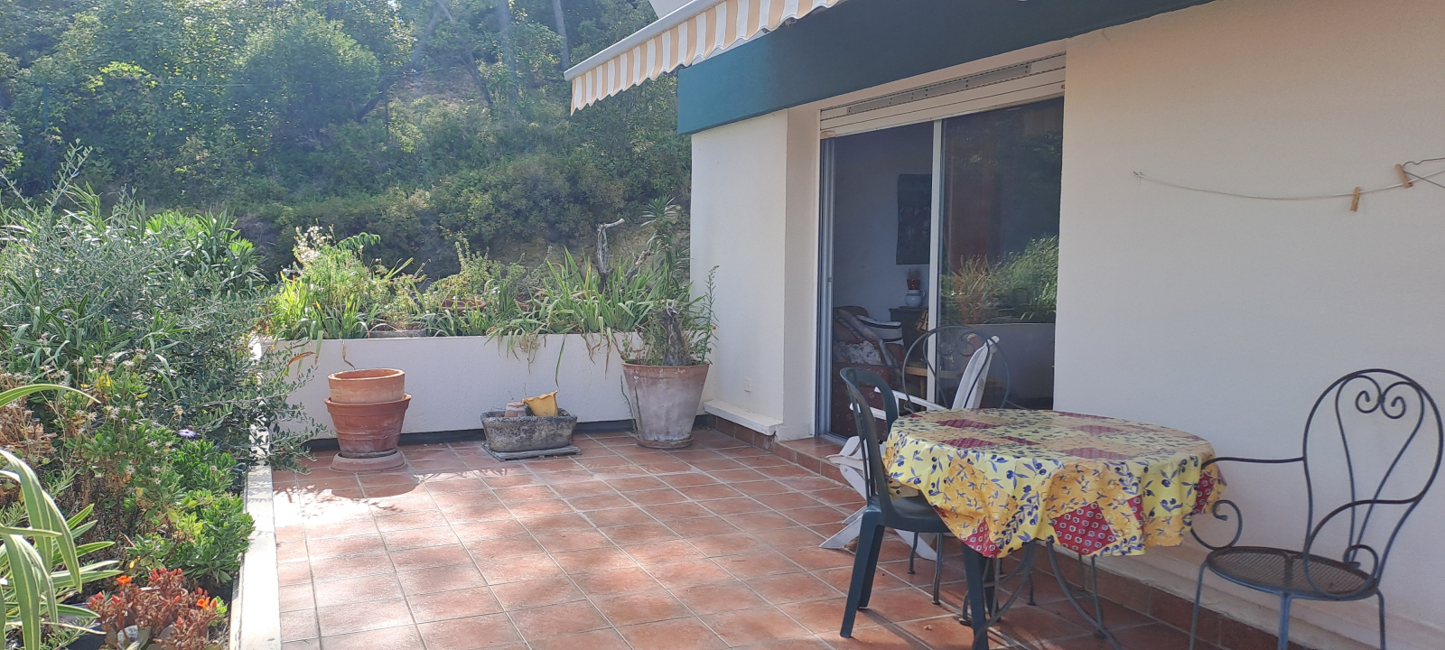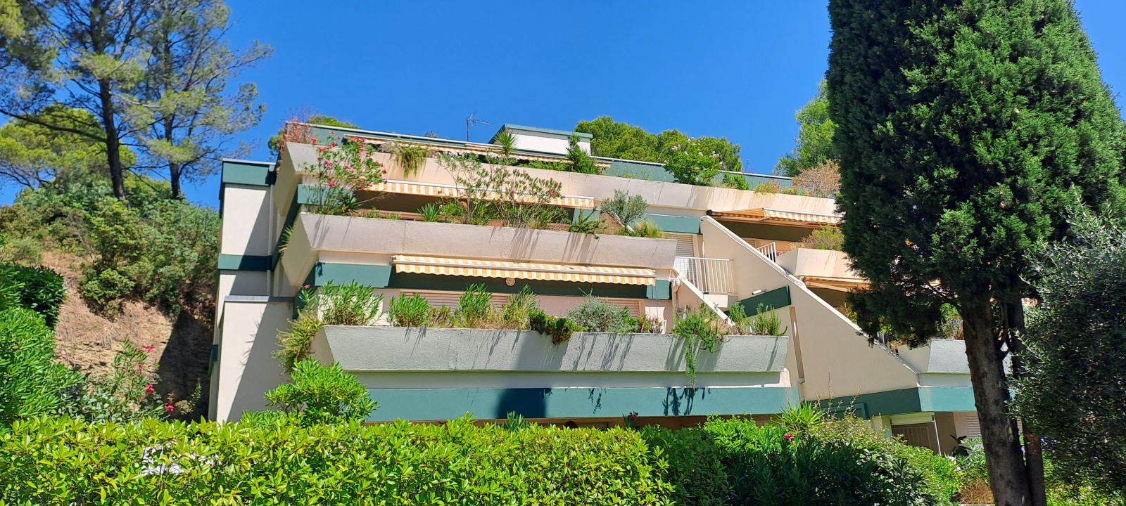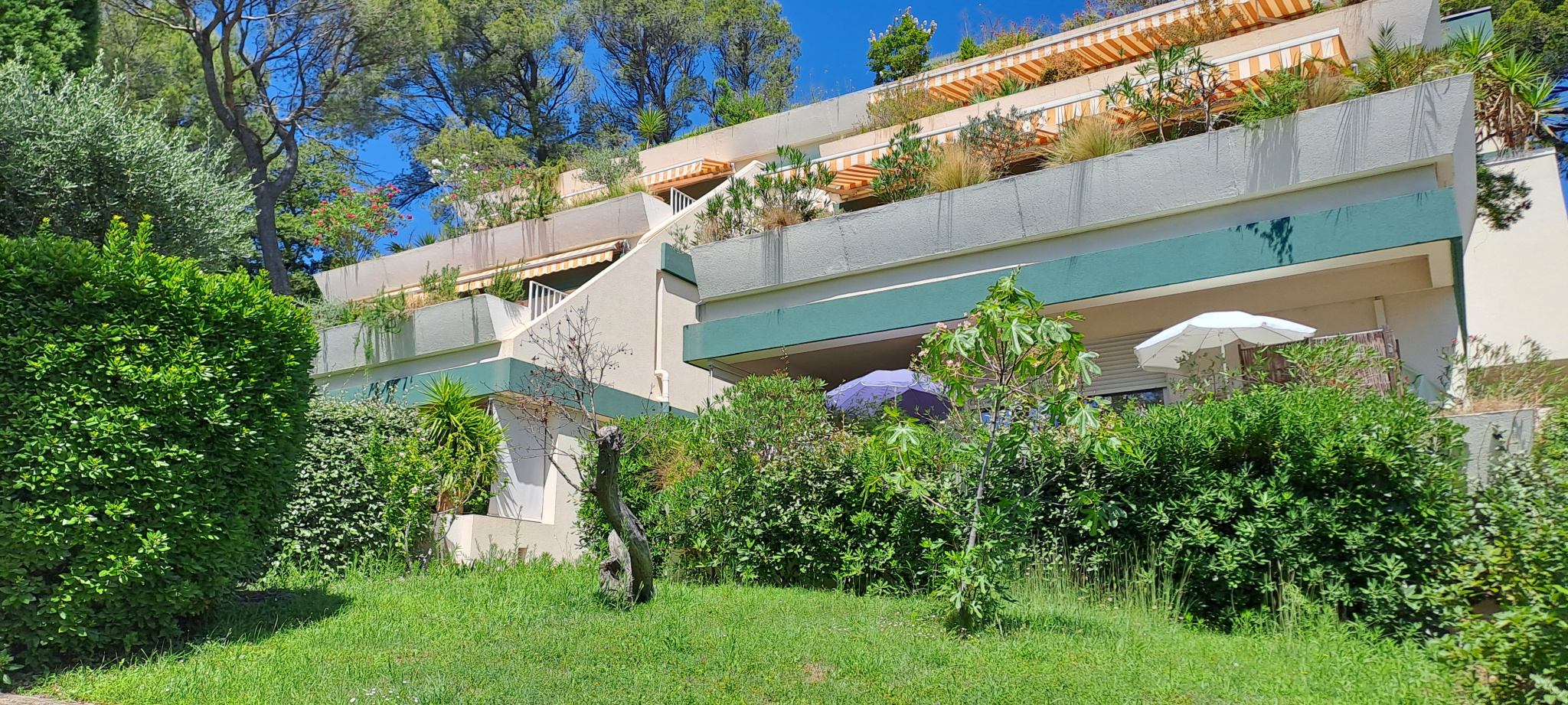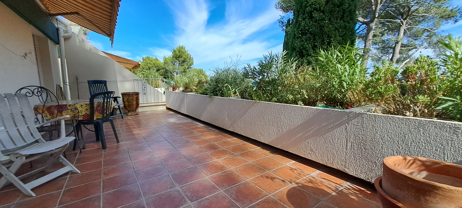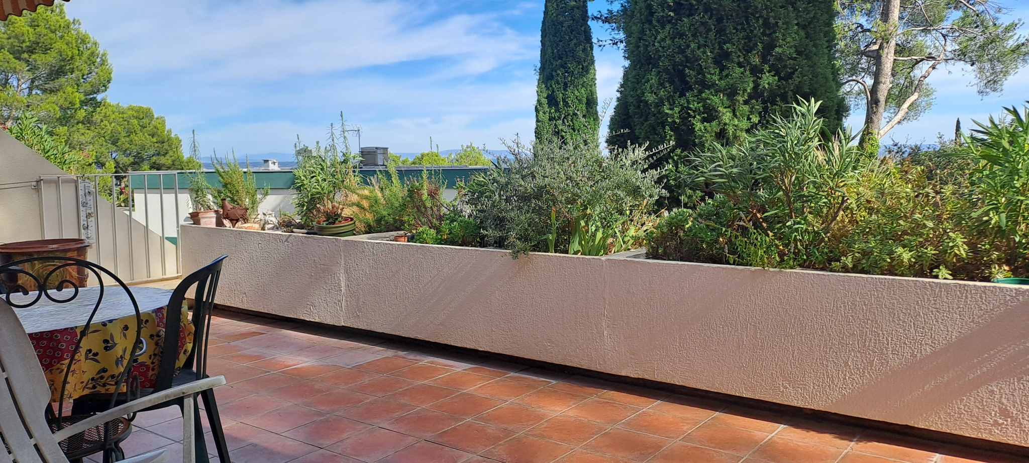 F4 résidence Les Terrasses sous les Pins, avec grande terrasse et parking privatif. Potentiel exceptionnel après travaux.