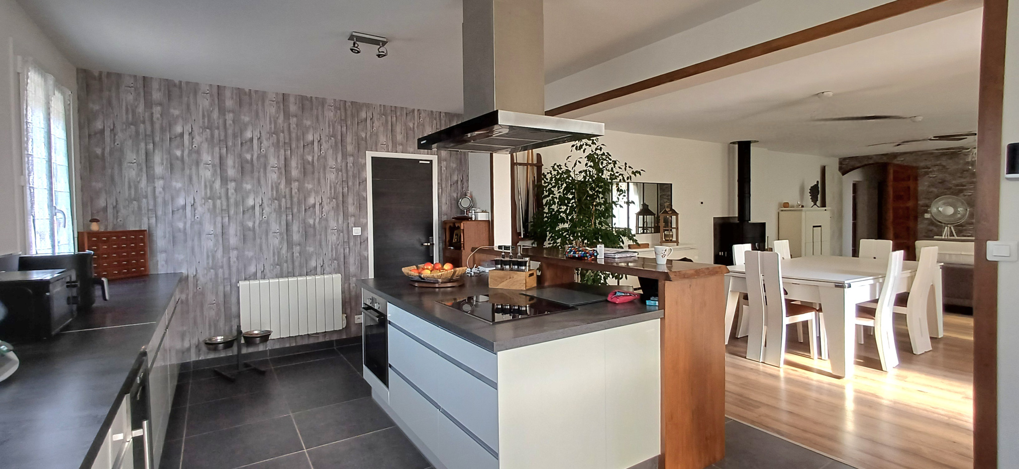 Ce bien se compose d'un vaste salon/ séjour de 53m2 avec un poêle à bois et sa cuisine ouverte de 25 m2. Vous disposez d'un accès direct à la terrasse