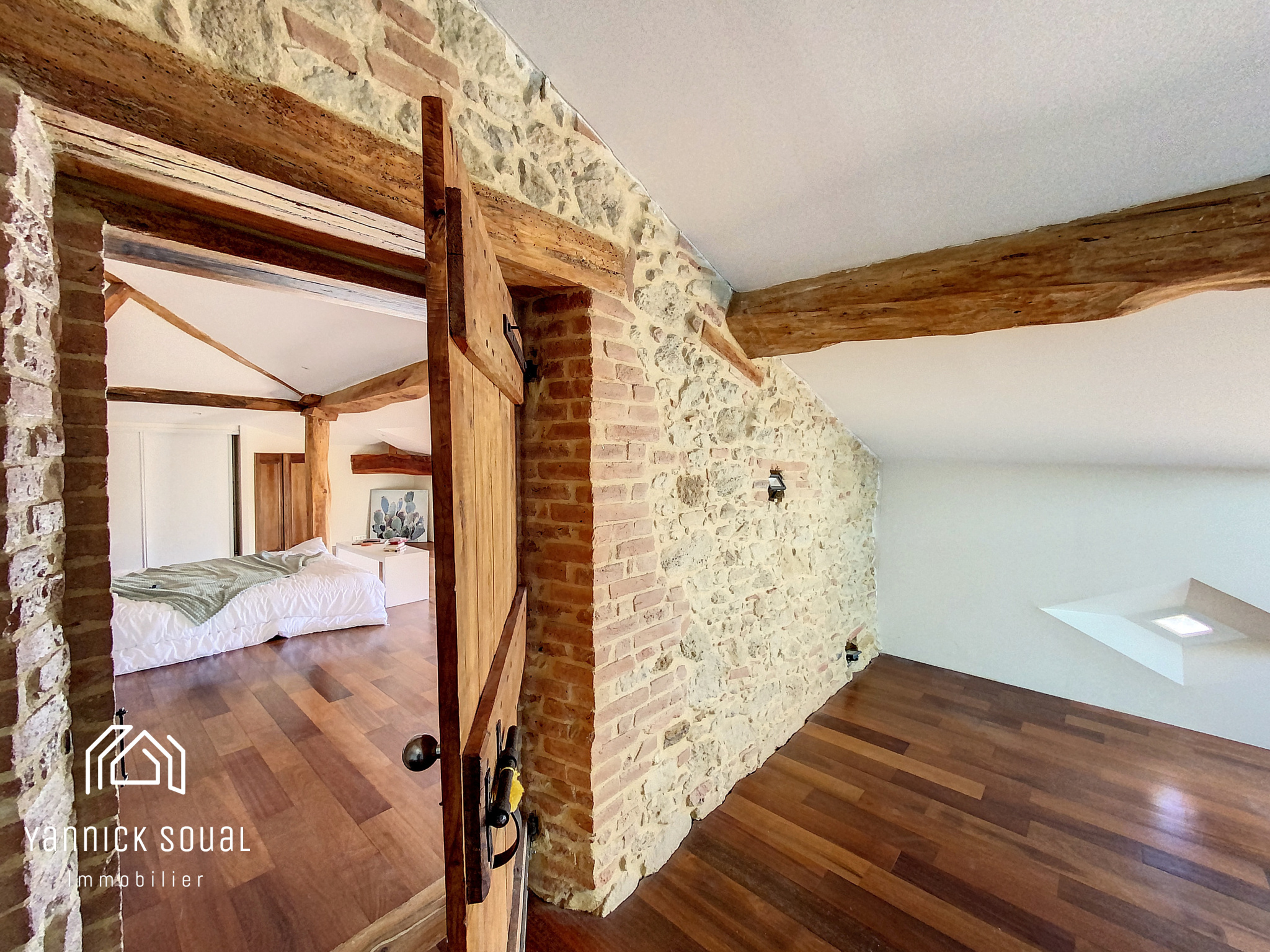 Niveau rez de jardin/piscine/terrasse : nous sommes immédiatement séduit par l'agencement en enfilade de pièces à vivre lumineuses avec cuisine séparée, séjour/salle à manger suivi d'un salon/TV avec cheminée. La pièce de vie s'ouvre sur une terrasse monumentale en sols "travertin" qui assurent le pourtour du bassin, sécurisé à l'aide d'un rideau immergé, sous les yeux d'un vieux pigeonnier en pierre de taille. Le niveau offre 3 chambres spacieuses (12m²/17m² et 18m²), dont l'accès par le couloir traversant offre un cachet indéfinissable. Une salle d'eau ainsi qu'un WC séparé sont à disposition.