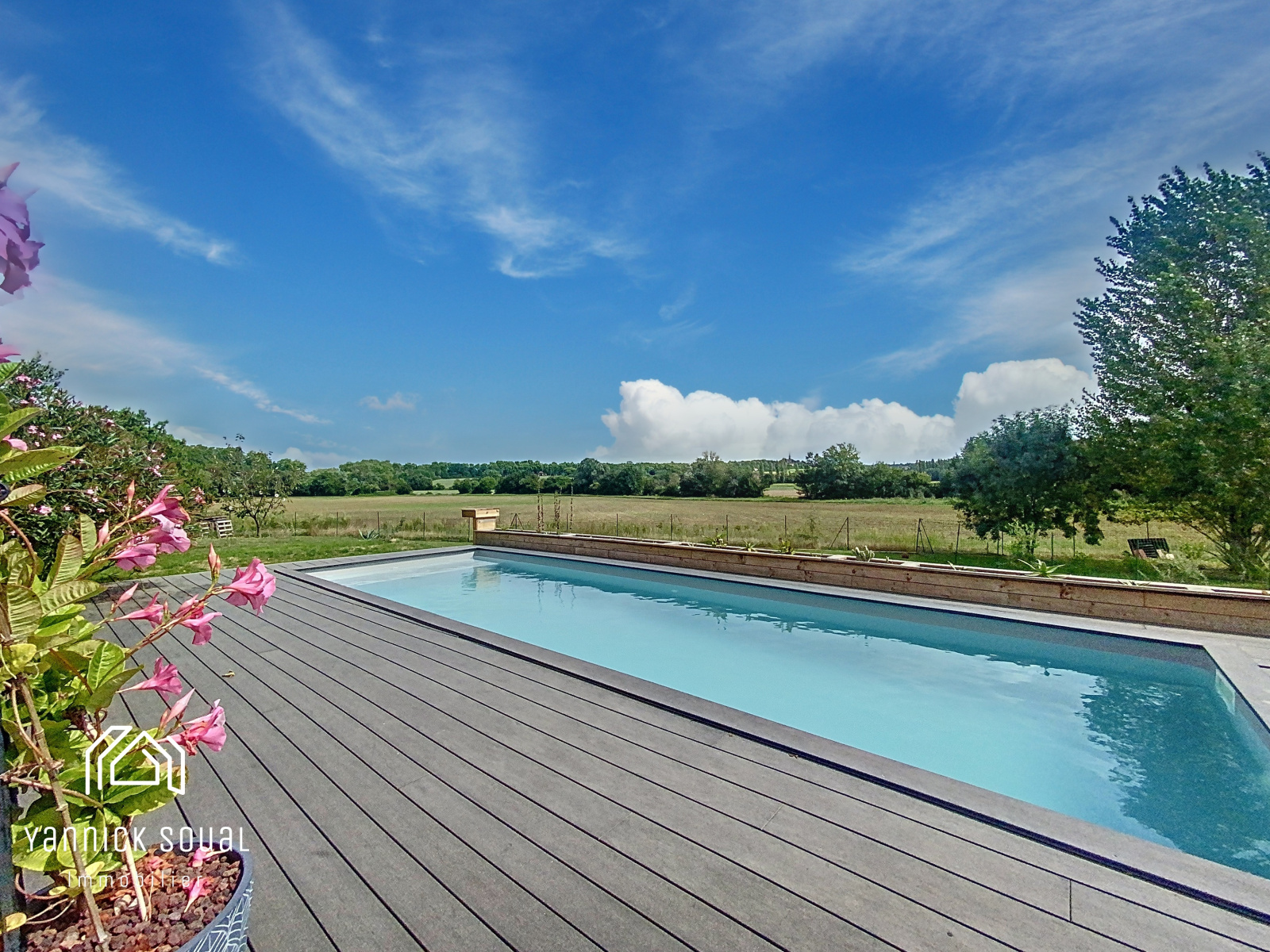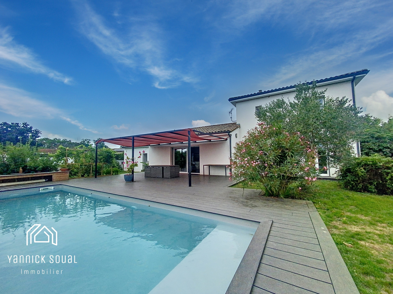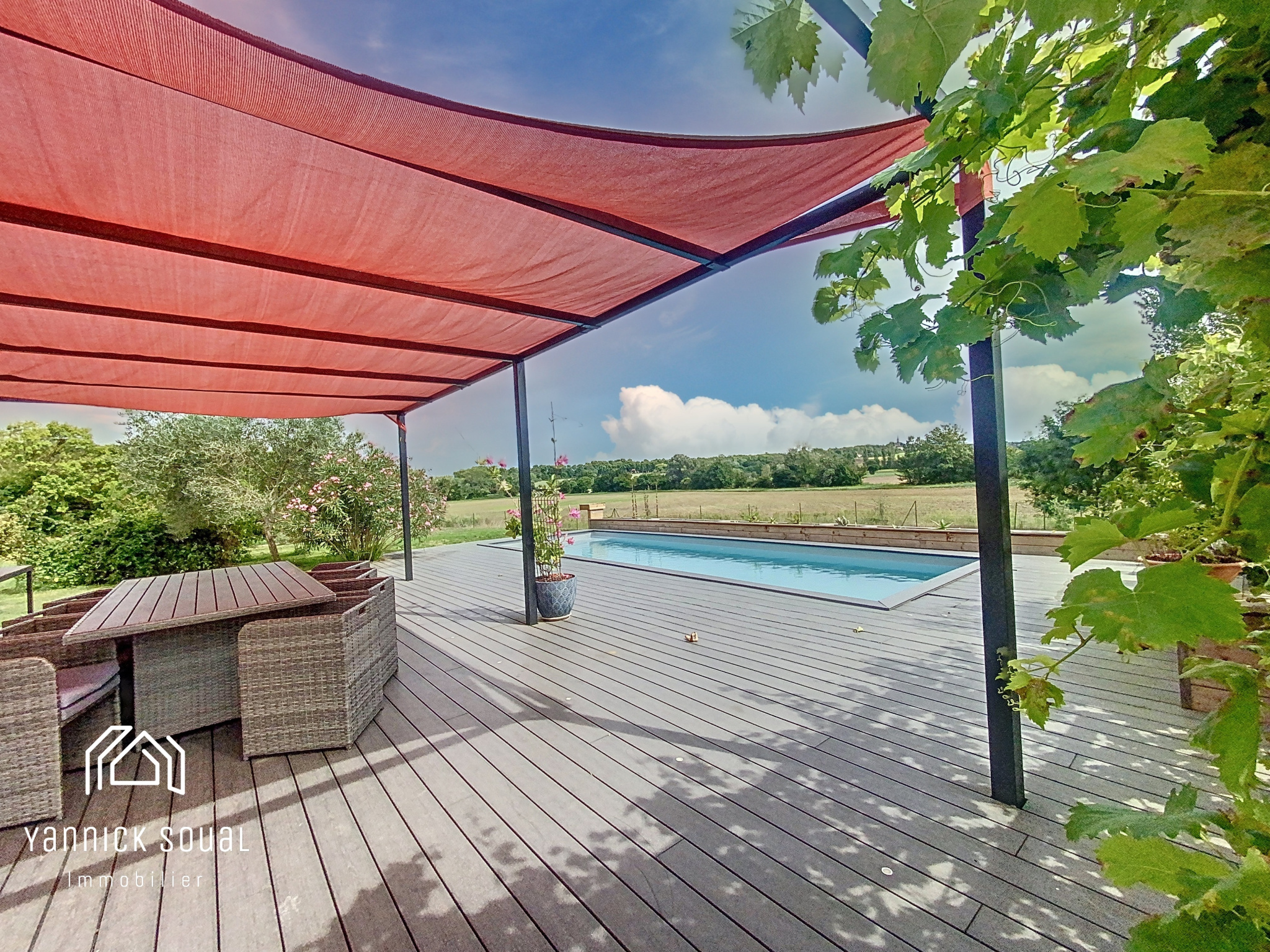 Côté "pièce extérieure", accessible depuis le séjour, une terrrasse "cosy" parfaitement orientée et à l'abri des regards vous dirige vers la piscine 9x3 sécurisée. Cet espace laisse supposer une vie "dedans/dehors" où se mêle zenitude et plénitude.