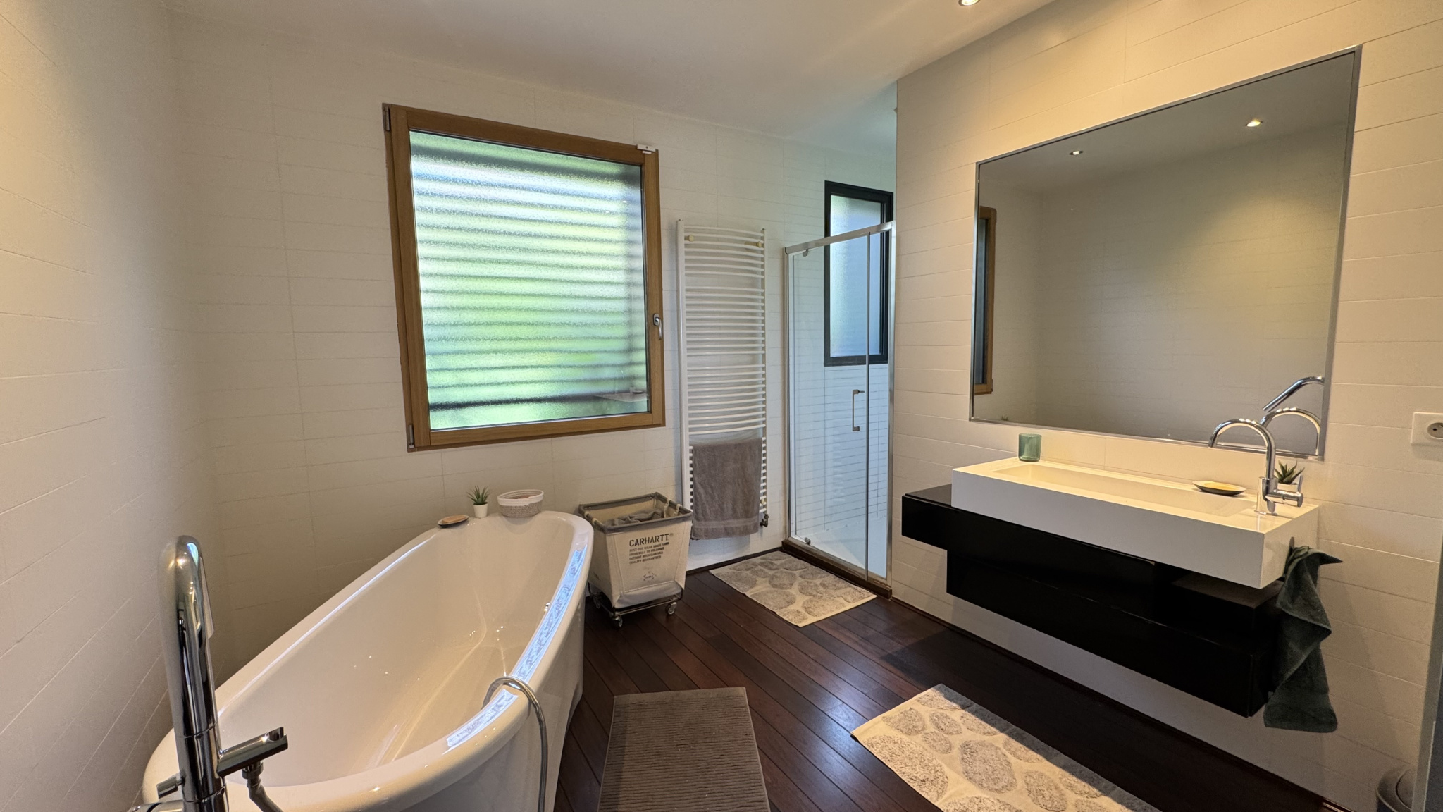 L’espace nuit du niveau principal comprend trois chambres ainsi qu’une salle de bain aux finitions soignées, équipée d’une baignoire îlot et d’une douche.