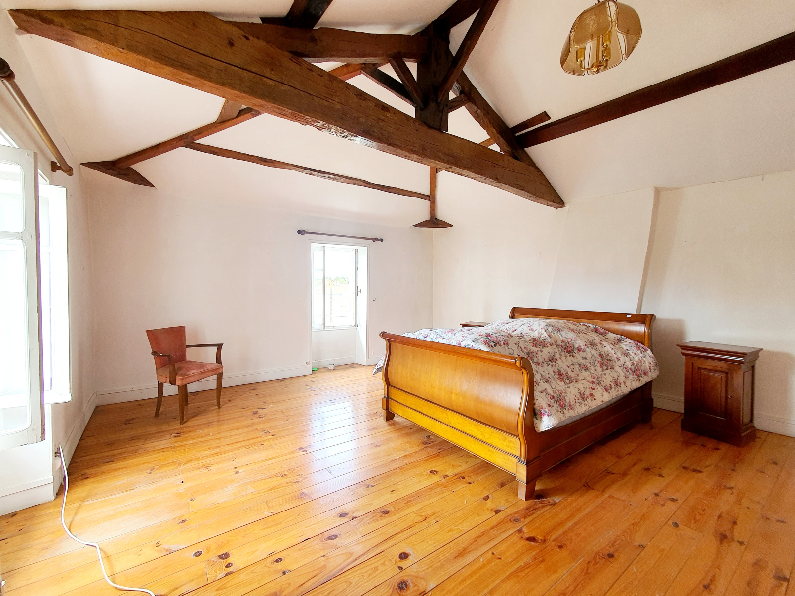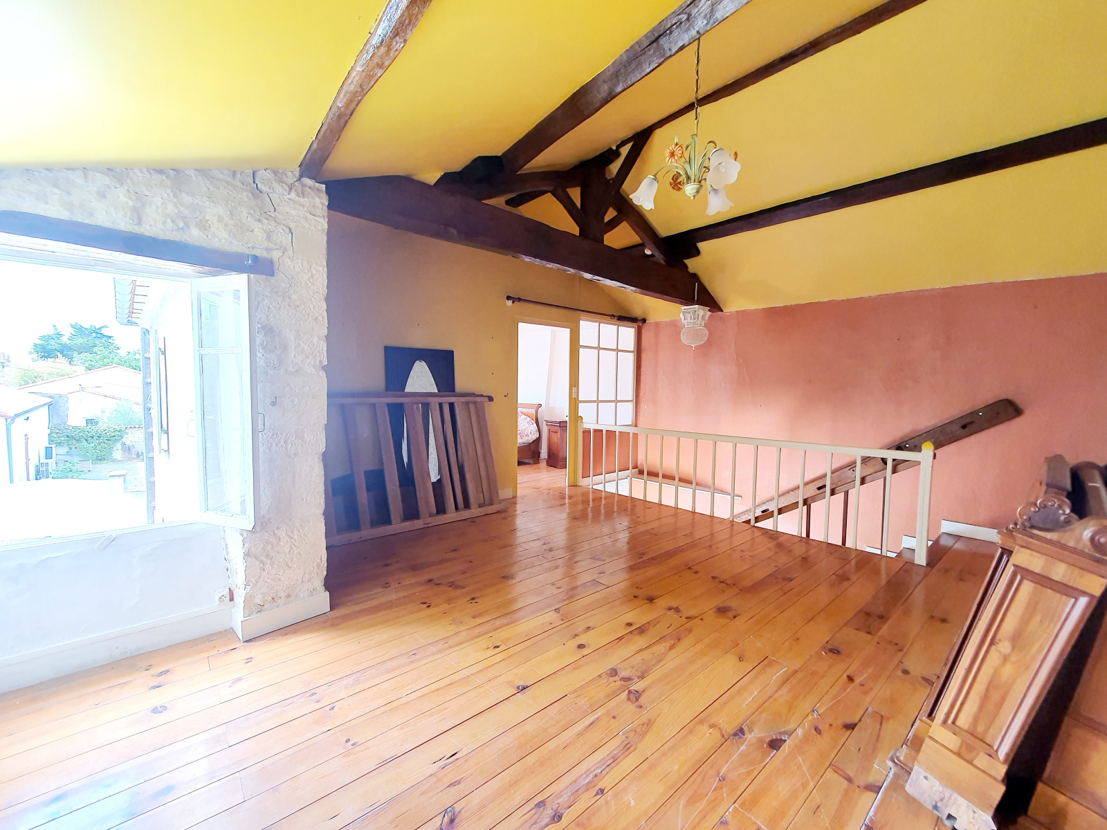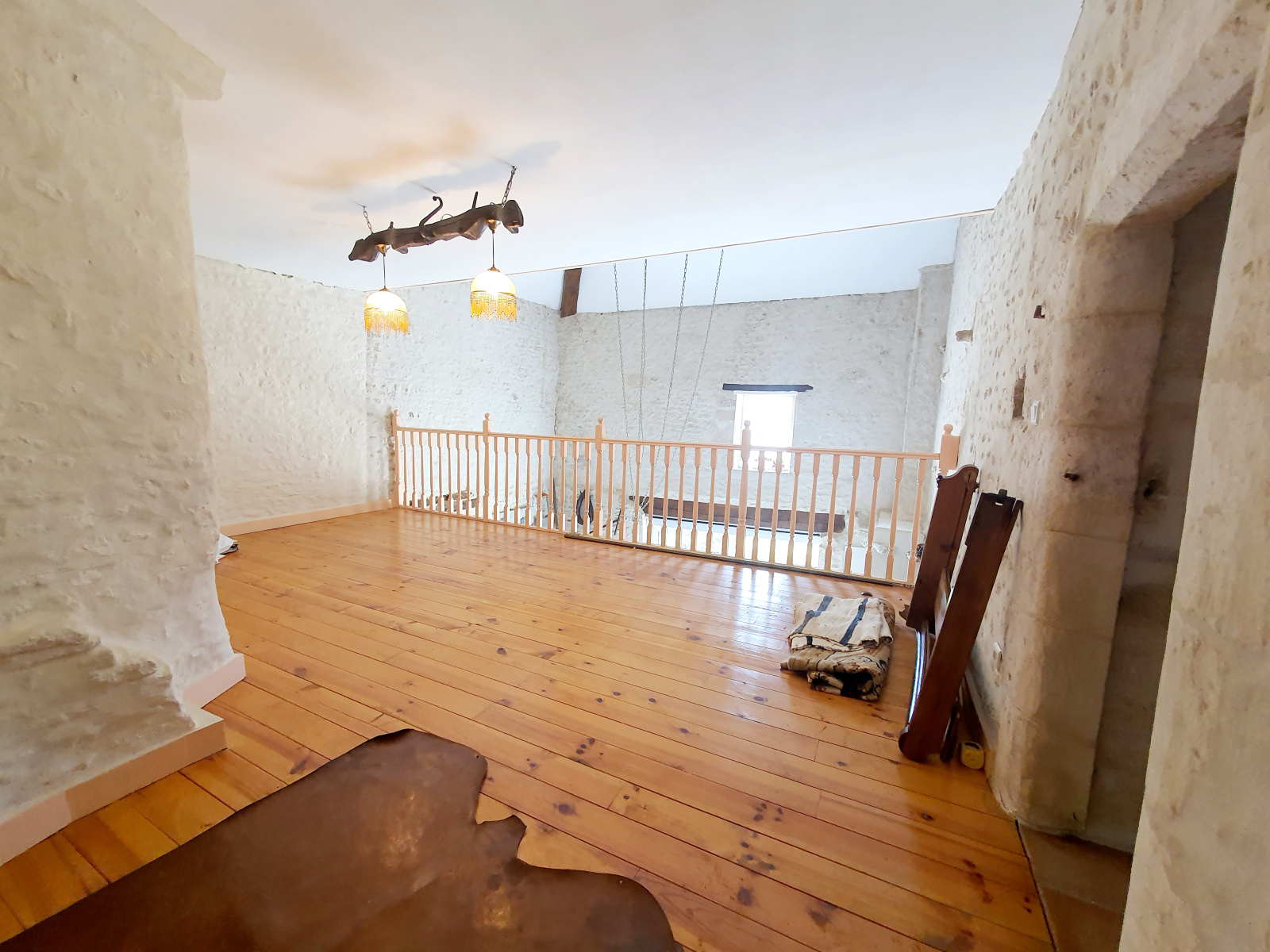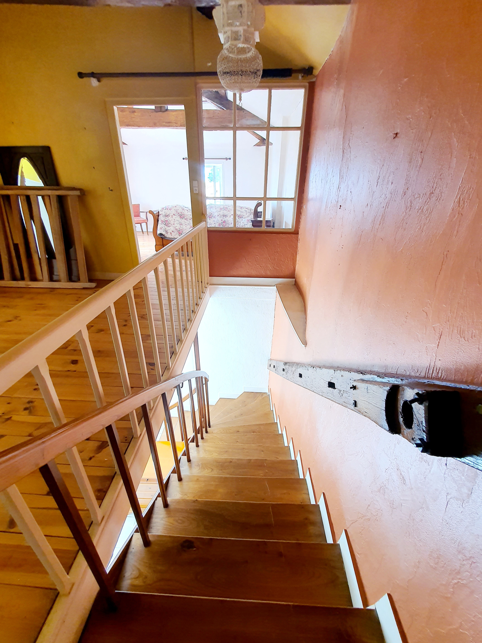 Au premier étage se trouvent une chambre de 23m² avec parquet, un grand palier pouvant servir de chambre, une mezzanine d'environ 20m² et une grande salle de bain avec WC.