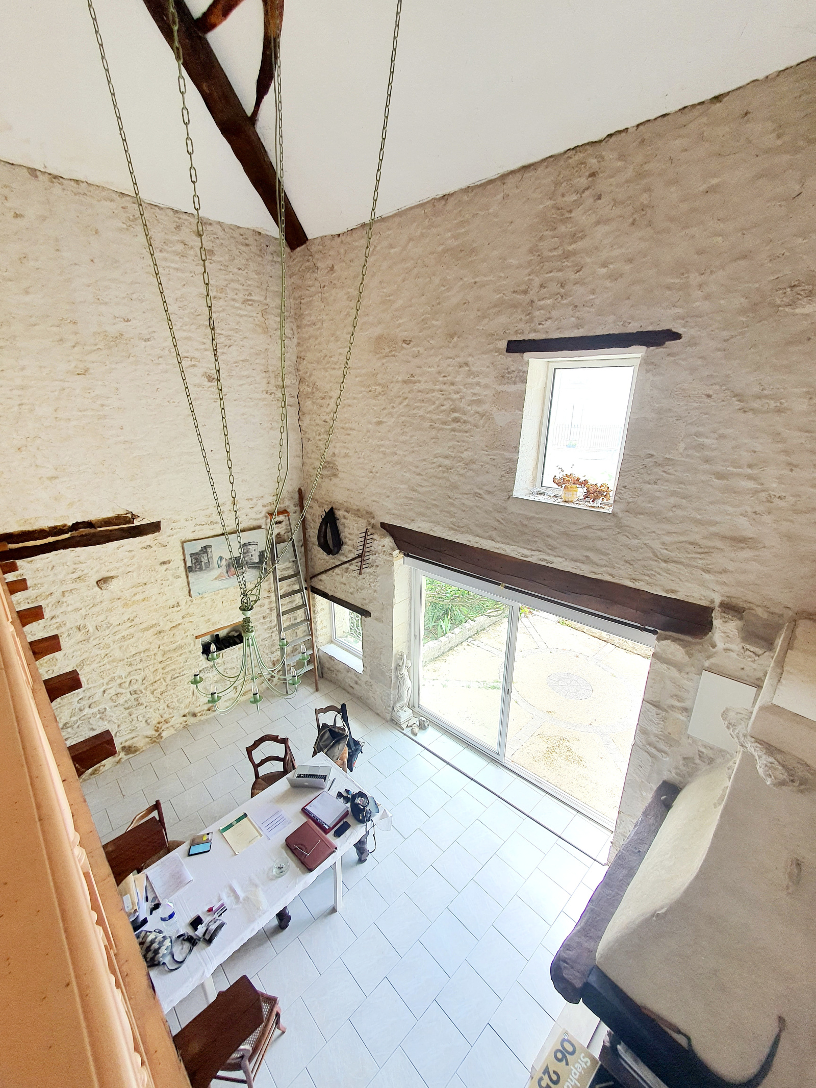 Elle se compose au rdc d'un grand salon séjour de plus de 40 m² avec cheminée et mezzanine, d'une lumineuse cuisine semi équipée, d'une grande chambre avec cheminée et d'une salle d'eau avec WC.
