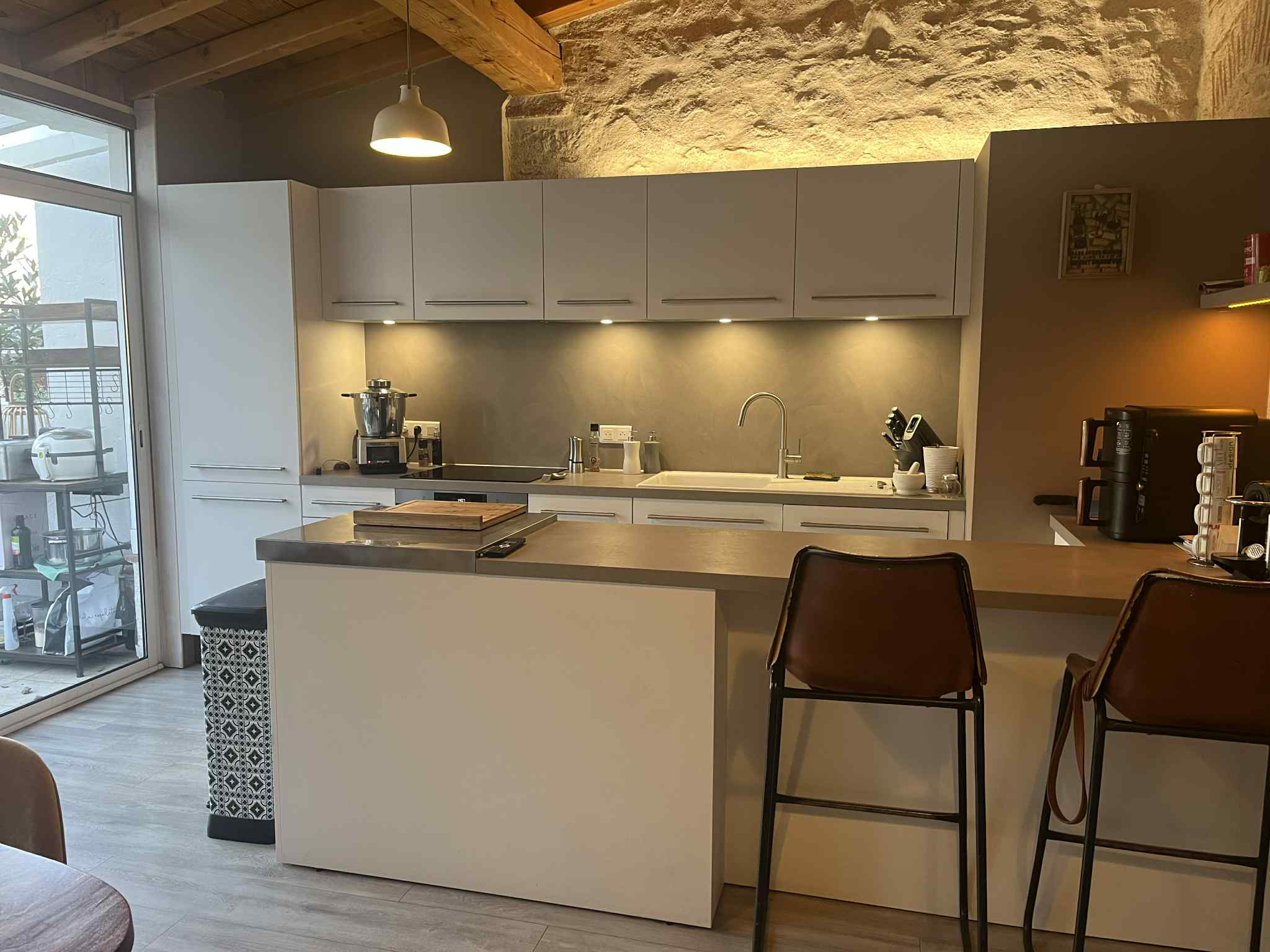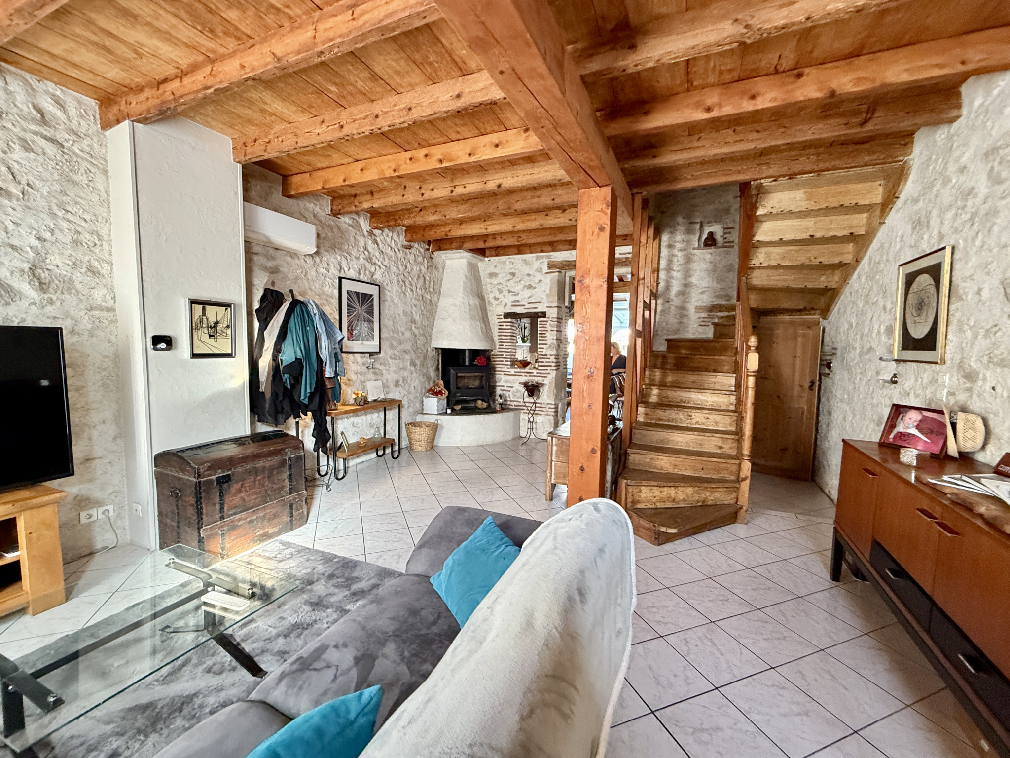 Dès l’entrée, vous découvrez une très belle pièce de vie de plus de 55 m², comprenant salon, salle à manger et cuisine, offrant un espace de vie spacieux et convivial. Le salon met en valeur de superbes murs en pierre apparente et est agrémenté d’un poêle à bois pour une atmosphère cosy. La cuisine moderne, récente, aménagée et équipée, propose également un espace repas. Entièrement ouverte sur l’extérieur grâce à de larges baies vitrées, elle donne accès à une terrasse et à un jardin, idéal pour profiter des beaux jours. Un WC indépendant complète ce niveau.