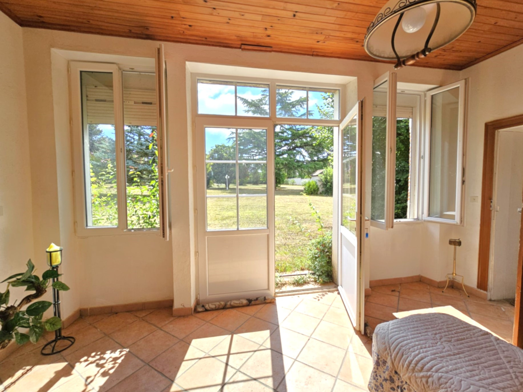 cheminée à foyer ouvert 3 larges doubles portes fenêtres + volets roulants motorisés + volets battants alu laqués
